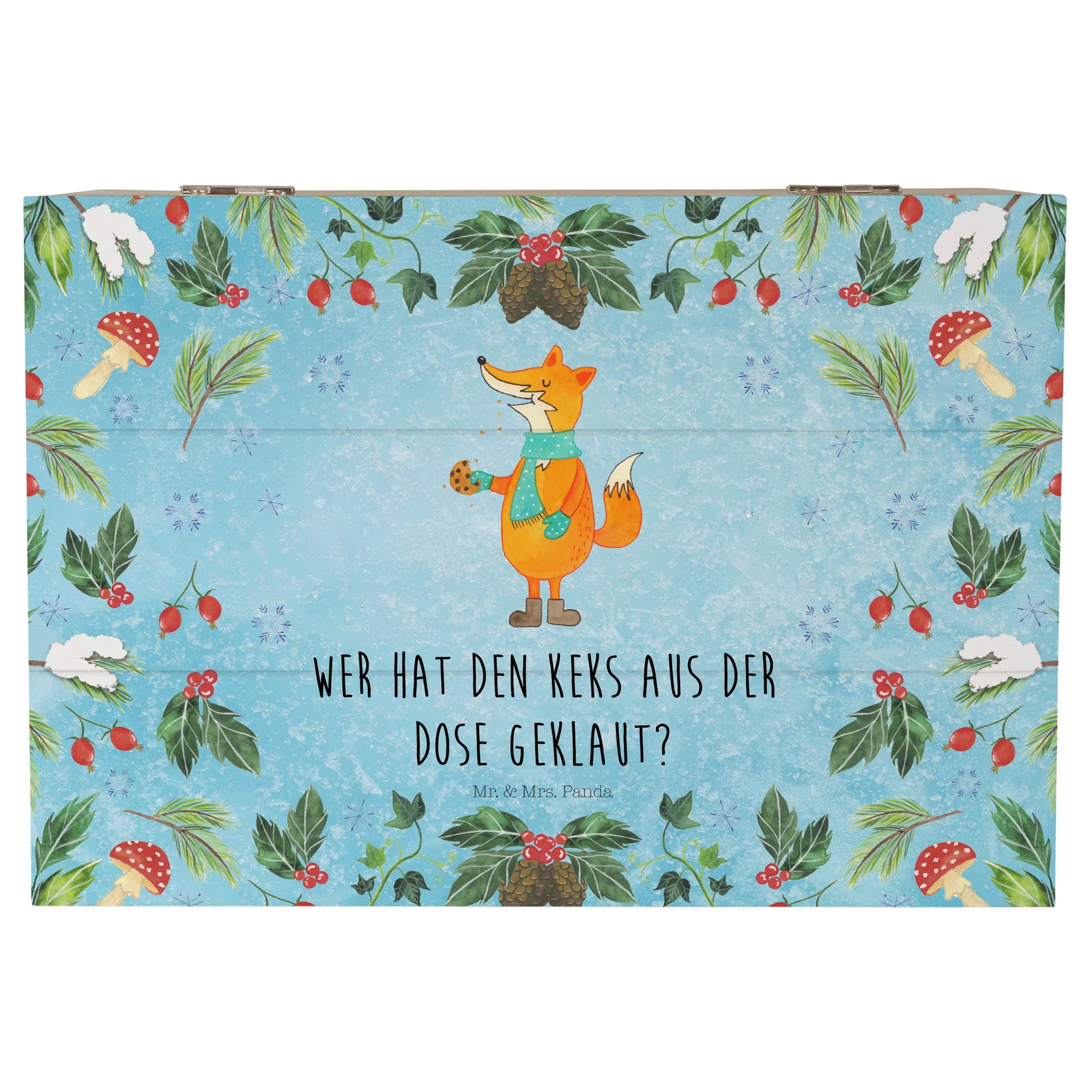 Juhuu – die schönste Zeit im Jahr beginnt! Unsere Holzkiste „Fuchs Keksdose" aus der Winter Kollektion von Mr. & Mrs. Panda ist mehr als nur eine Aufbewahrungsbox: Sie ist eine kleine Schatzkiste voller Wärme, Nostalgie und weihnachtlichem Charme. Auf dem eisblauen Hintergrund siehst du einen fröhlichen Fuchs mit türkisfarbenem Punkteschal, passenden Handschuhen und braunen Stiefeln. In seiner rechten Hand hält er einen halb gegessenen Keks – und dazu steht der liebevolle Spruch: „Wer hat den Keks aus der Dose geklaut?" 🎄🍪