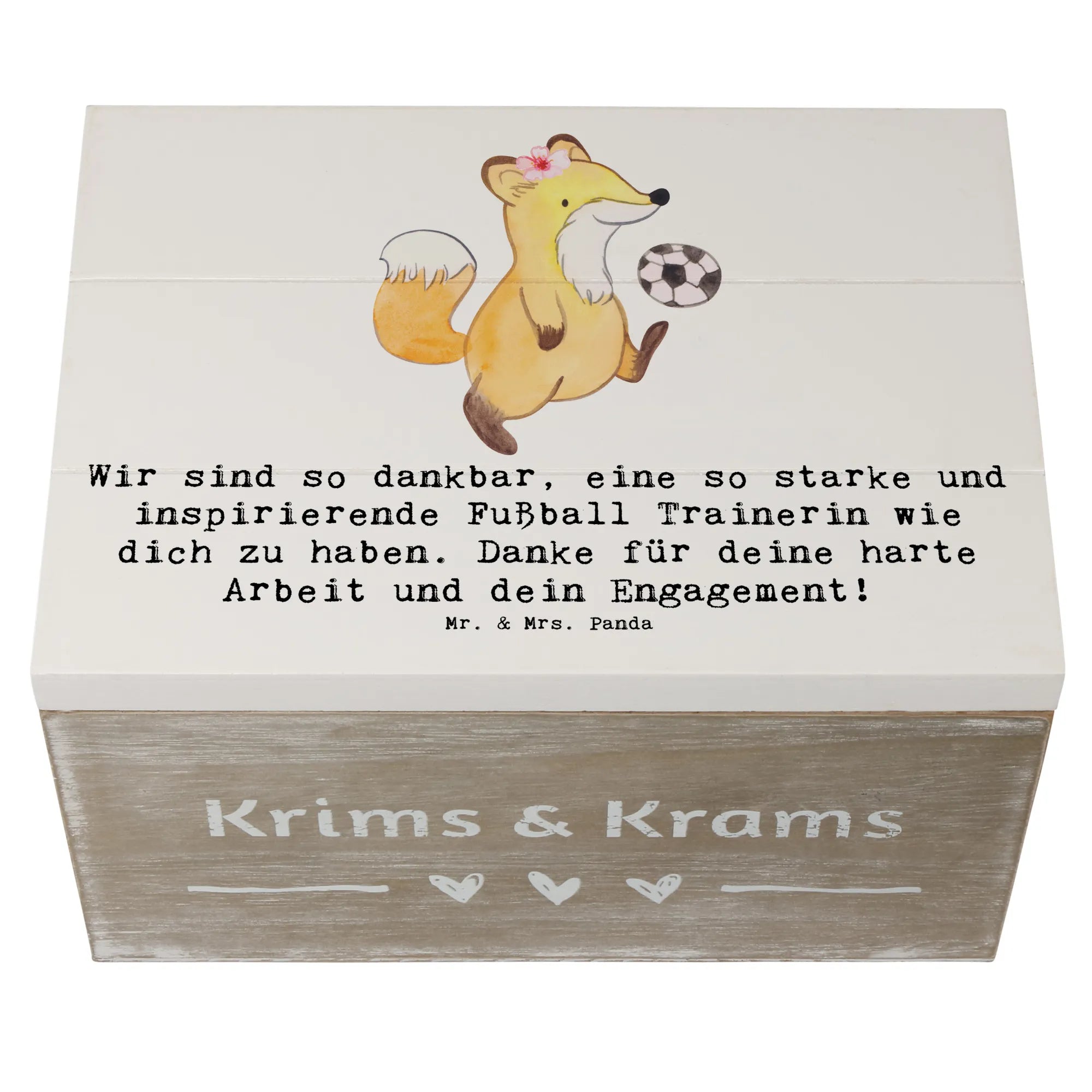 Die wunderschöne Holzkiste von Mr. & Mrs. Panda ist das perfekte Geschenk für jede Fußball Trainerin, die sich um ihre Mannschaft kümmert und hart für deren Erfolg arbeitet. Mit dem liebevoll gestalteten Motiv der Fußball Trainerin und dem herzlichen Slogan "Wir sind so dankbar, eine so starke und inspirierende Fußball Trainerin wie dich zu haben. Danke für deine harte Arbeit und dein Engagement!" bringt diese Kiste ein Lächeln auf jedes Gesicht.