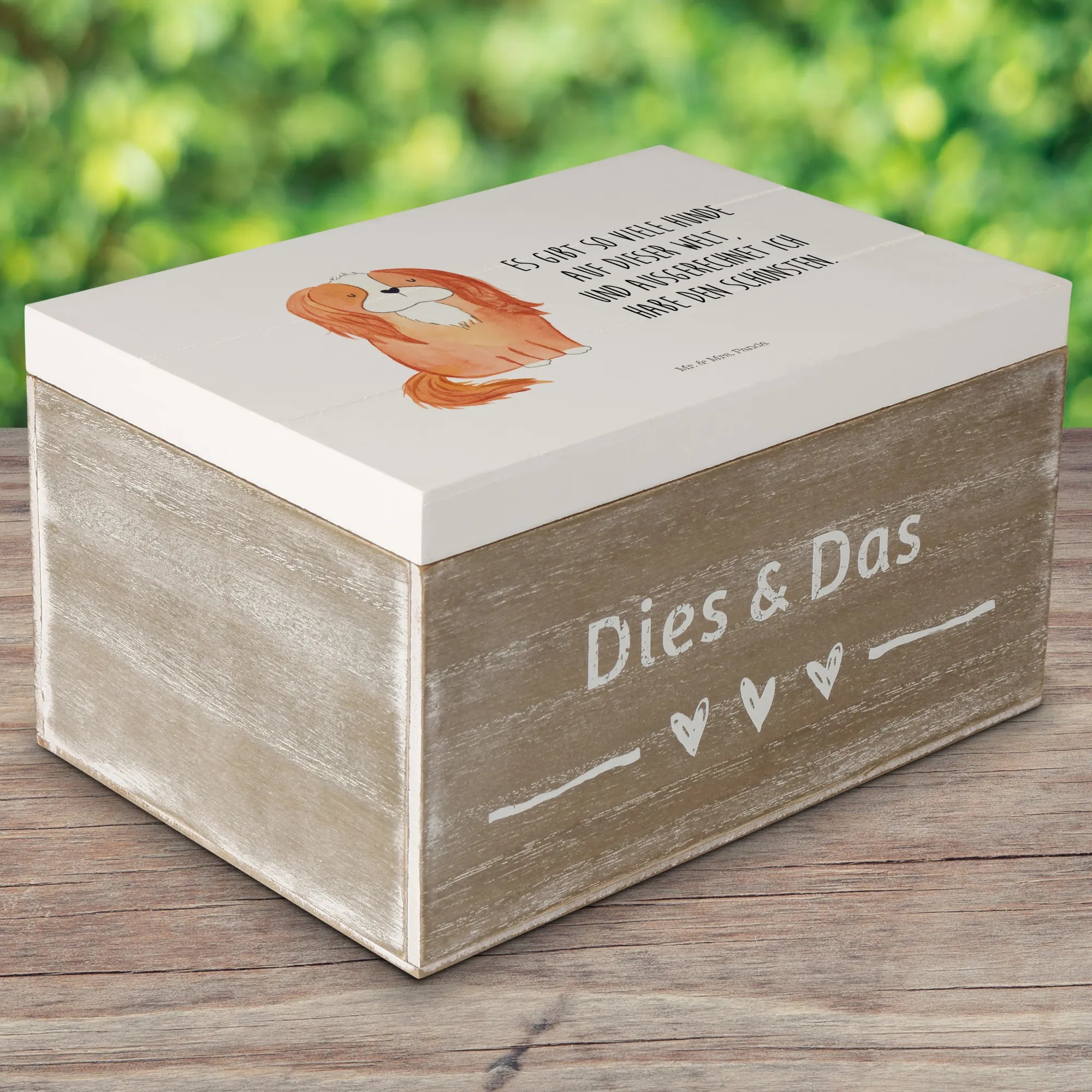 Die wunderschöne Holzkiste von Mr. & Mrs. Panda mit dem süßen Motiv des Cavalier King Charles Spaniel ist das perfekte Geschenk für jeden Hundeliebhaber. Diese liebevoll gestaltete Kiste ist nicht nur ein echter Blickfang, sondern auch äußerst praktisch.
