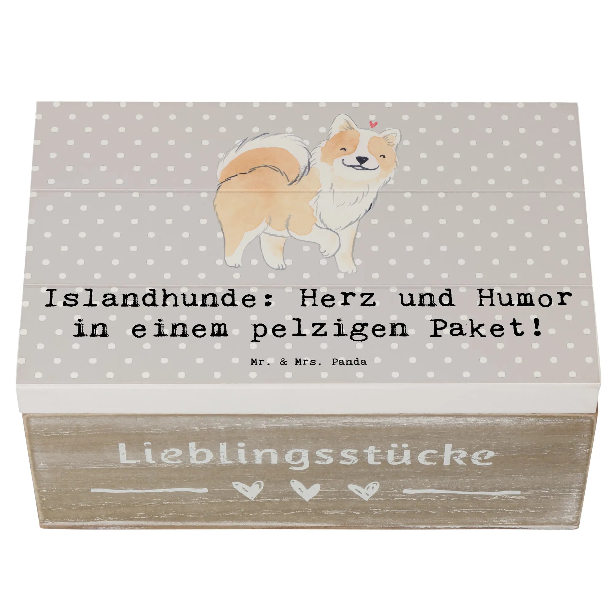 Die wunderschöne Holzkiste mit dem Motiv "Islandhund" aus der besonderen Kollektion der Hunderassen von Mr. & Mrs. Panda ist das perfekte Geschenk für jeden Hundefan und alle, die das Besondere lieben!
