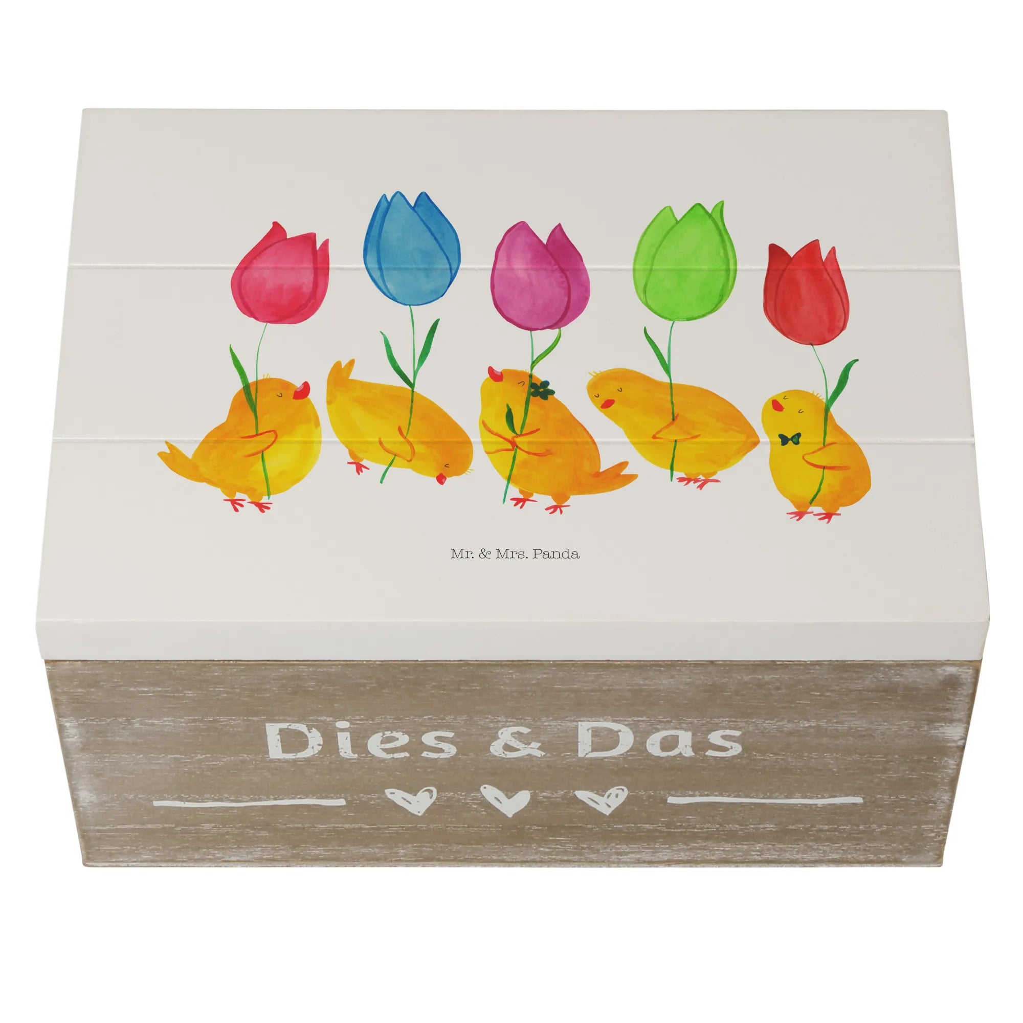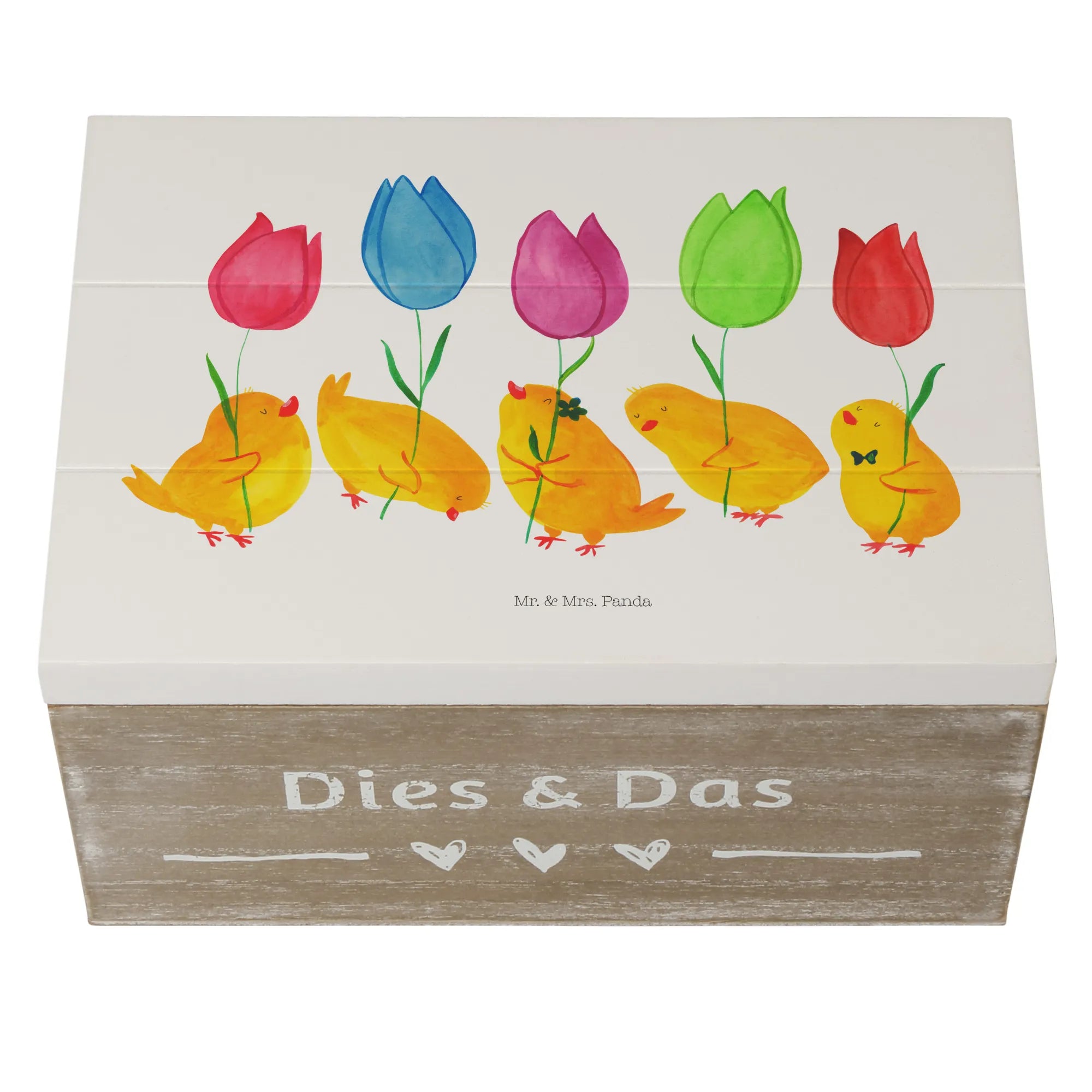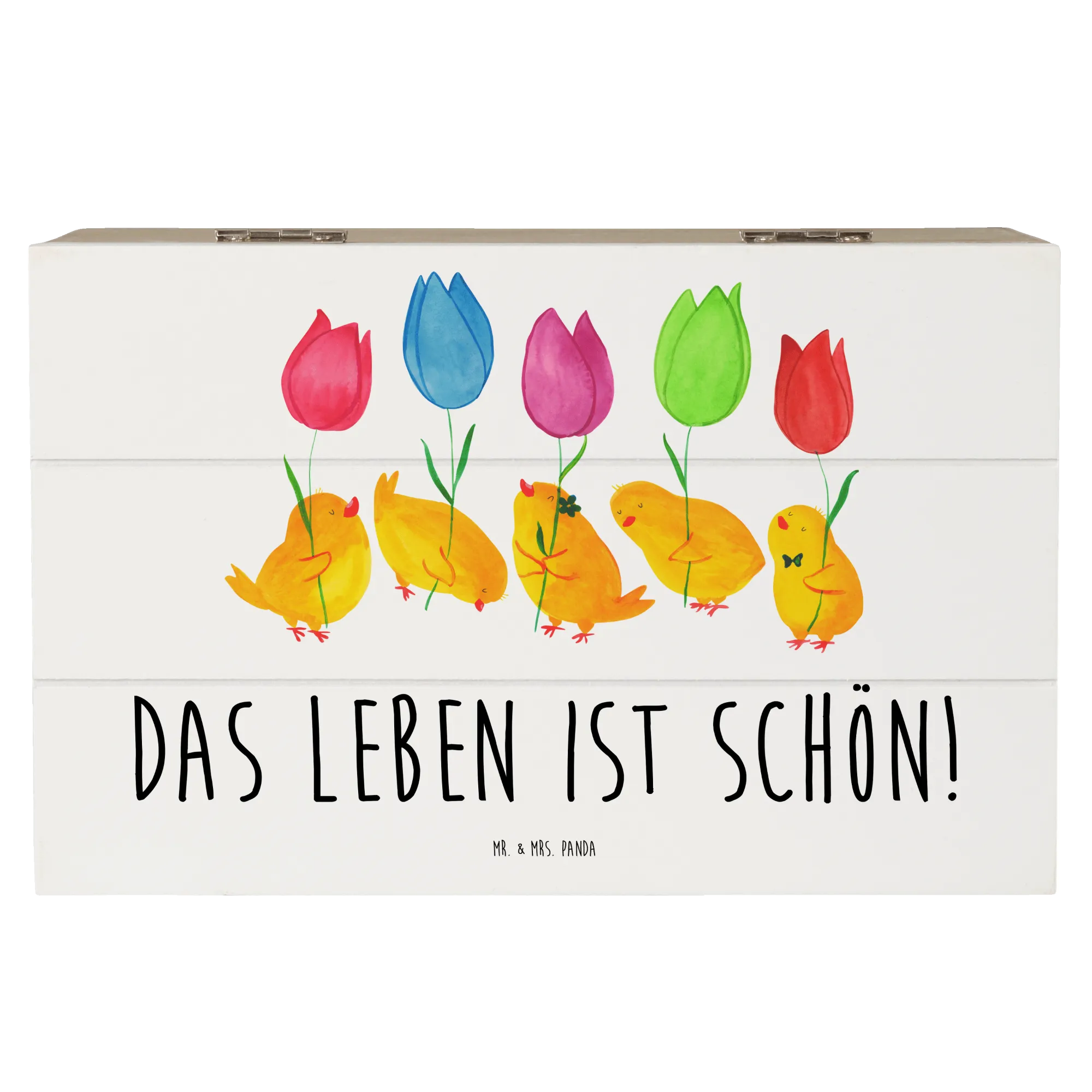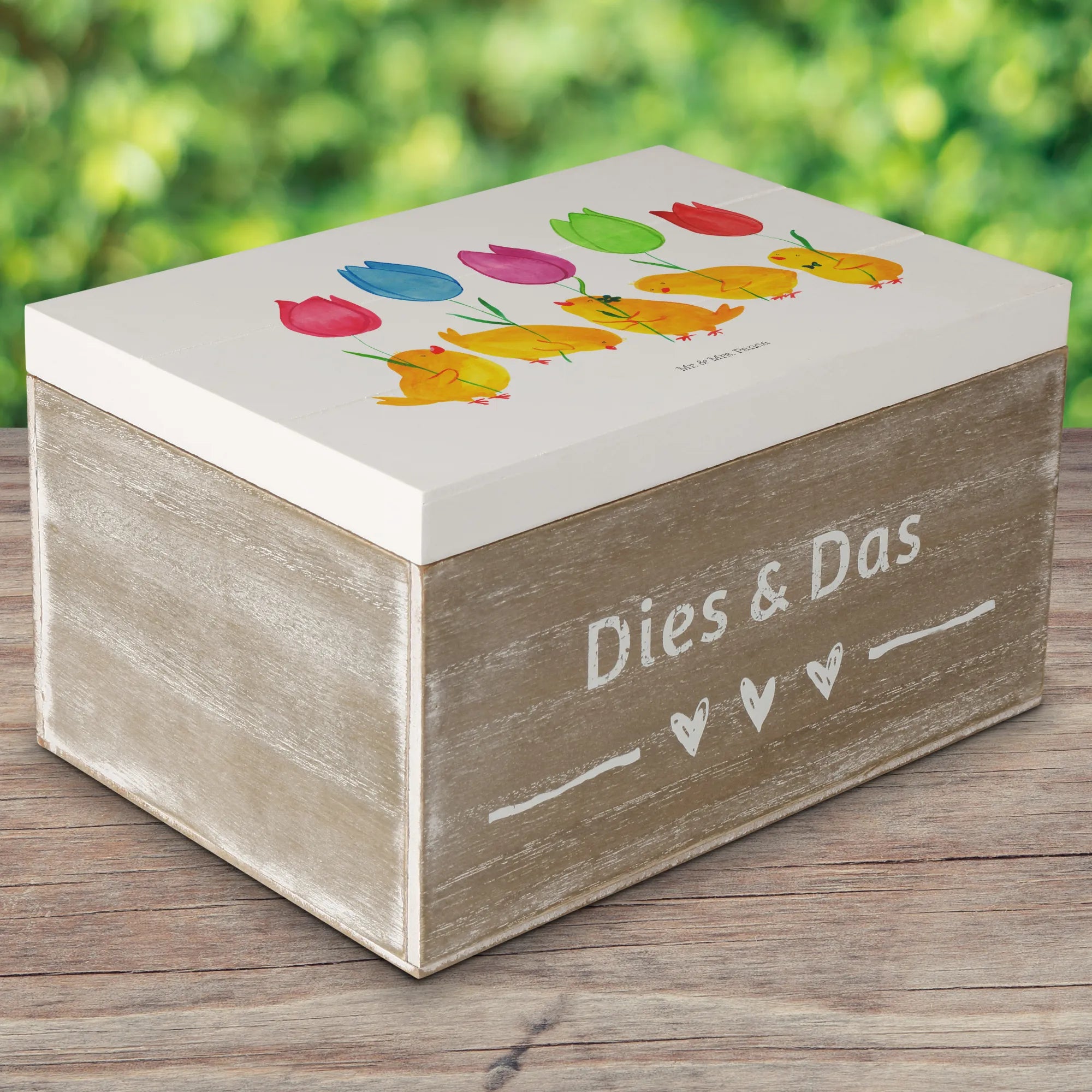Die Holzkiste aus der Ostern - Kollektion von Mr. & Mrs. Panda bringt den Frühling in dein Zuhause. Das liebevoll illustrierte Motiv zeigt viele kleine Küken mit bunten Tulpen und zaubert sofort ein Lächeln auf dein Gesicht. Das zarte Aquarelldesign von Mrs. Panda verleiht der Holzbox einen besonderen, handgemachten Charme.