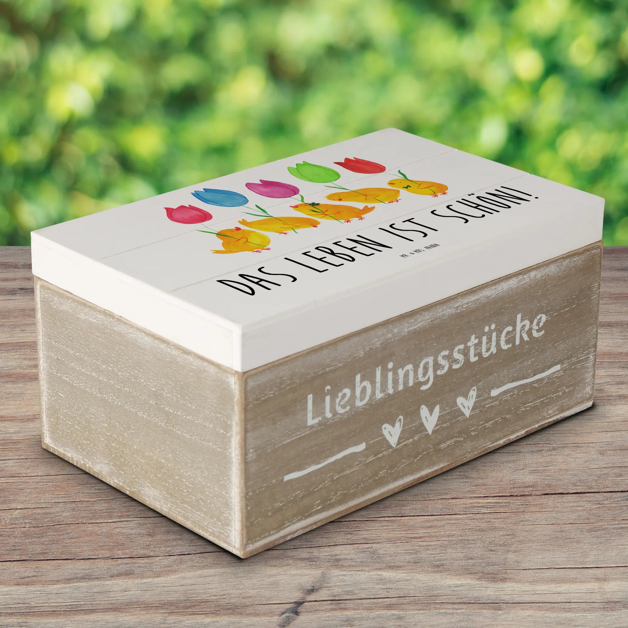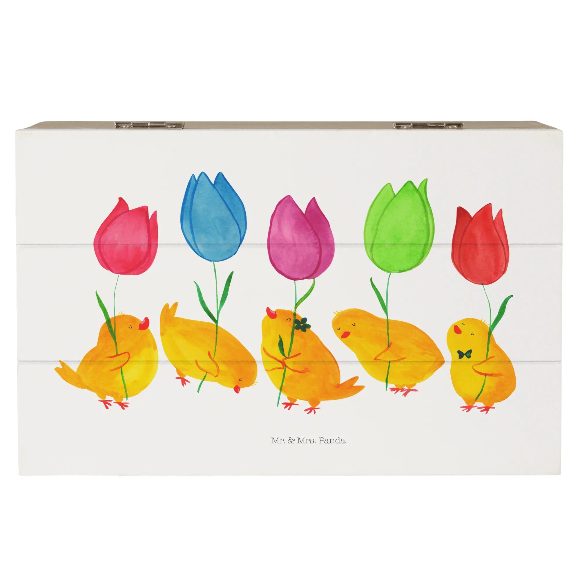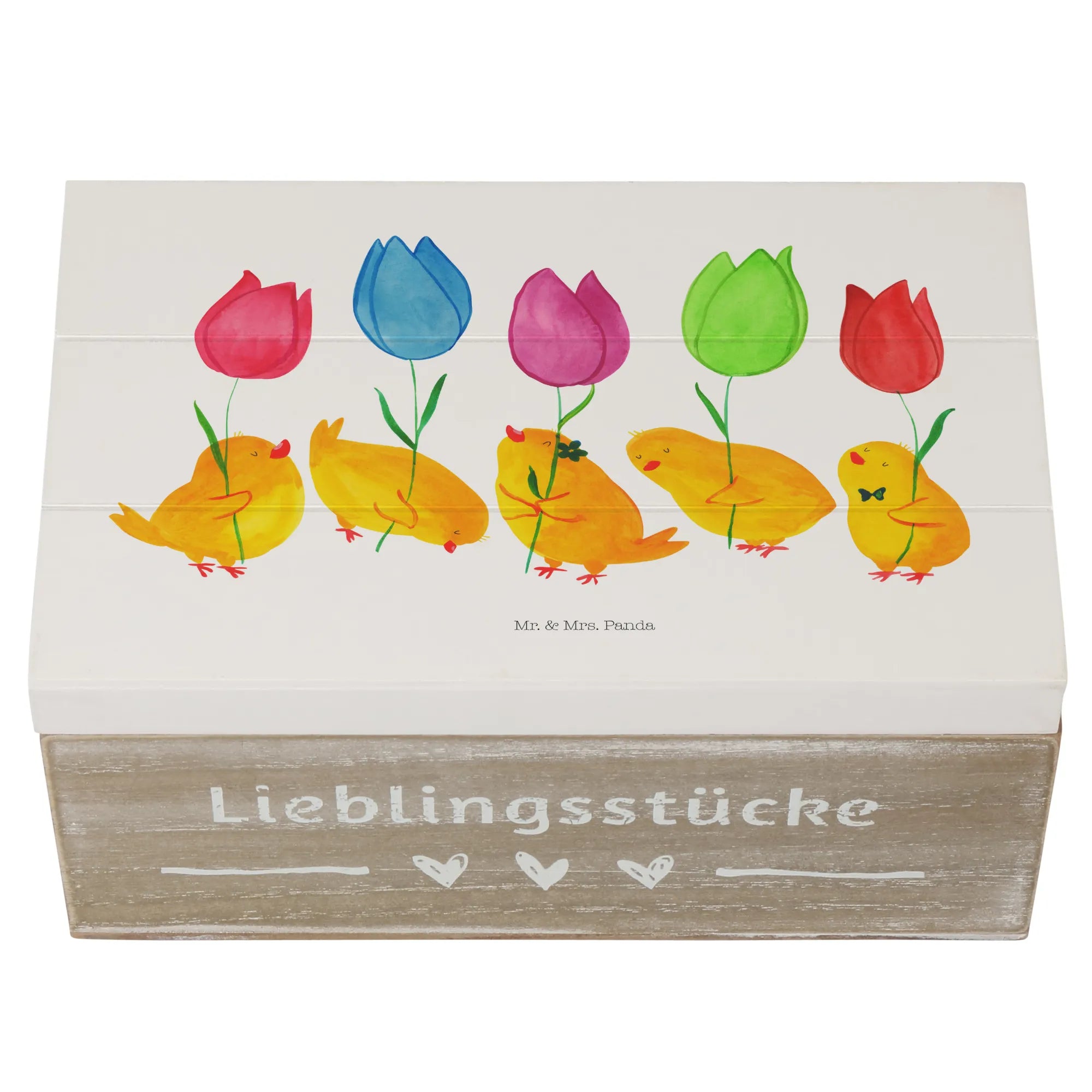 Die Holzkiste aus der Ostern - Kollektion von Mr. & Mrs. Panda bringt den Frühling in dein Zuhause. Das liebevoll illustrierte Motiv zeigt viele kleine Küken mit bunten Tulpen und zaubert sofort ein Lächeln auf dein Gesicht. Das zarte Aquarelldesign von Mrs. Panda verleiht der Holzbox einen besonderen, handgemachten Charme.