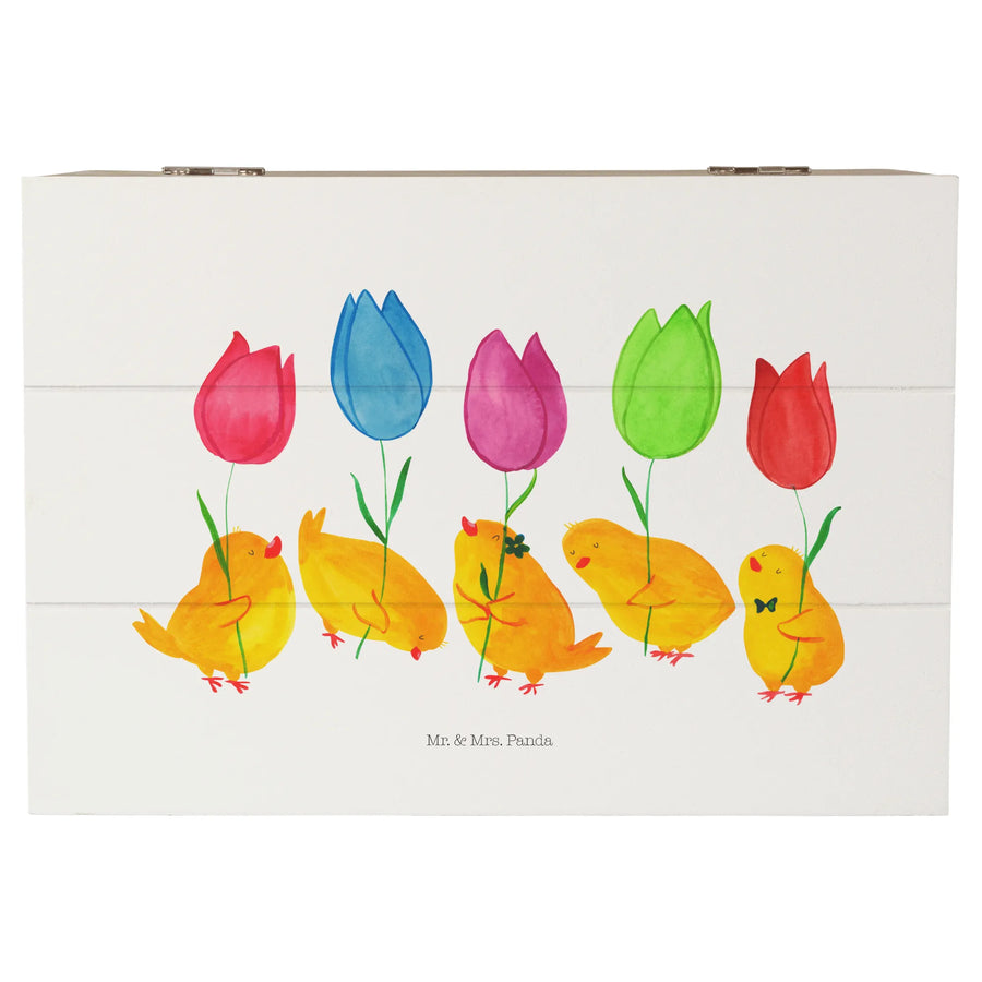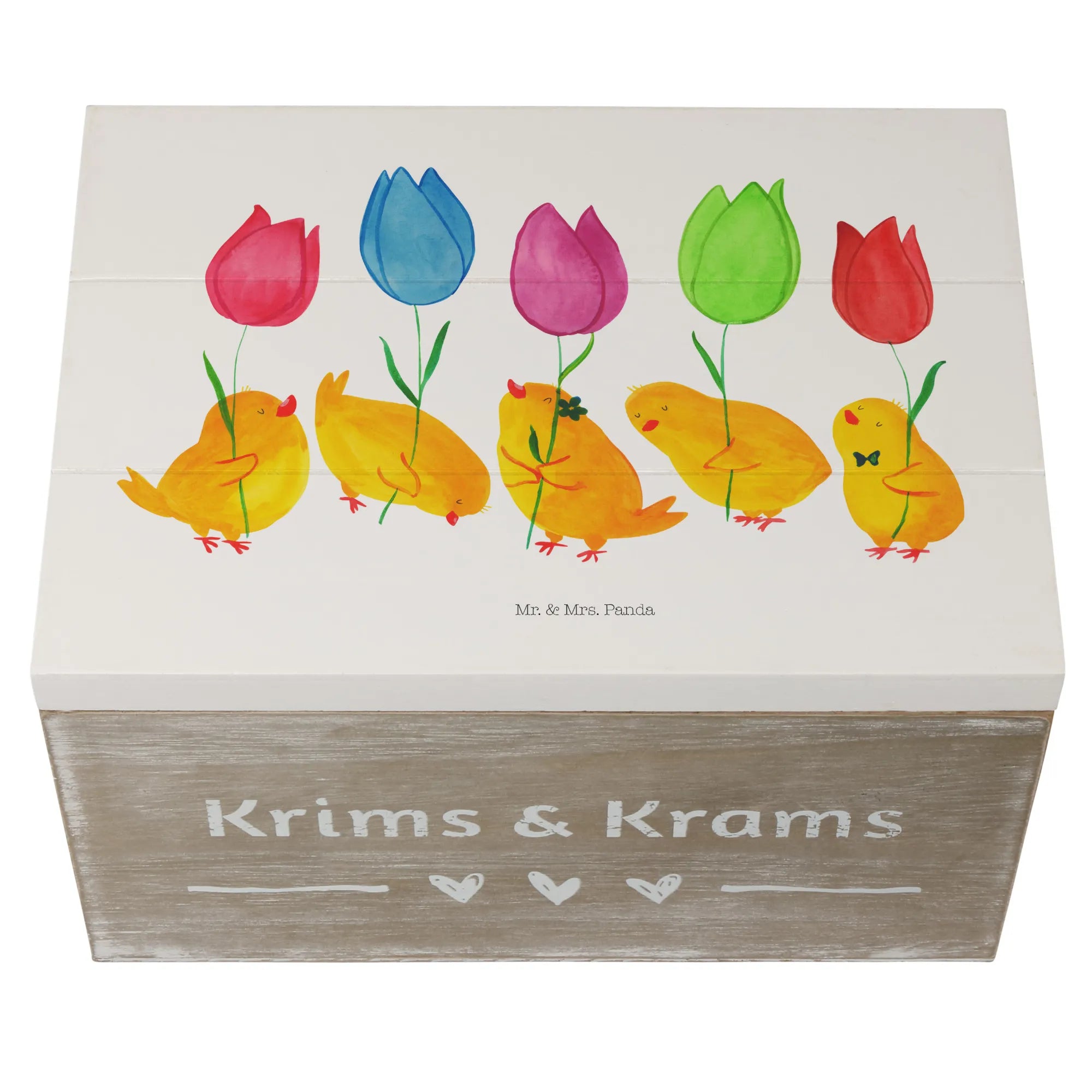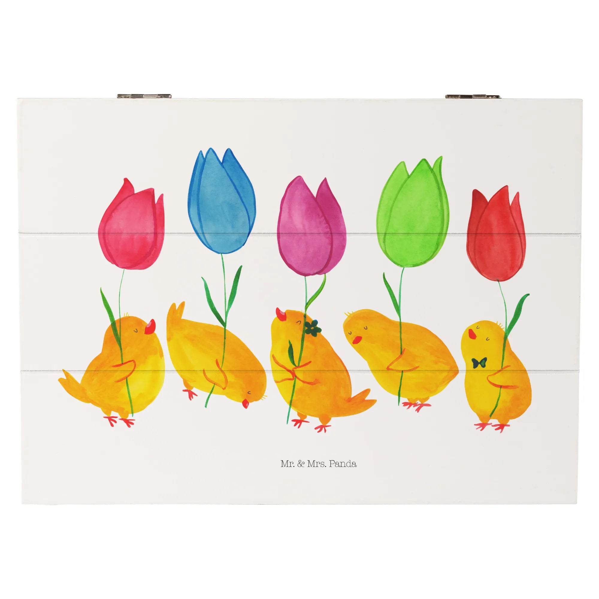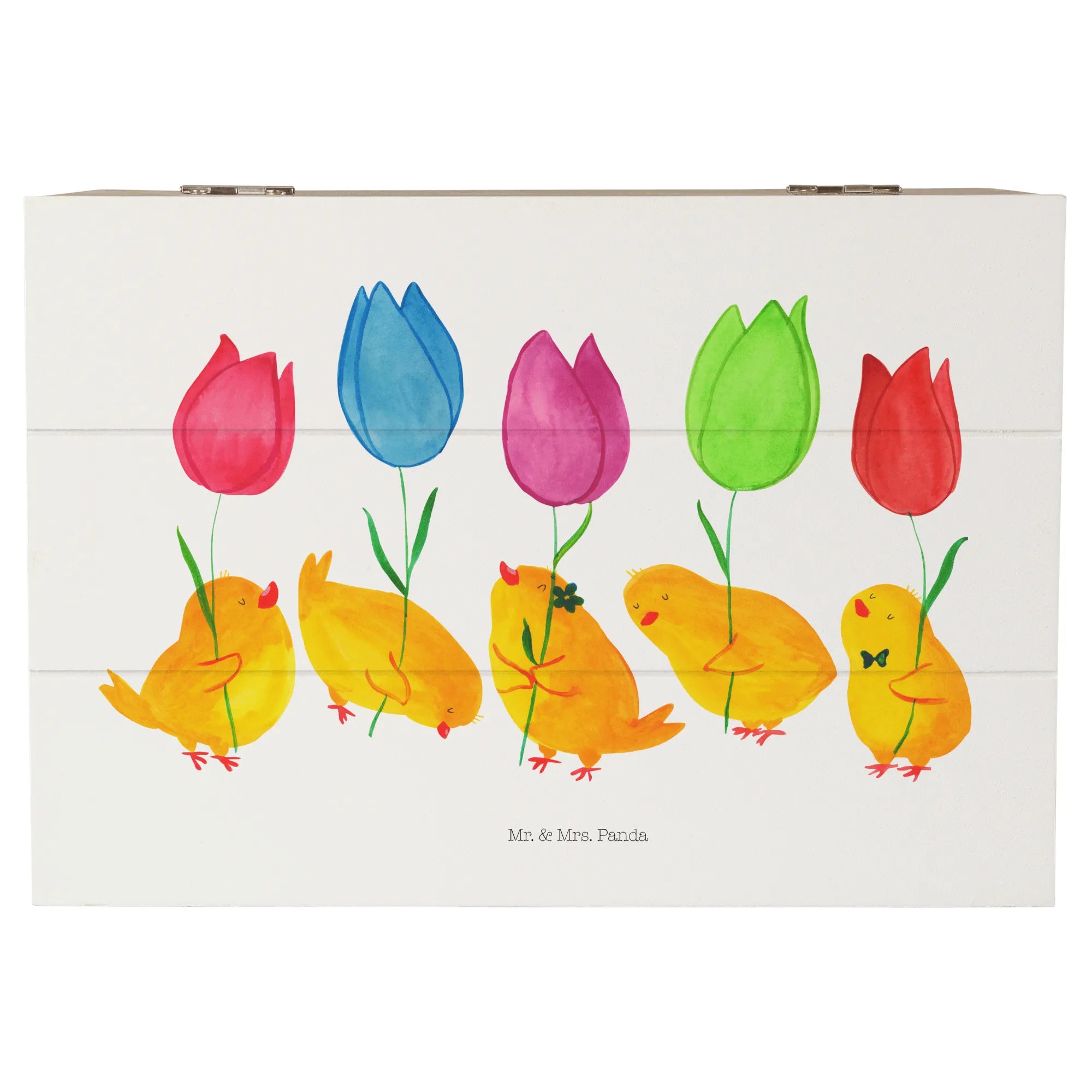 Die Holzkiste aus der Ostern - Kollektion von Mr. & Mrs. Panda bringt den Frühling in dein Zuhause. Das liebevoll illustrierte Motiv zeigt viele kleine Küken mit bunten Tulpen und zaubert sofort ein Lächeln auf dein Gesicht. Das zarte Aquarelldesign von Mrs. Panda verleiht der Holzbox einen besonderen, handgemachten Charme.