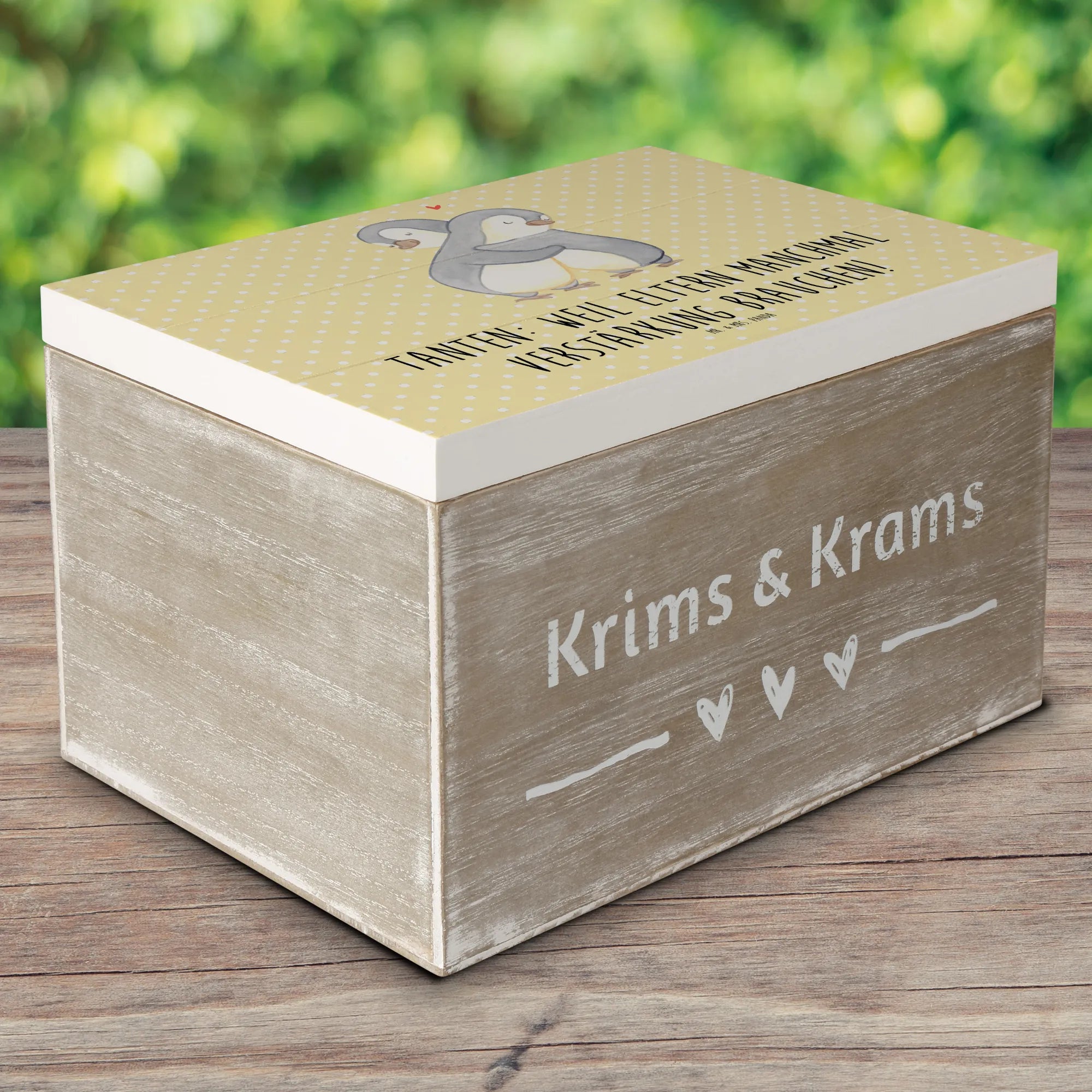 Die wunderschöne Holzkiste von Mr. & Mrs. Panda ist das perfekte Geschenk für deine Tante! Mit dem liebevollen Motiv und dem Spruch "Tanten: Weil Eltern manchmal Verstärkung brauchen!" wird diese Kiste nicht nur zum Aufbewahrungsort von besonderen Schätzen, sondern auch zu einem Symbol der Wertschätzung für all die lieben Tanten da draußen.