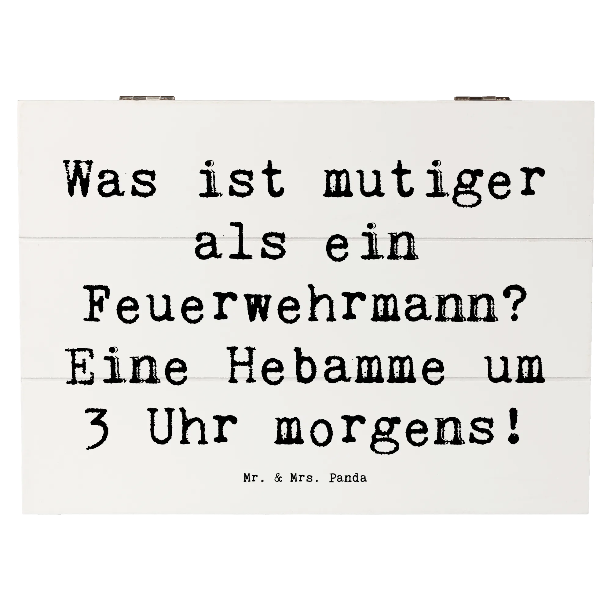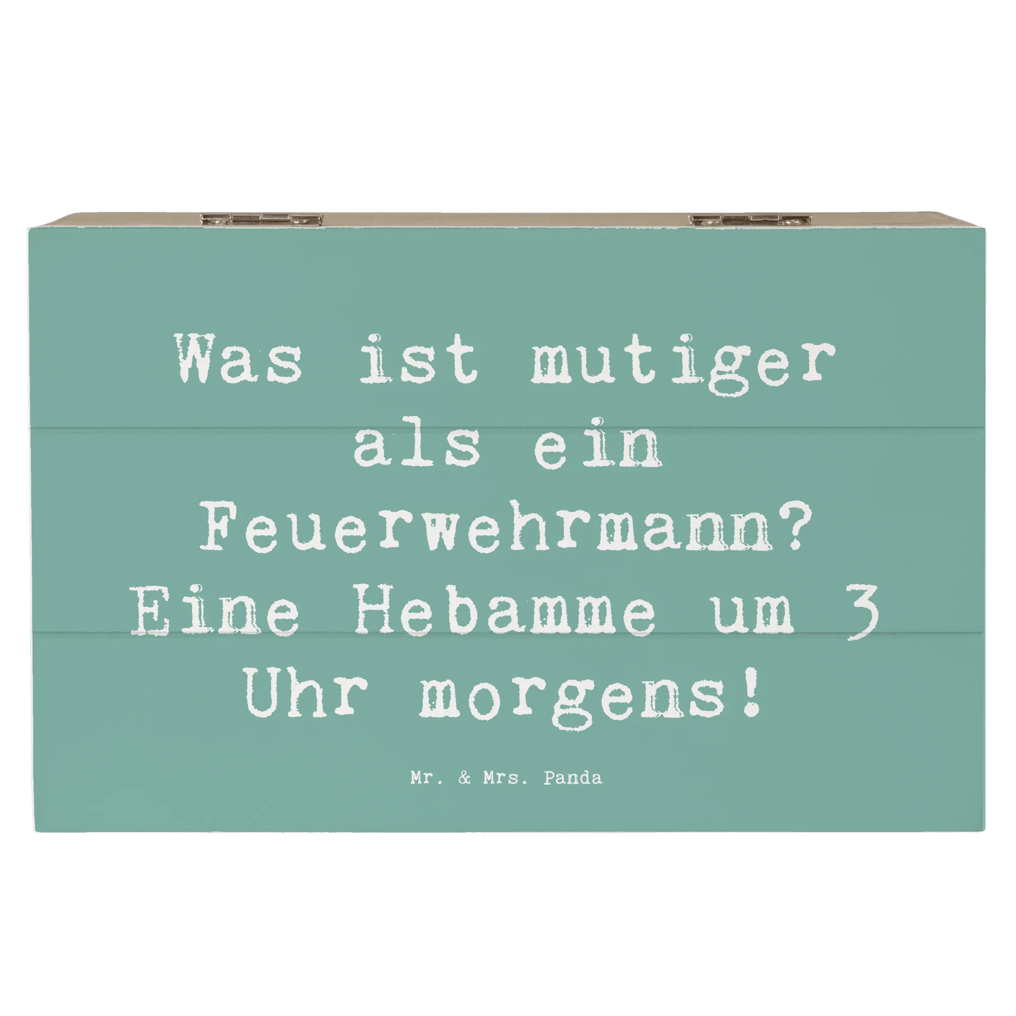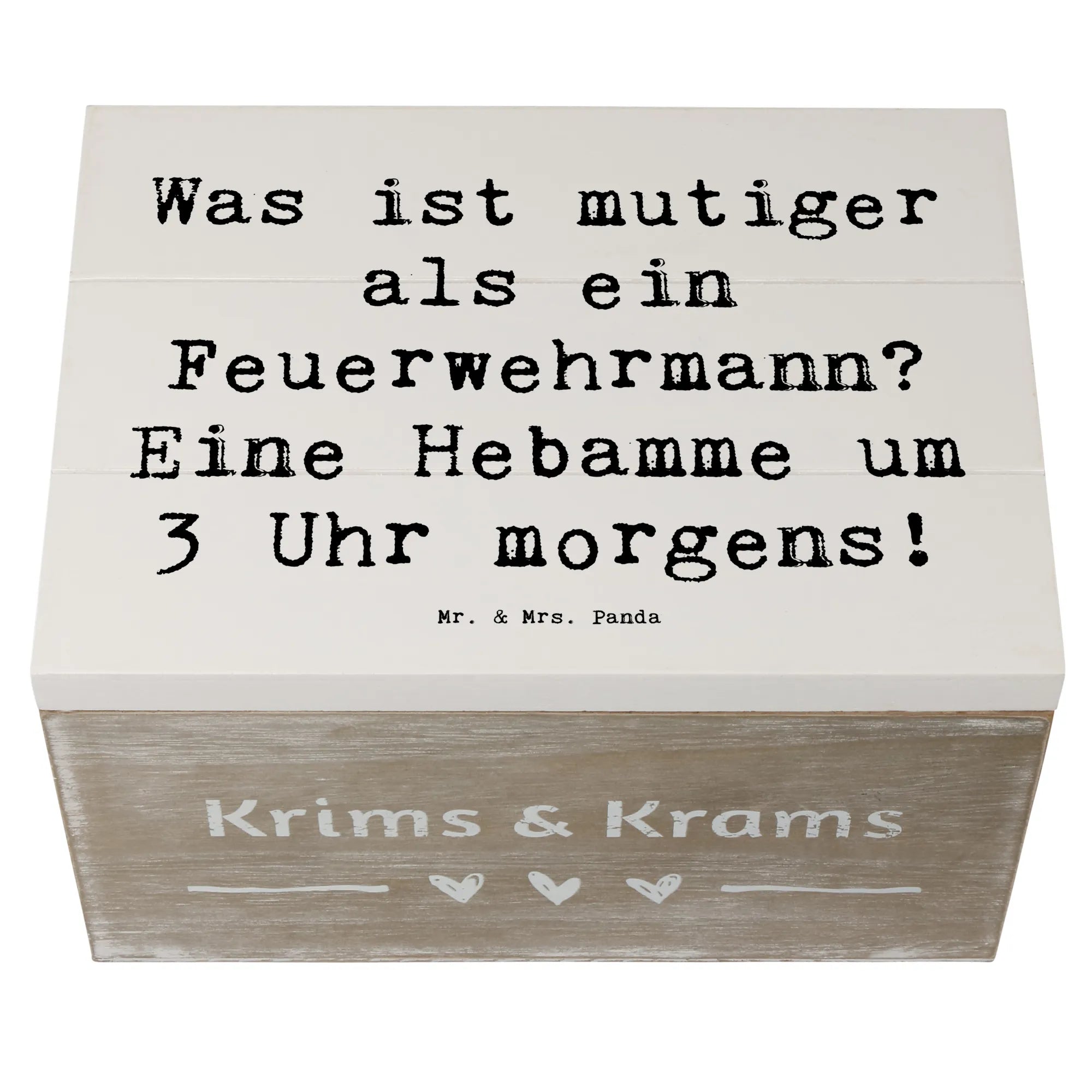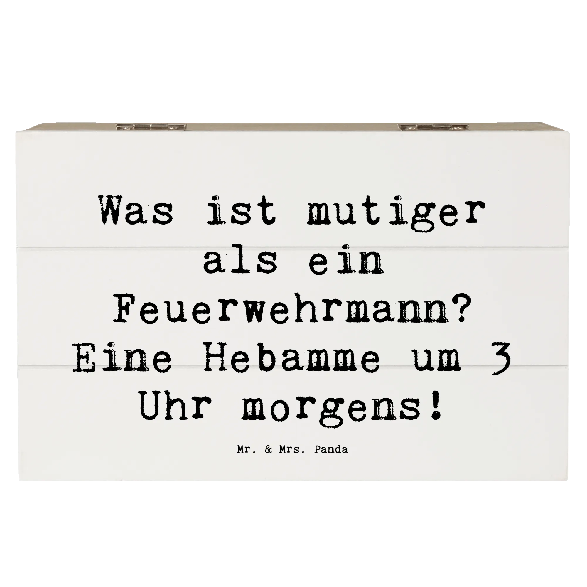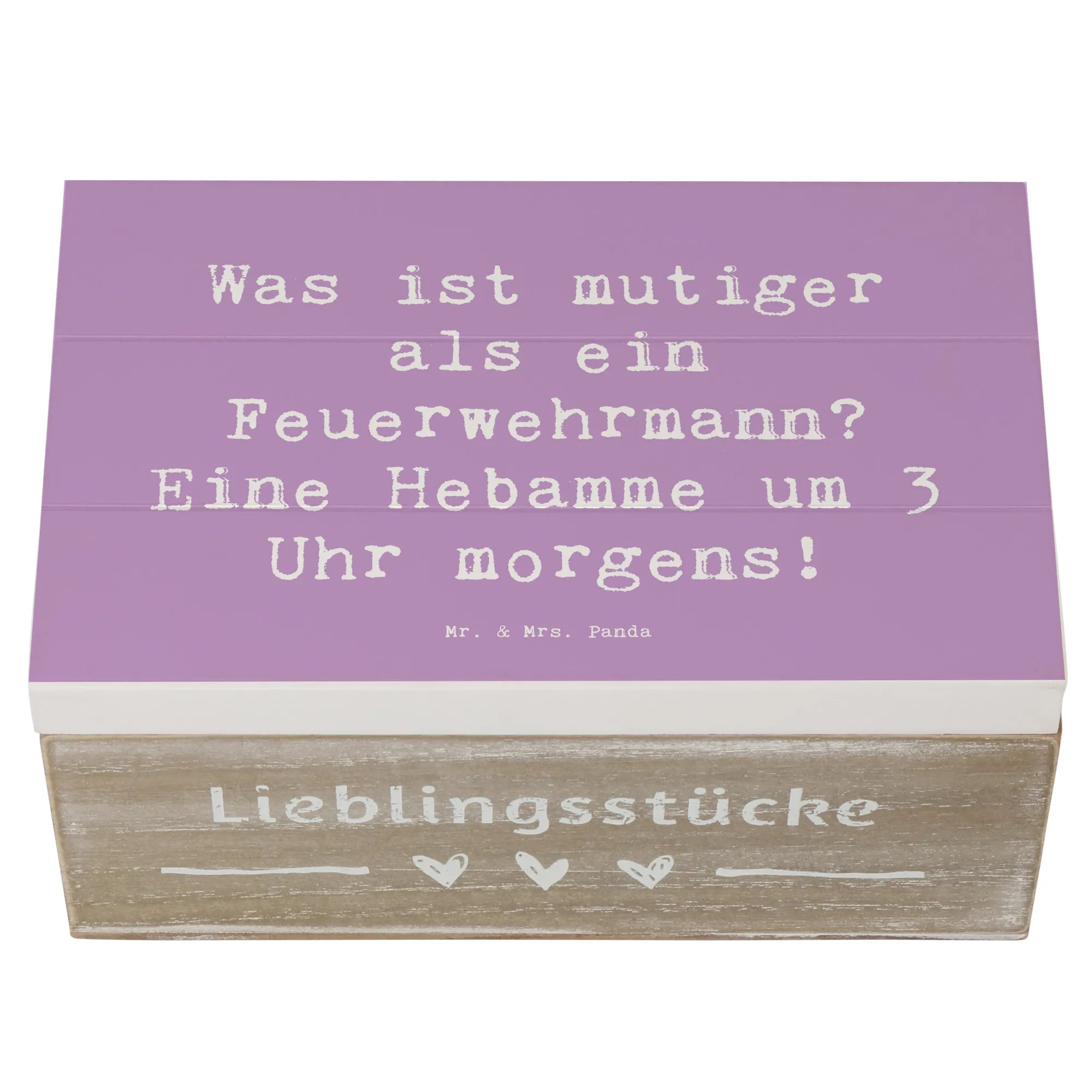 Die wunderschöne Holzkiste von Mr. & Mrs. Panda ist der perfekte Ort, um Deine wertvollsten Erinnerungen zu bewahren! Mit einer liebevoll gestalteten Botschaft, die das Herz einer jeden Hebamme erfreuen wird: 'Was ist mutiger als ein Feuerwehrmann? Eine Hebamme um 3 Uhr morgens!'. Diese bezaubernde Erinnerungskiste besteht aus robuster Holzfaser und hat die Maße 190 mm x 120 mm x 100 mm. Sie bietet ausreichend Platz für besondere Schätze, Fotos oder kleine Geschenke.