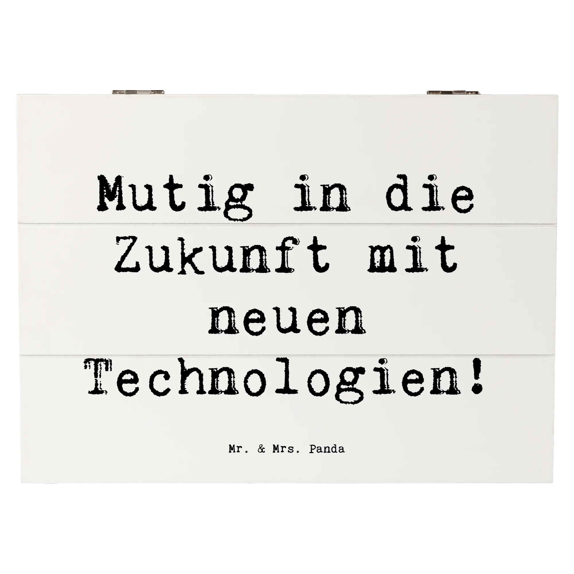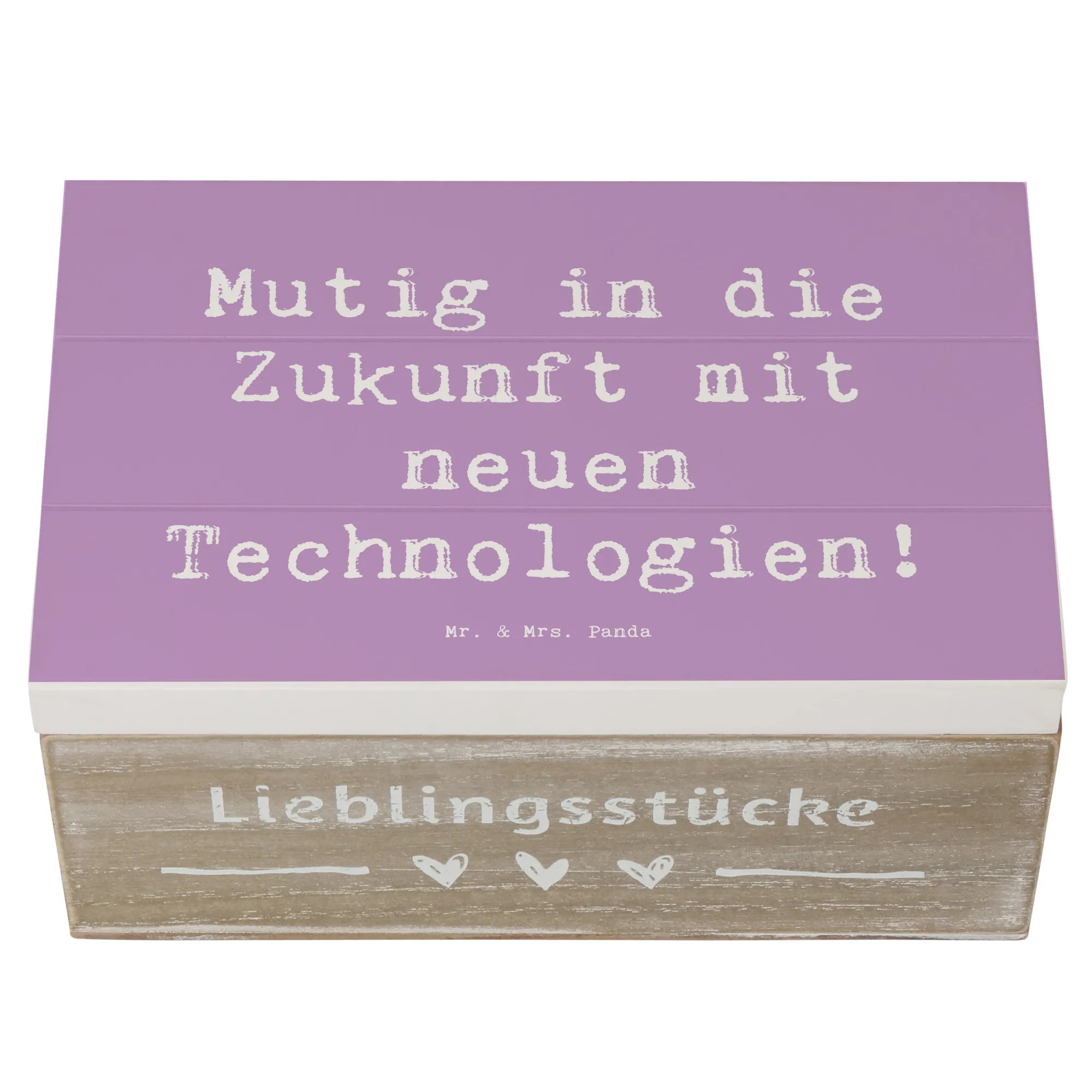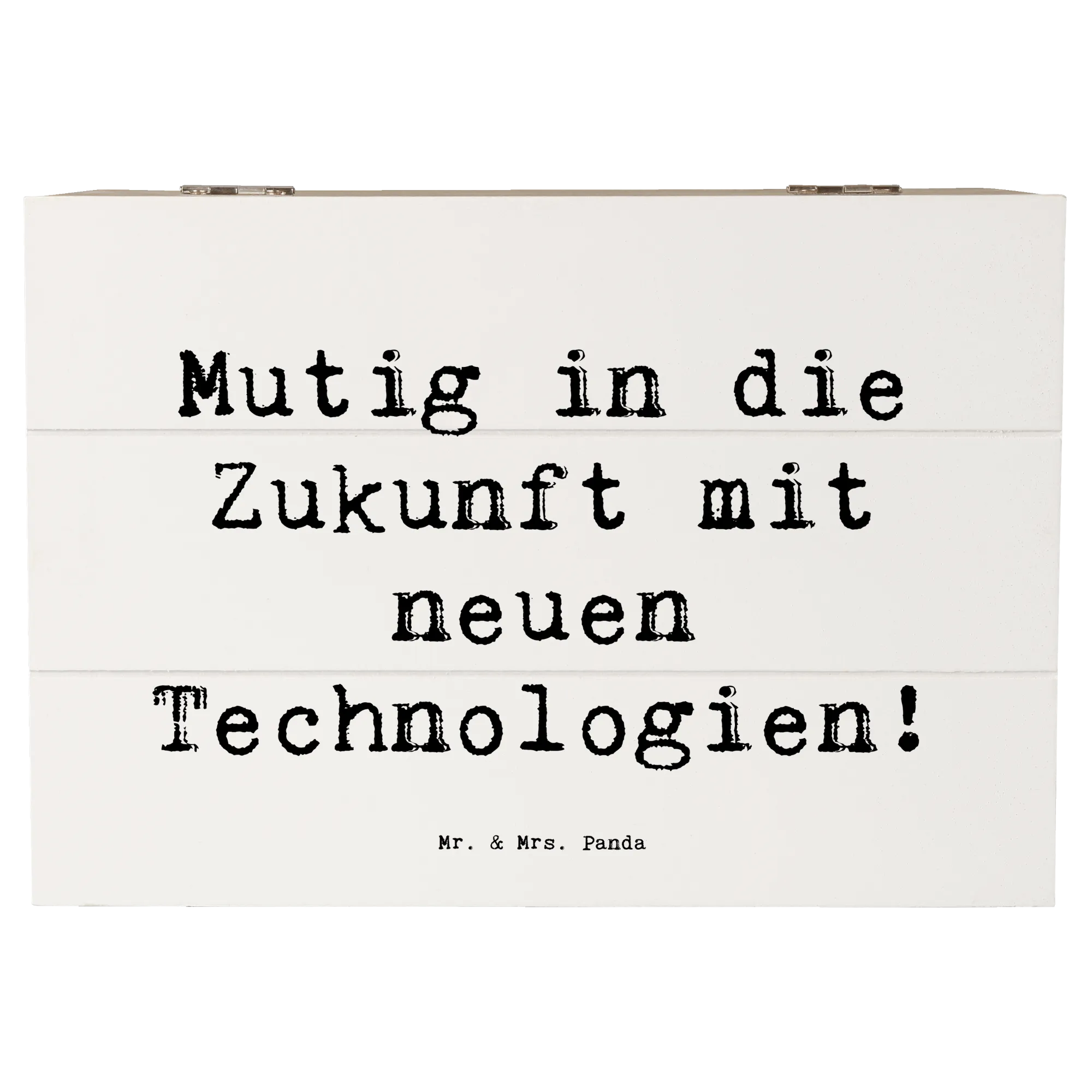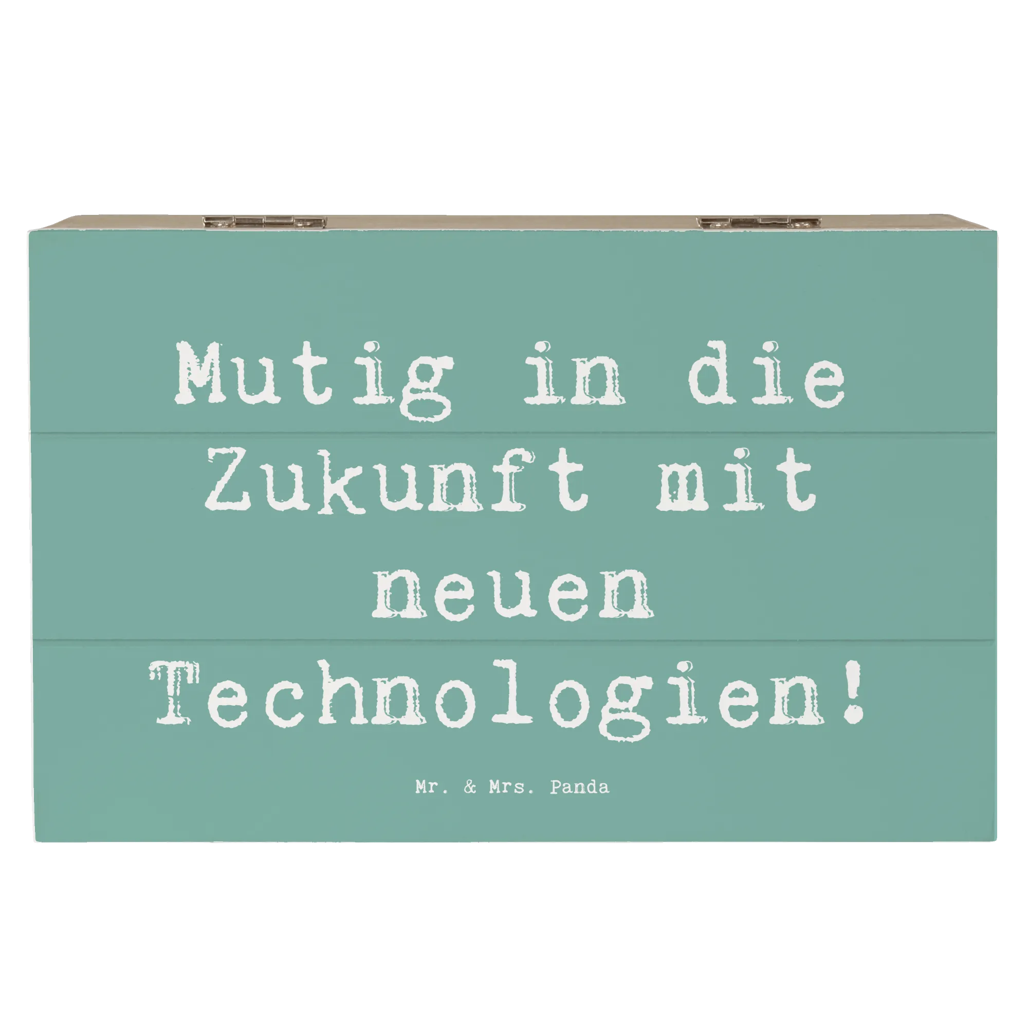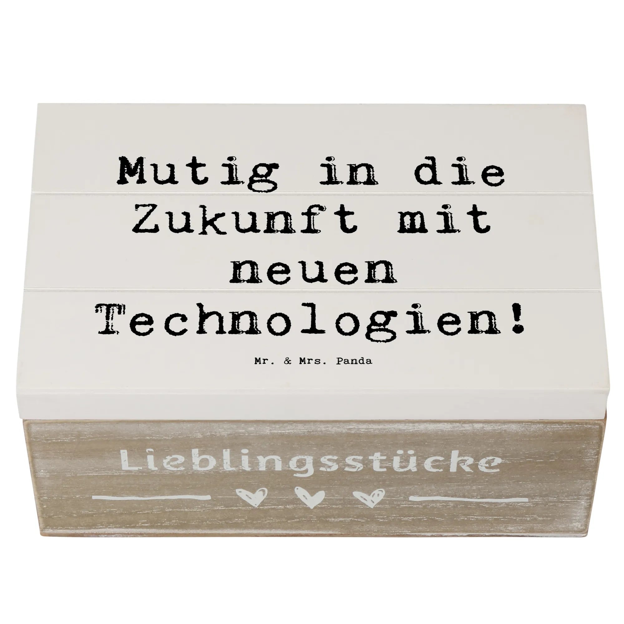 Mit dem ermutigenden Slogan 'Mutig in die Zukunft mit neuen Technologien!' inspiriert sie dazu, neue Wege zu gehen und Herausforderungen anzugehen. Diese Holzkiste ist Teil der 'Mutmacher'-Kollektion von Mr. & Mrs. Panda, die Produkte bietet, die Trost und Zuversicht spenden.