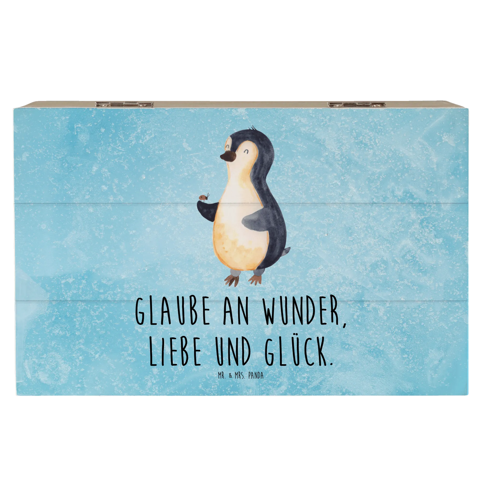 Die Holzkiste mit dem süßen Pinguin Marienkäfer von Mr. & Mrs. Panda ist nicht nur ein dekorativer Blickfang, sondern auch der ideale Aufbewahrungsort für all deine kleinen Schätze. Ob Erinnerungen an besondere Anlässe, Kindheitserinnerungen oder die Liebsten, diese Erinnerungskiste bietet viel Platz für all die kostbaren Dinge, die du festhalten möchtest. Mit einem liebevoll handgezeichneten Pinguin, der einen fröhlichen Marienkäfer auf seiner Flosse hält, bringt sie Freude und gute Laune in dein Zuhause.