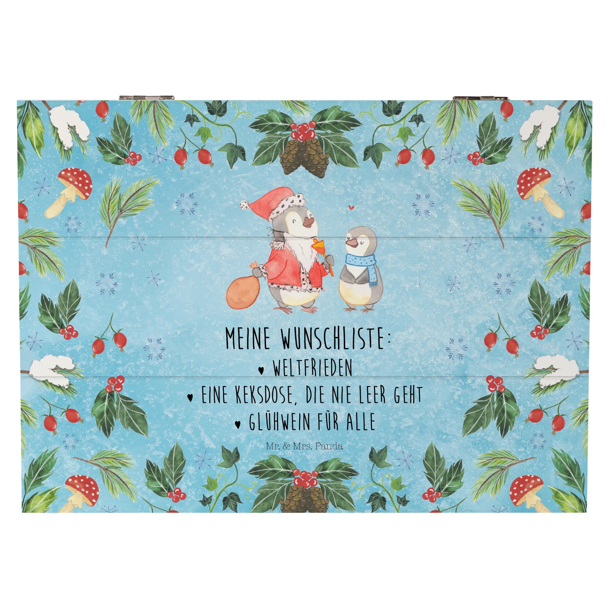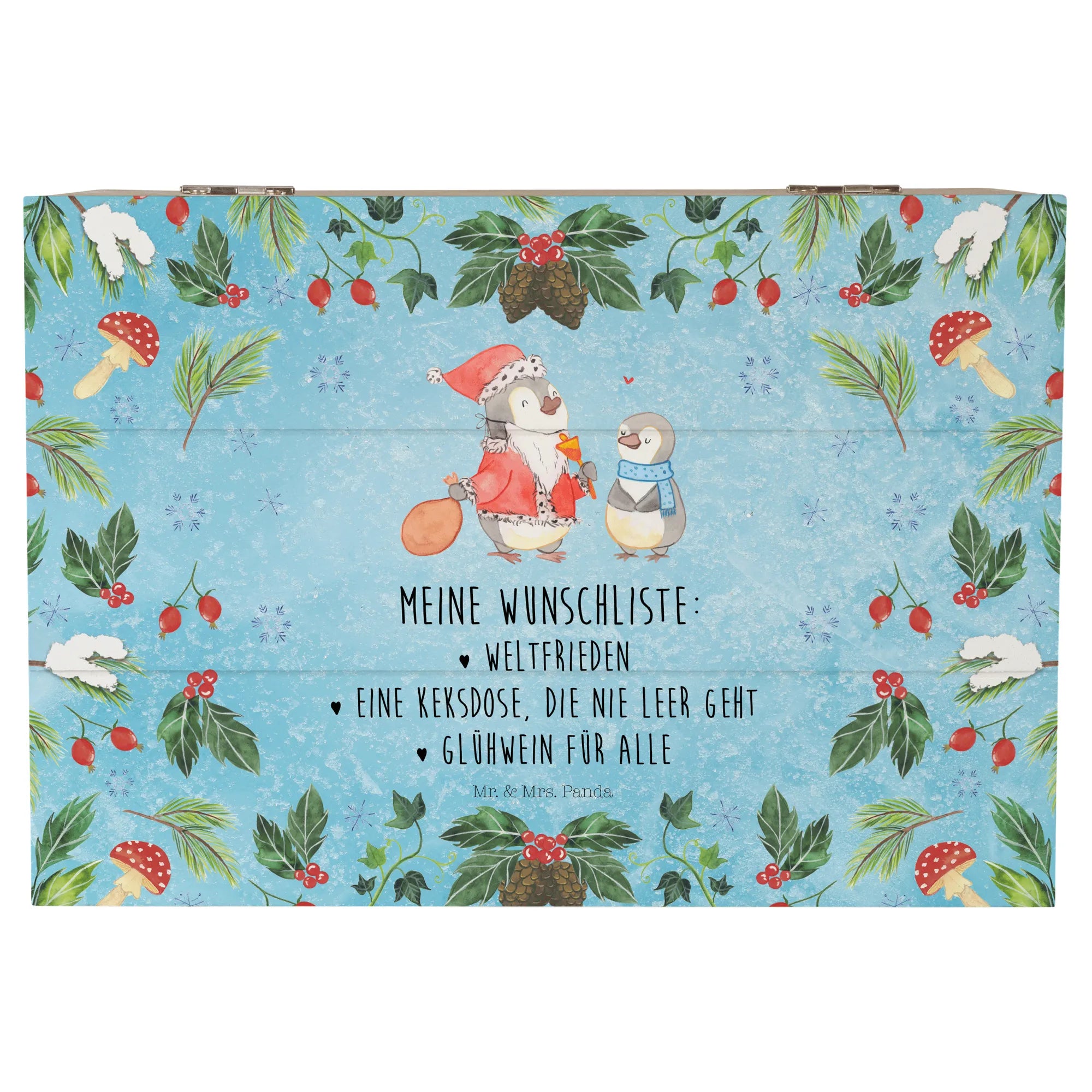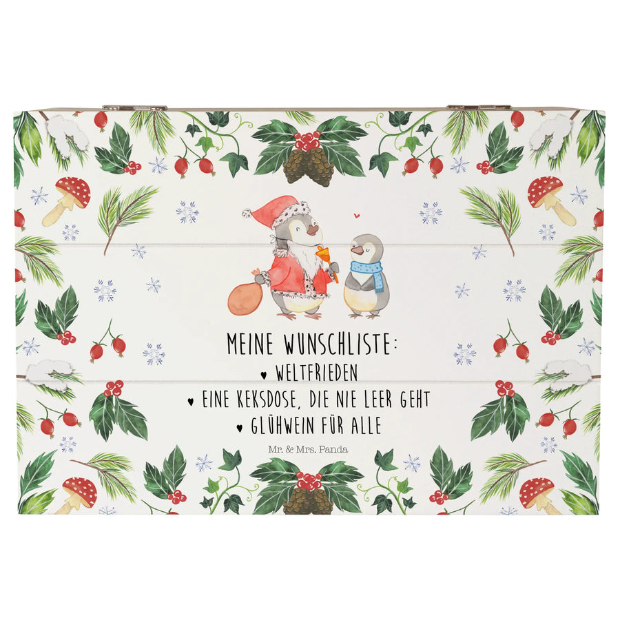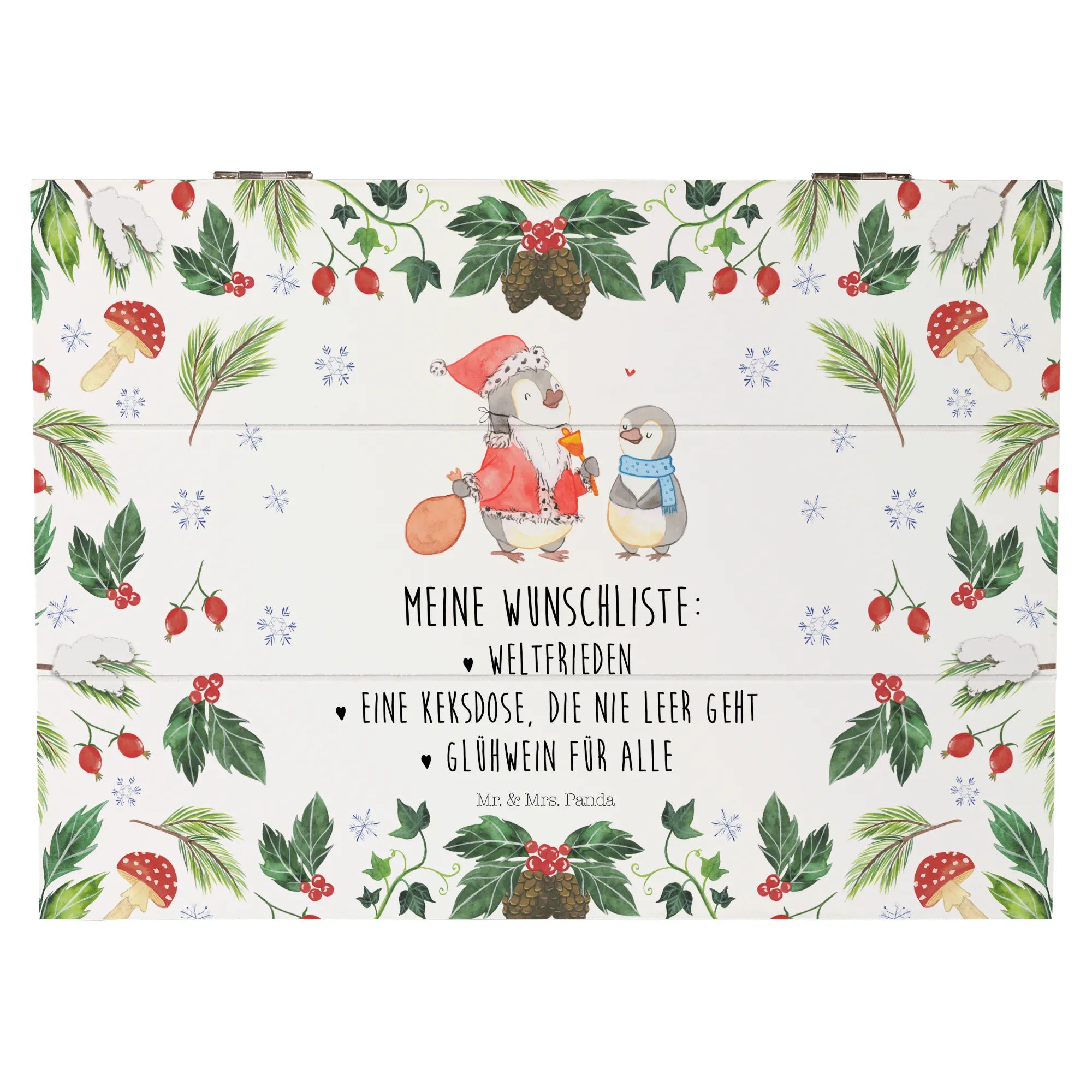 Diese wunderschöne Holzkiste von Mr. & Mrs. Panda ist das perfekte Geschenk für die kalte Winterzeit! Mit ihrem bezaubernden Pinguin Wunschliste Motiv wirkt sie besonders festlich und bringt alle, die sie sehen, zum Schmunzeln.