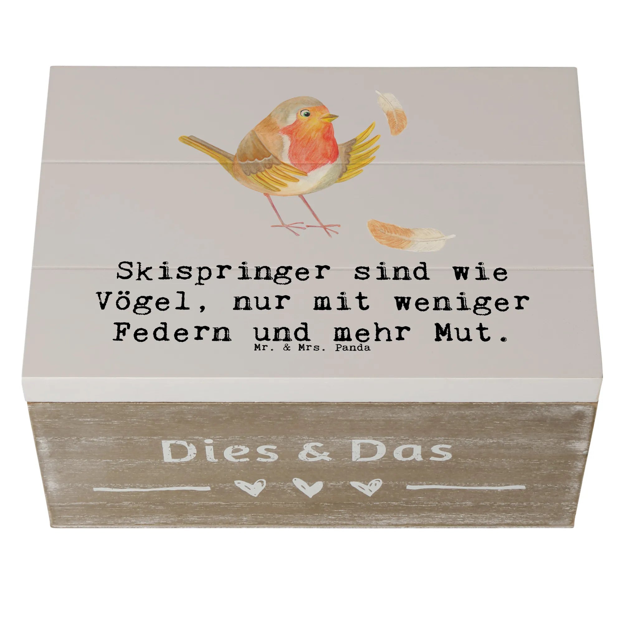 Diese Kiste mit dem liebevollen Motiv "Skispringen" und dem Spruch "Skispringer sind wie Vögel, nur mit weniger Federn und mehr Mut" ist perfekt für alle Sportbegeisterten, die ihren Schatz an Erinnerungen stilvoll aufbewahren möchten.