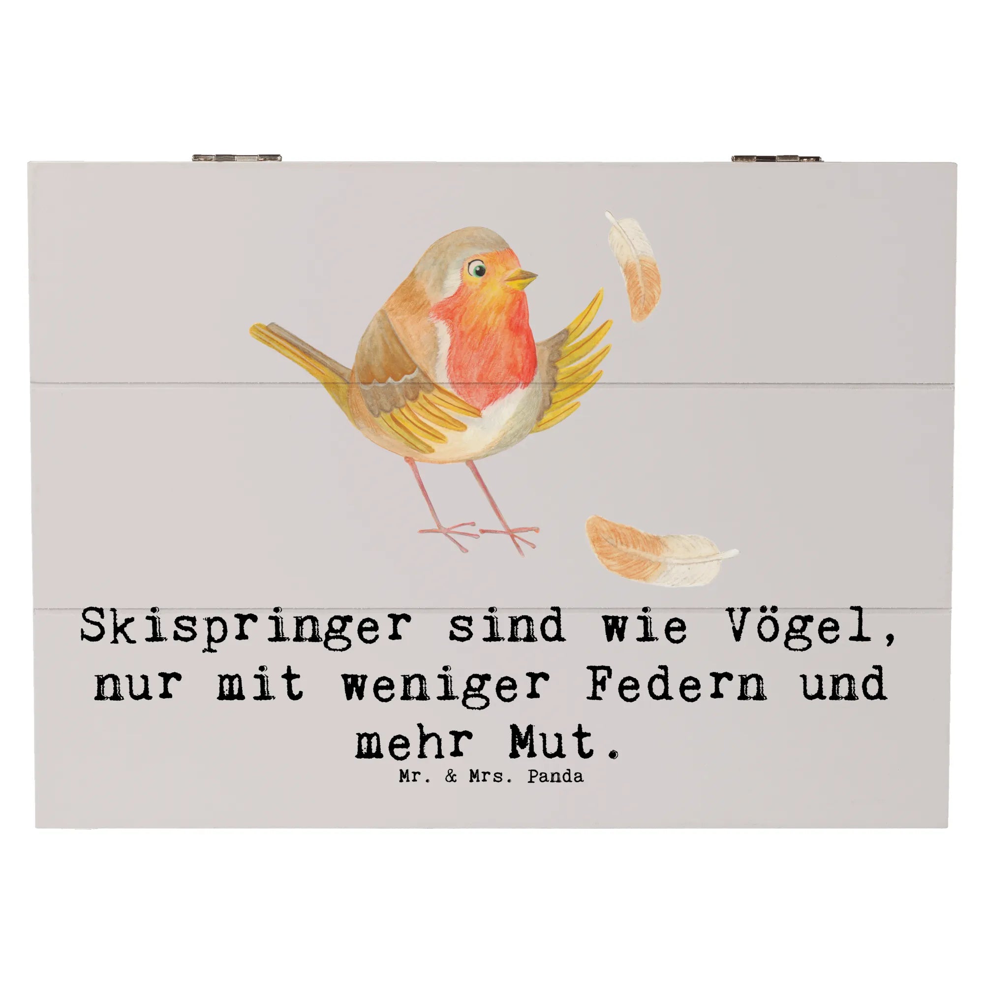 Die Mr. & Mrs. Panda Holzkiste besticht durch ihr liebevolles Design, das mit dem Motto "Skispringer sind wie Vögel, nur mit weniger Federn und mehr Mut." versehen ist. Dieses humorvolle Zitat stammt aus unserer speziellen Sportarten-Kollektion, die verschiedene Hobbys und Sportarten umfasst – perfekt für diejenigen, die die Leidenschaft für den Sport in ihrem Alltag zeigen möchten.