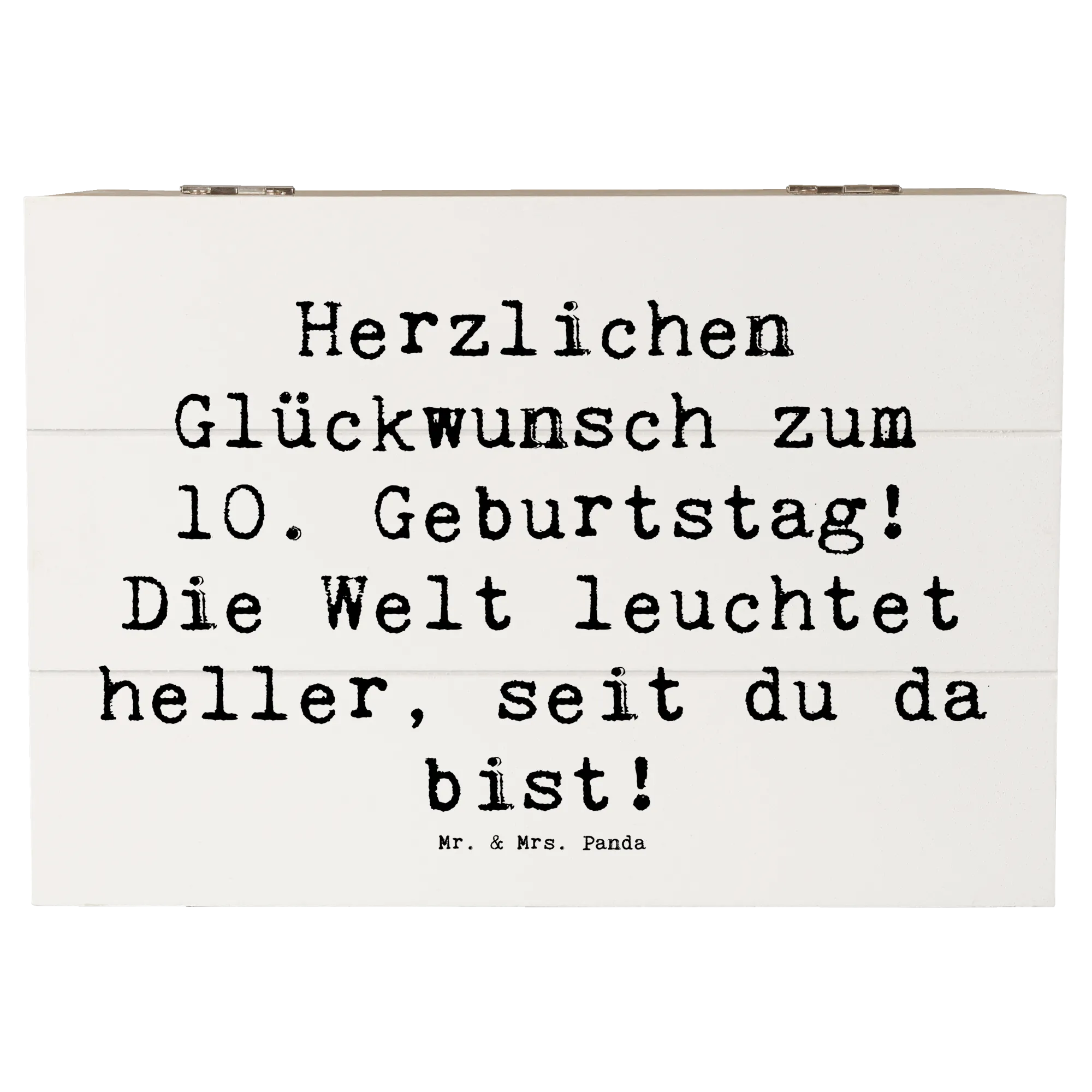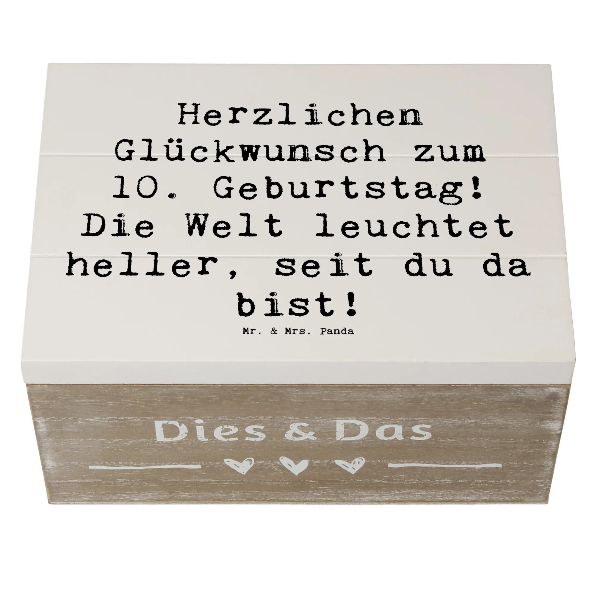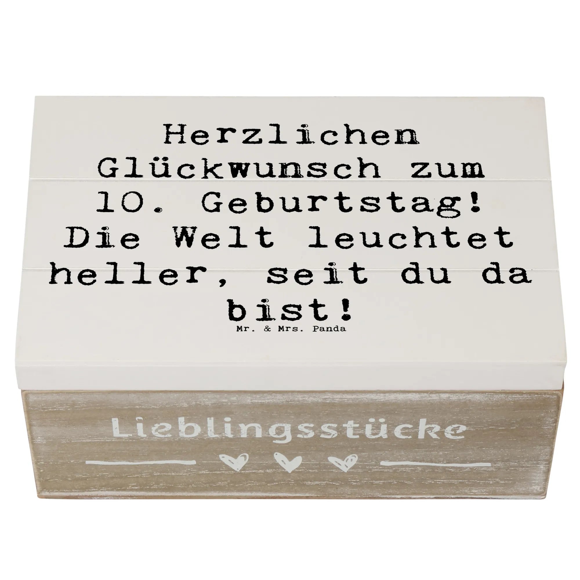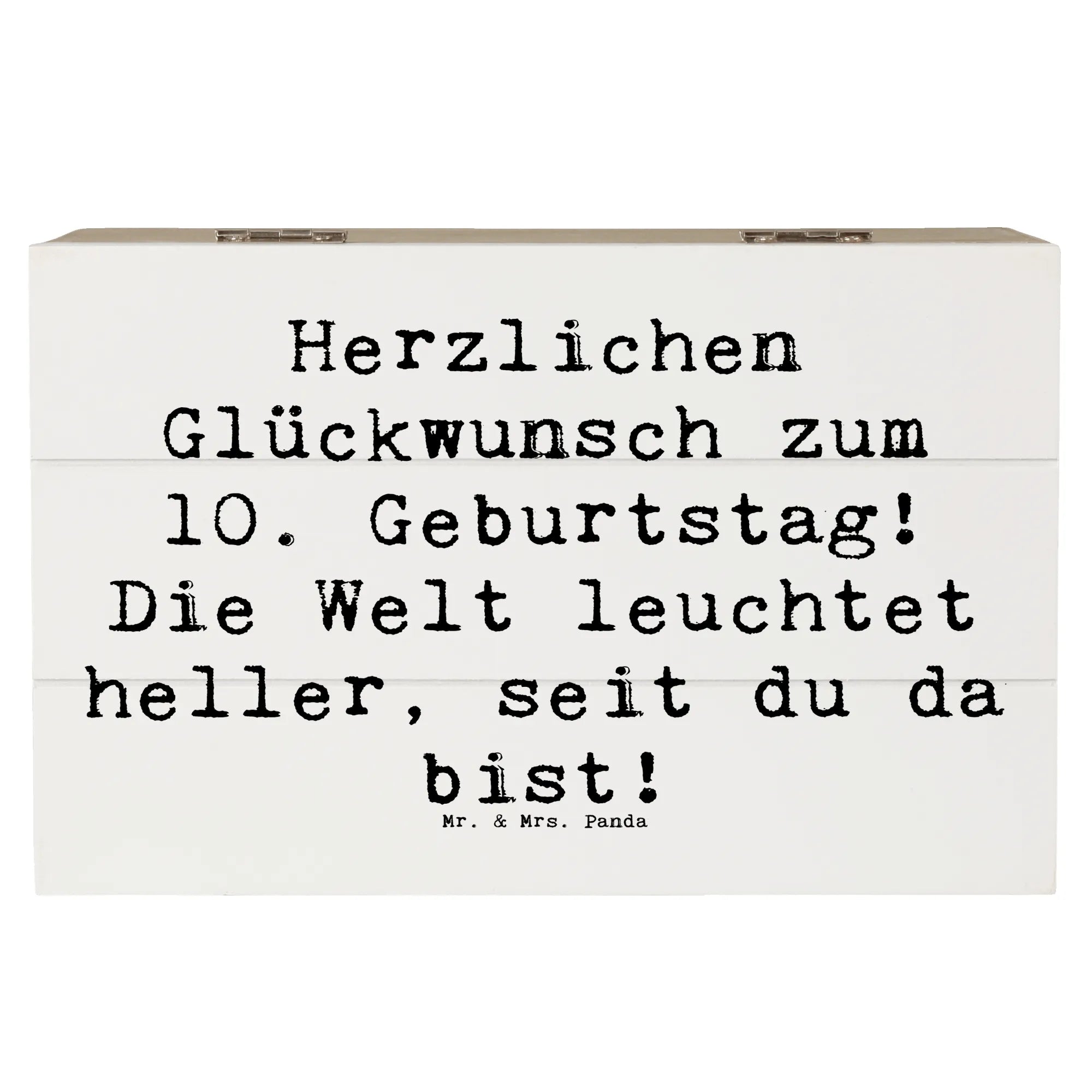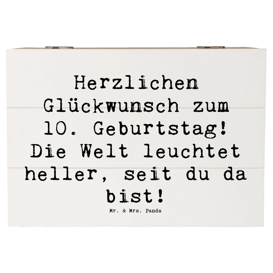 Die wunderschöne Holzkiste von Mr. & Mrs. Panda ist die perfekte Geschenkidee zum 10. Geburtstag eines besonderen Kindes. Mit dem liebevollen Spruch 'Herzlichen Glückwunsch zum 10. Geburtstag! Die Welt leuchtet heller, seit du da bist!' wird diese Kiste zu einem unvergesslichen Andenken.