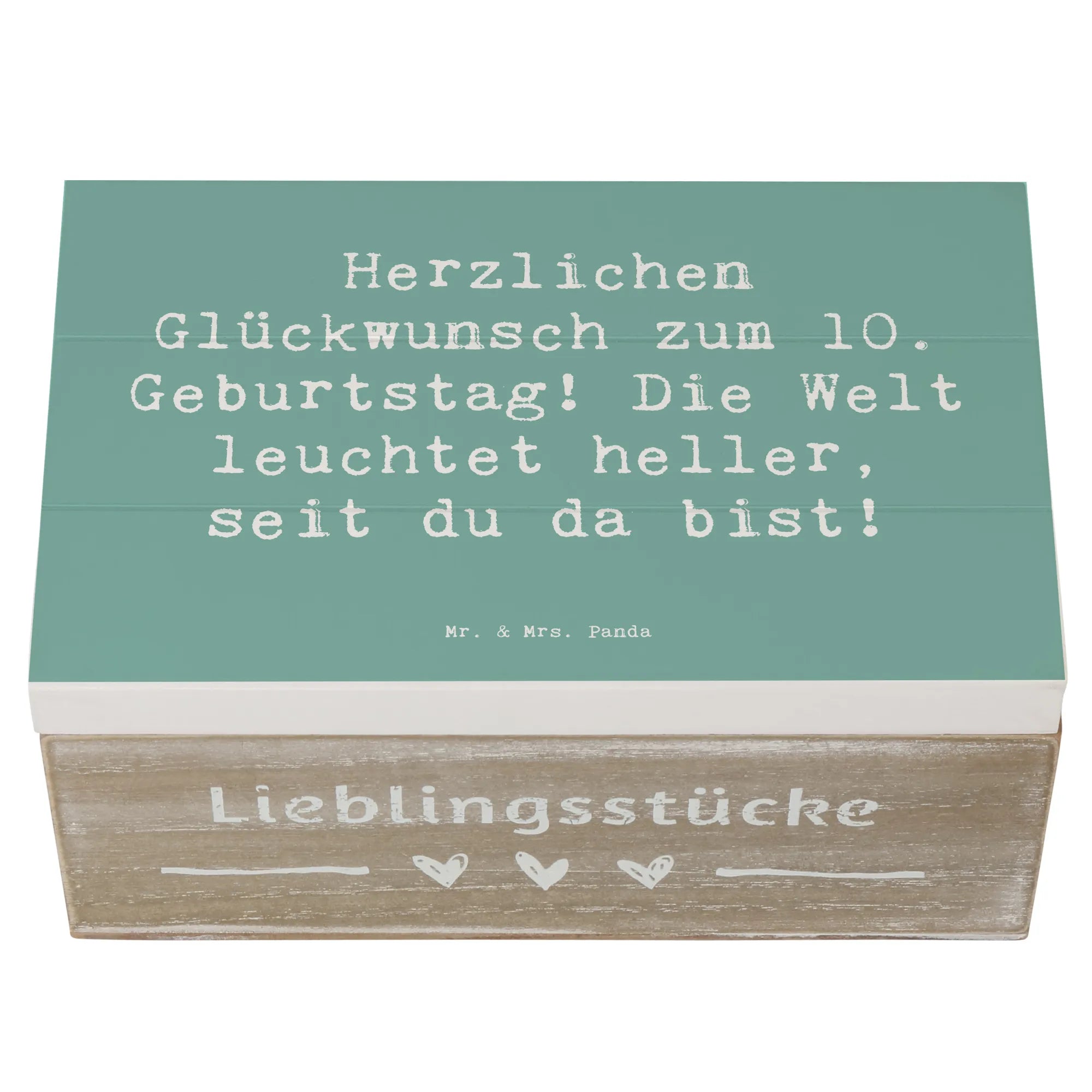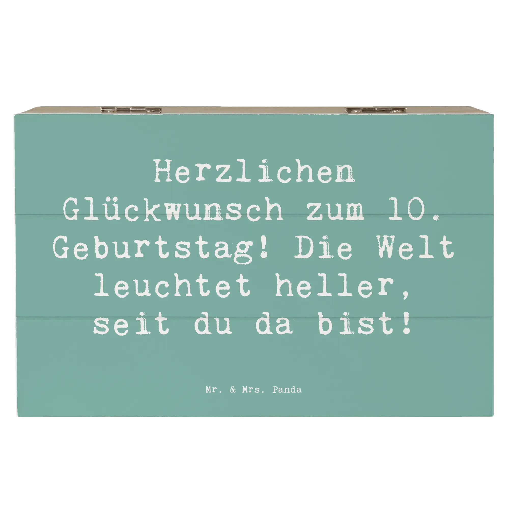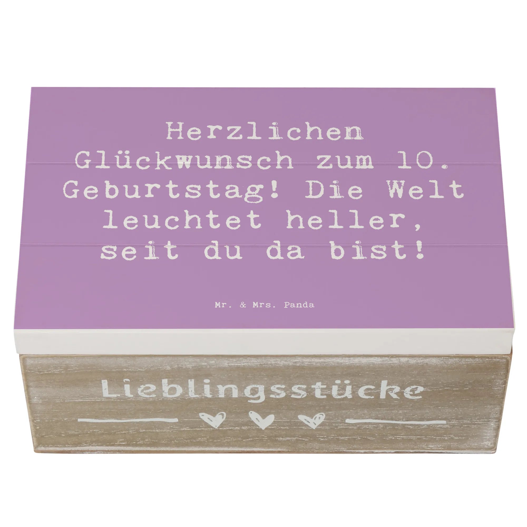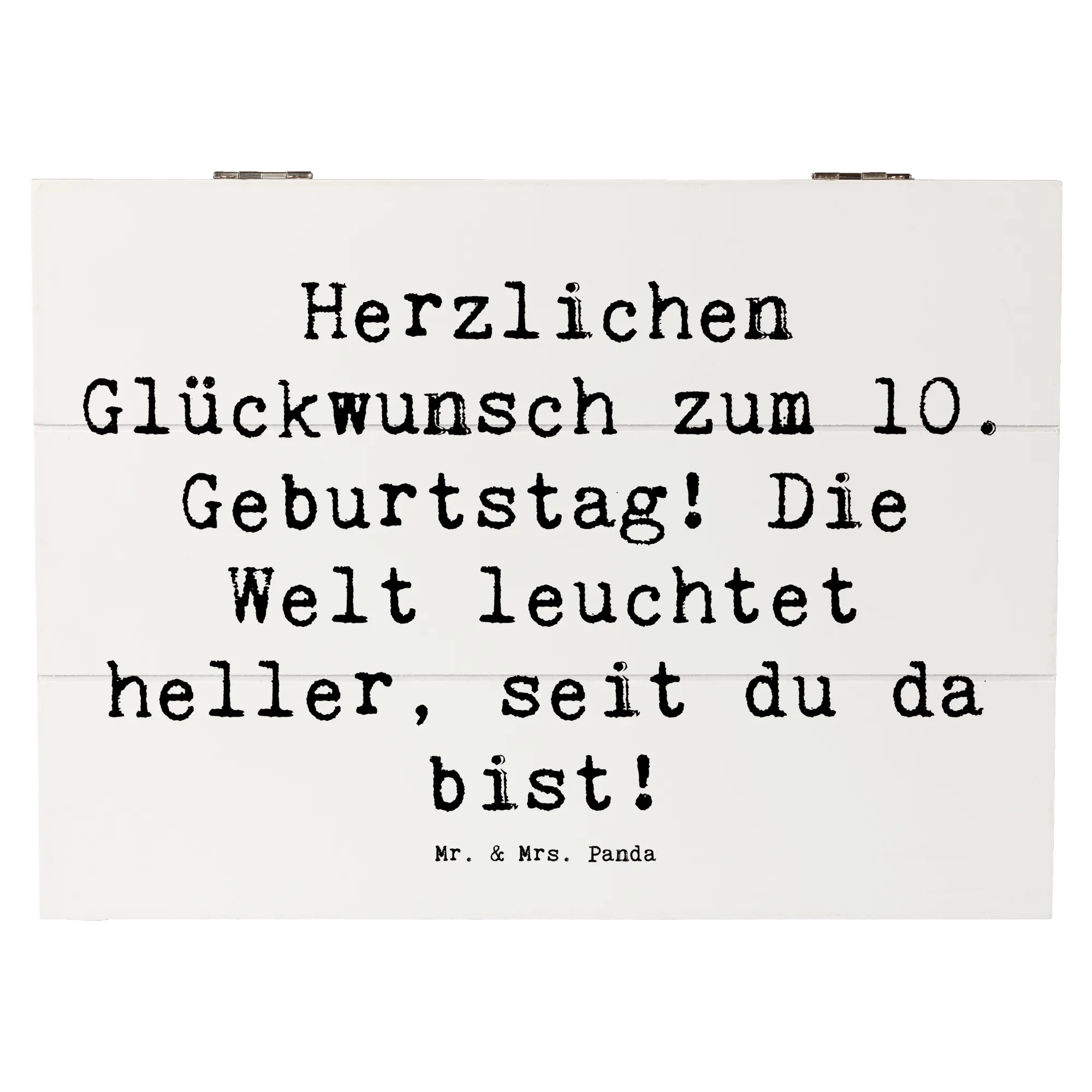 Die wunderschöne Holzkiste von Mr. & Mrs. Panda ist die perfekte Geschenkidee zum 10. Geburtstag eines besonderen Kindes. Mit dem liebevollen Spruch 'Herzlichen Glückwunsch zum 10. Geburtstag! Die Welt leuchtet heller, seit du da bist!' wird diese Kiste zu einem unvergesslichen Andenken.