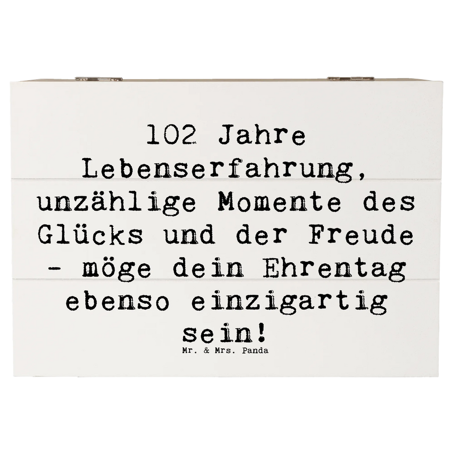 Die wunderschöne Holzkiste von Mr. & Mrs. Panda ist das perfekte Geschenk zum 102. Geburtstag! Mit einem bezaubernden Motiv und dem liebevollen Spruch "102 Jahre Lebenserfahrung, unzählige Momente des Glücks und der Freude - möge dein Ehrentag ebenso einzigartig sein!" wird sie ganz sicher zum Highlight jeder Geburtstagsfeier.