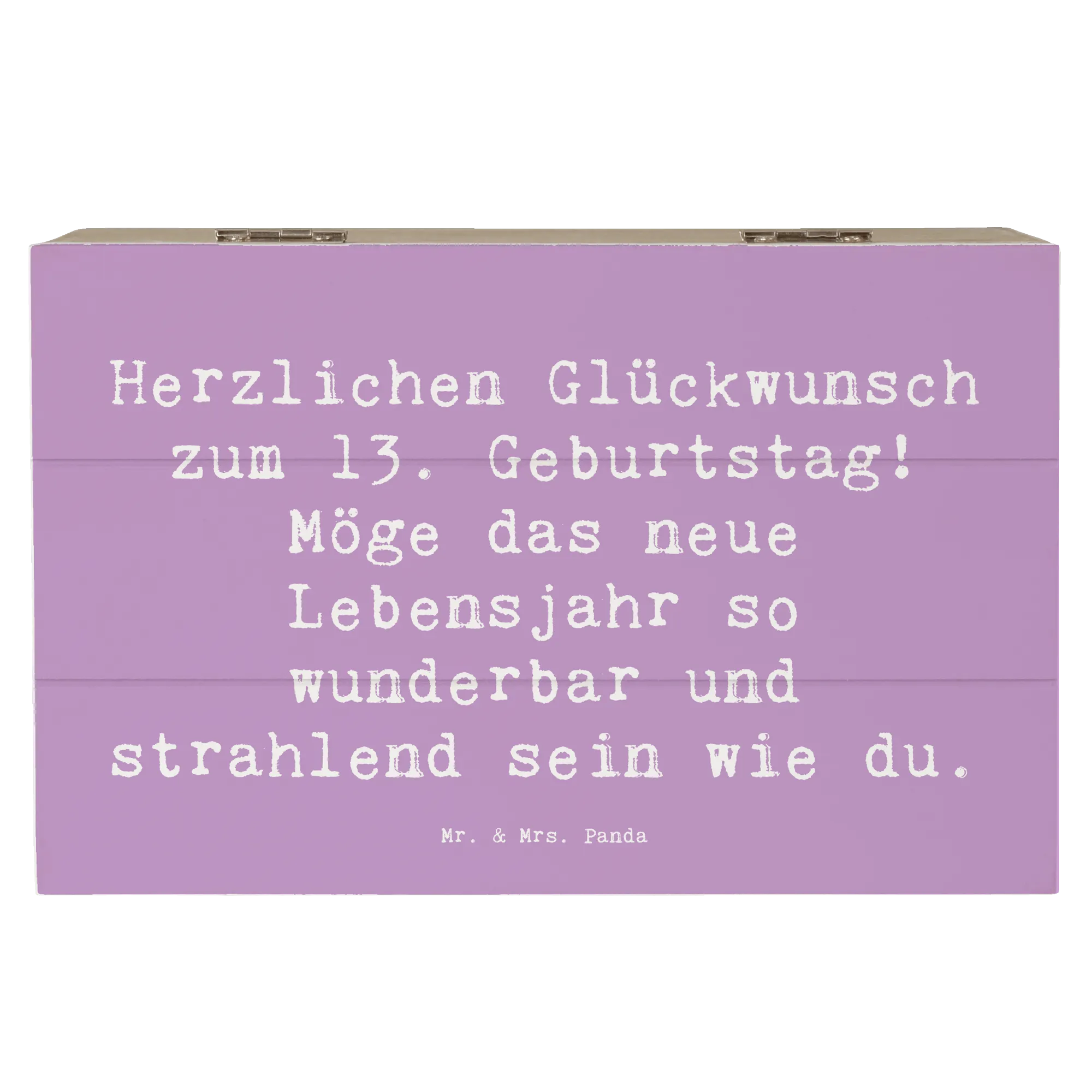 Sie besteht aus robuster Holzfaser, was sie nicht nur nachhaltig, sondern auch besonders stabil macht. Das charmante Design und der einprägsame Spruch 'Herzlichen Glückwunsch zum 13. Geburtstag! Möge das neue Lebensjahr so wunderbar und strahlend sein wie du.' verleihen der Kiste eine persönliche Note und machen sie zu einer einzigartigen Erinnerung.