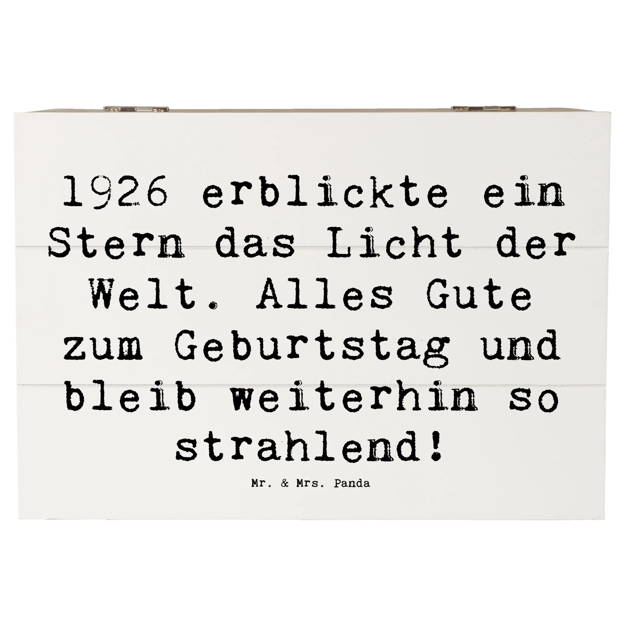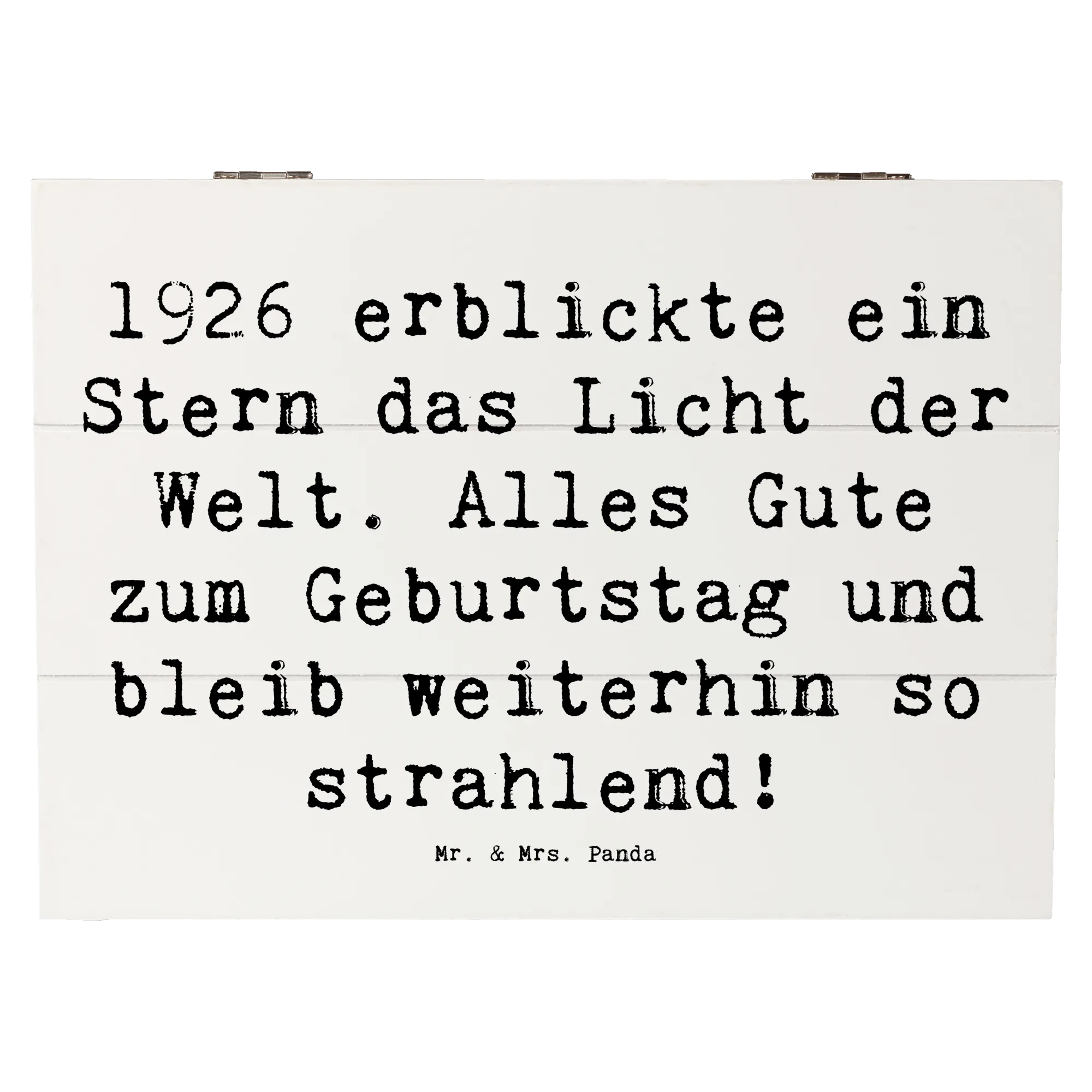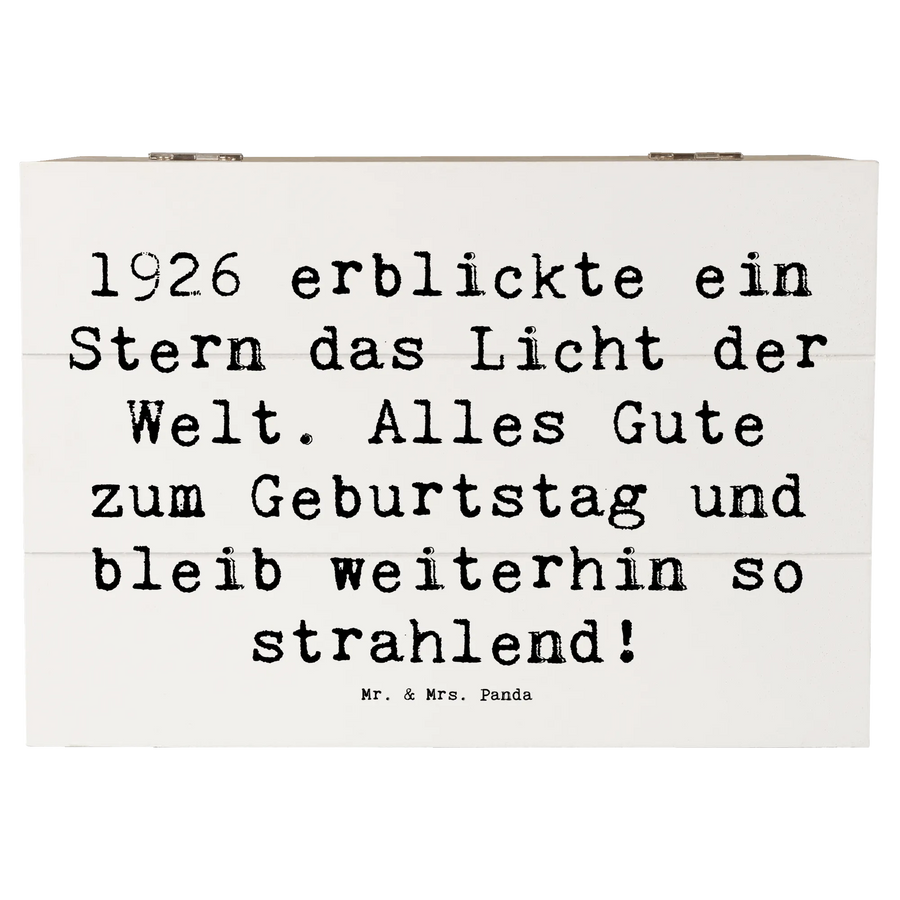 Die wunderschöne Holzkiste von Mr. & Mrs. Panda mit dem Motiv '1926 Geburtstag' ist das perfekte Geschenk für jeden, der in diesem Jahr das Licht der Welt erblickte. Sie eignet sich hervorragend als Aufbewahrungsort für die wertvollsten Schätze des Lebens, sei es für besondere Anlässe wie Geburtstage, Kommunion oder einfach so, um Erinnerungen zu bewahren.