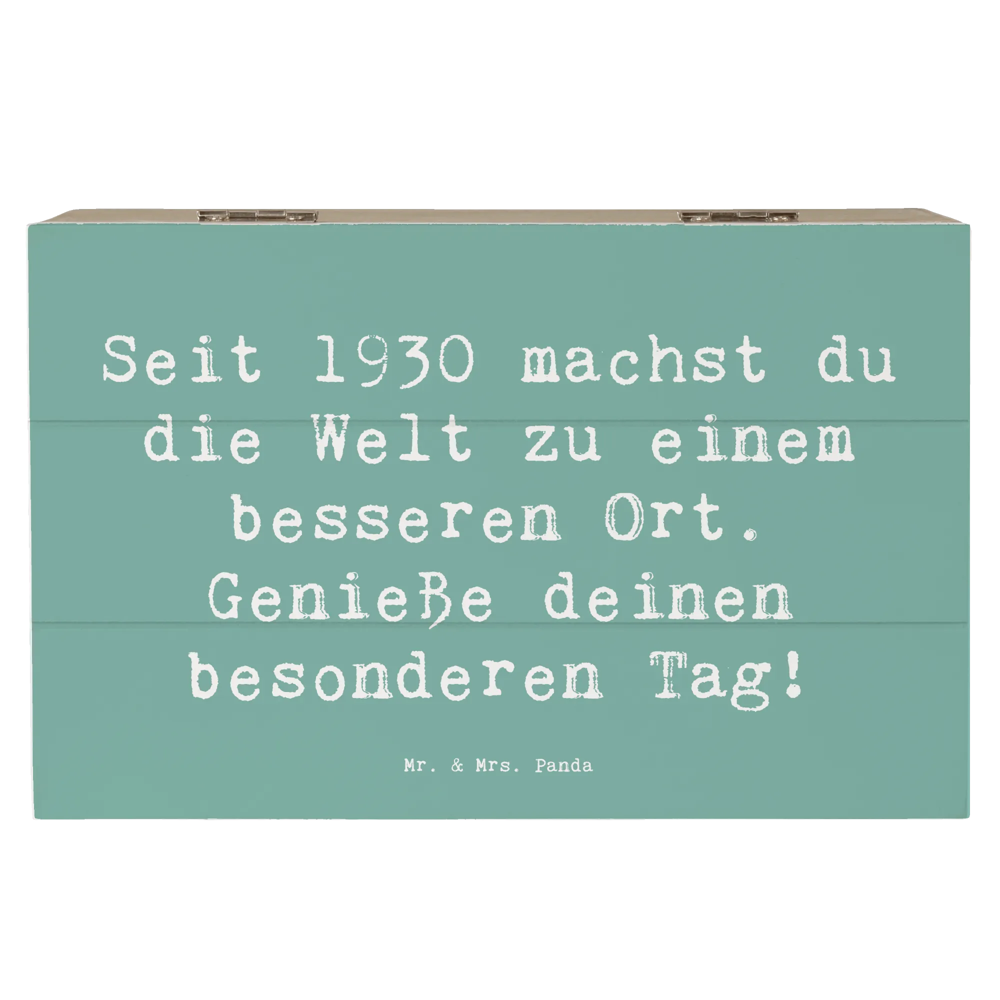 Mit dem eleganten Design in Meeresbrise und dem liebevoll handgezeichneten Motiv ‚Seit 1930 machst du die Welt zu einem besseren Ort. Genieße deinen besonderen Tag!‘ wird diese Kiste zum perfekten Highlight auf jeder Feier.