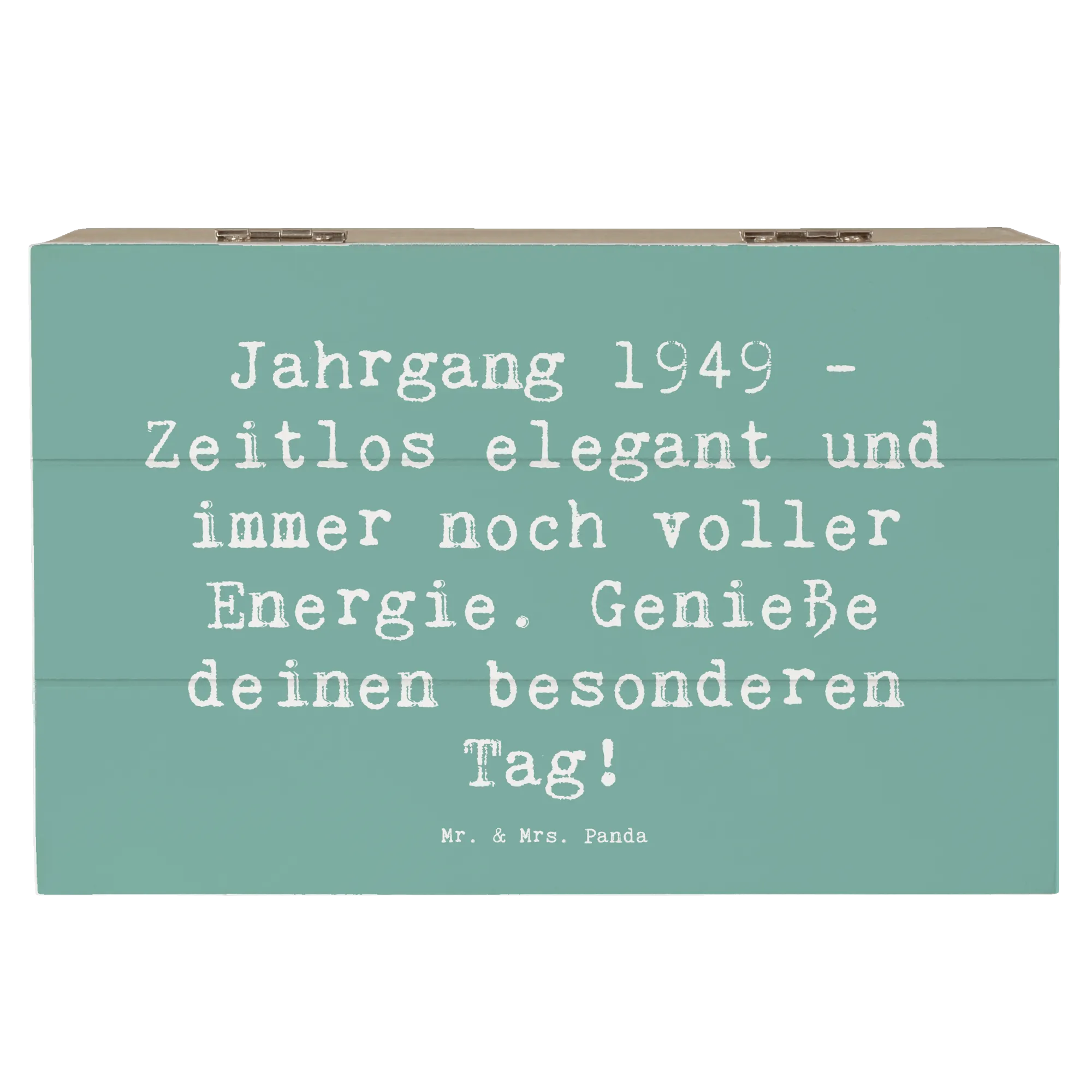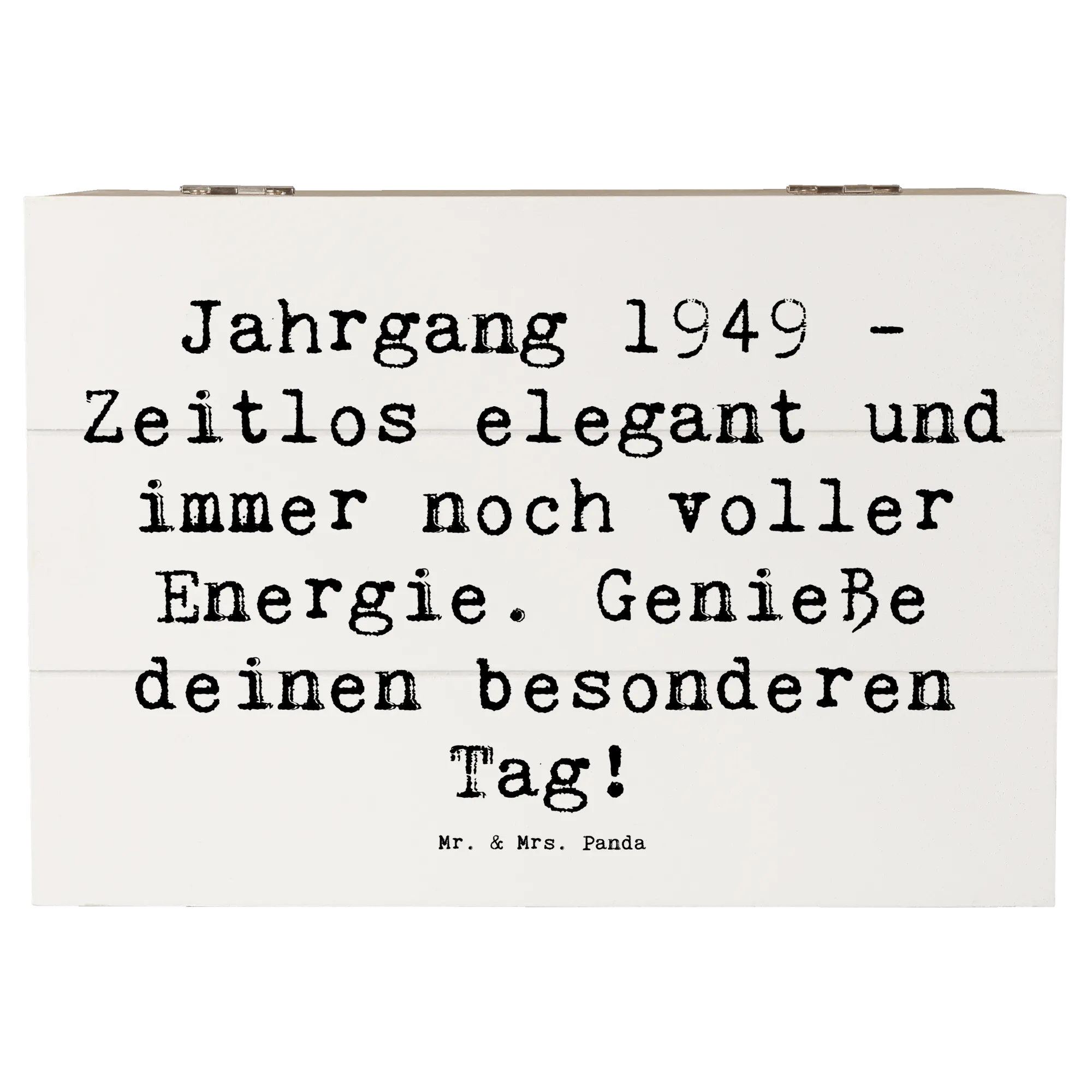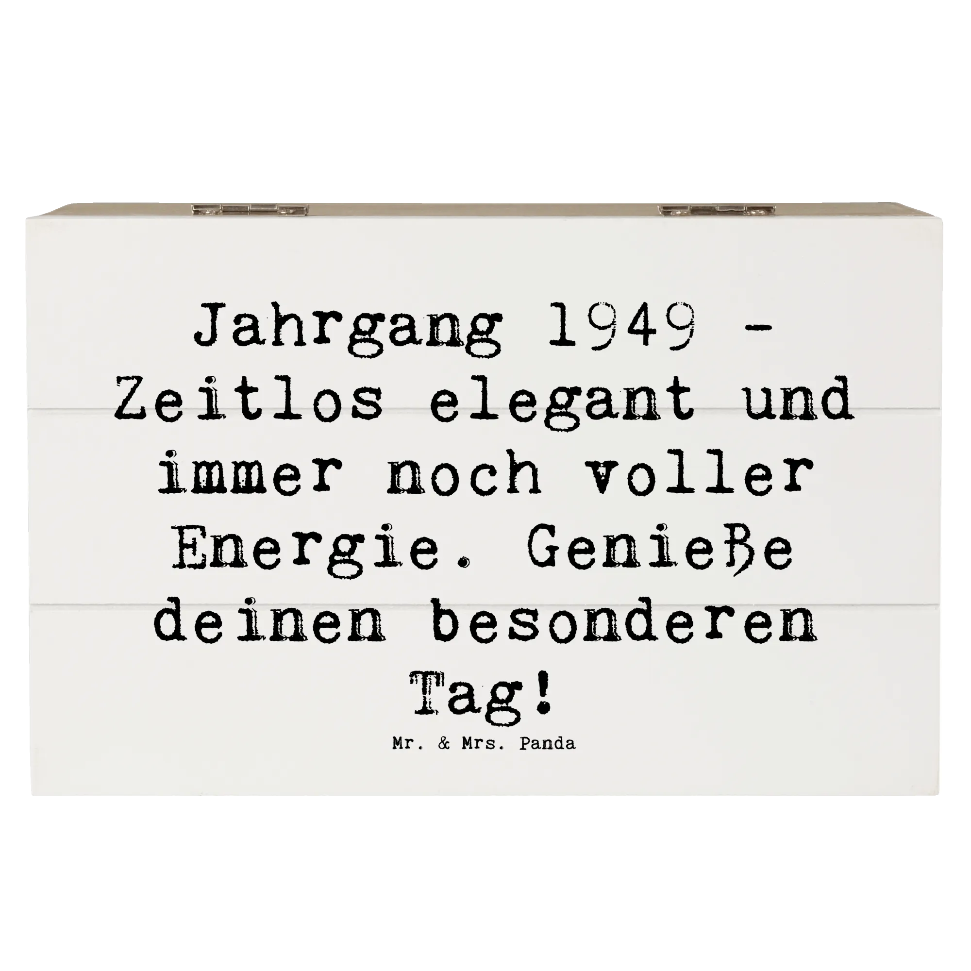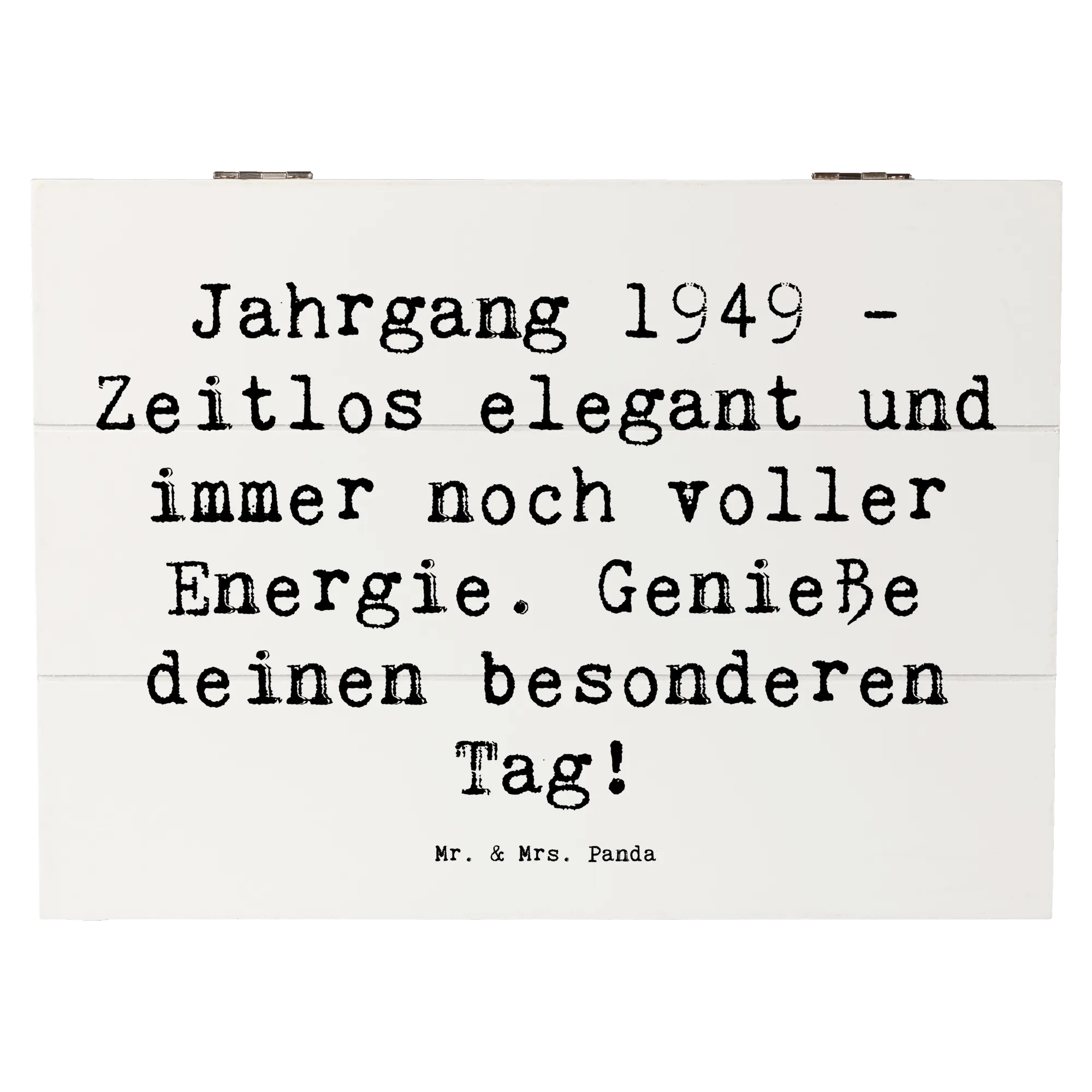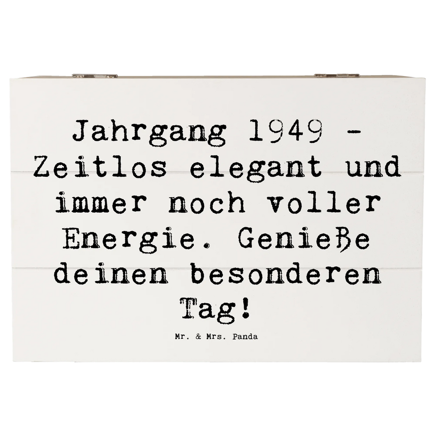 Entdecke die wunderschöne Holzkiste von Mr. & Mrs. Panda mit dem besonderen Motiv 'Jahrgang 1949 - Zeitlos elegant und immer noch voller Energie. Genieße deinen besonderen Tag!'. Diese stilvolle Erinnerungskiste ist der perfekte Platz, um all deine Schätze und kostbaren Erinnerungen aufzubewahren.