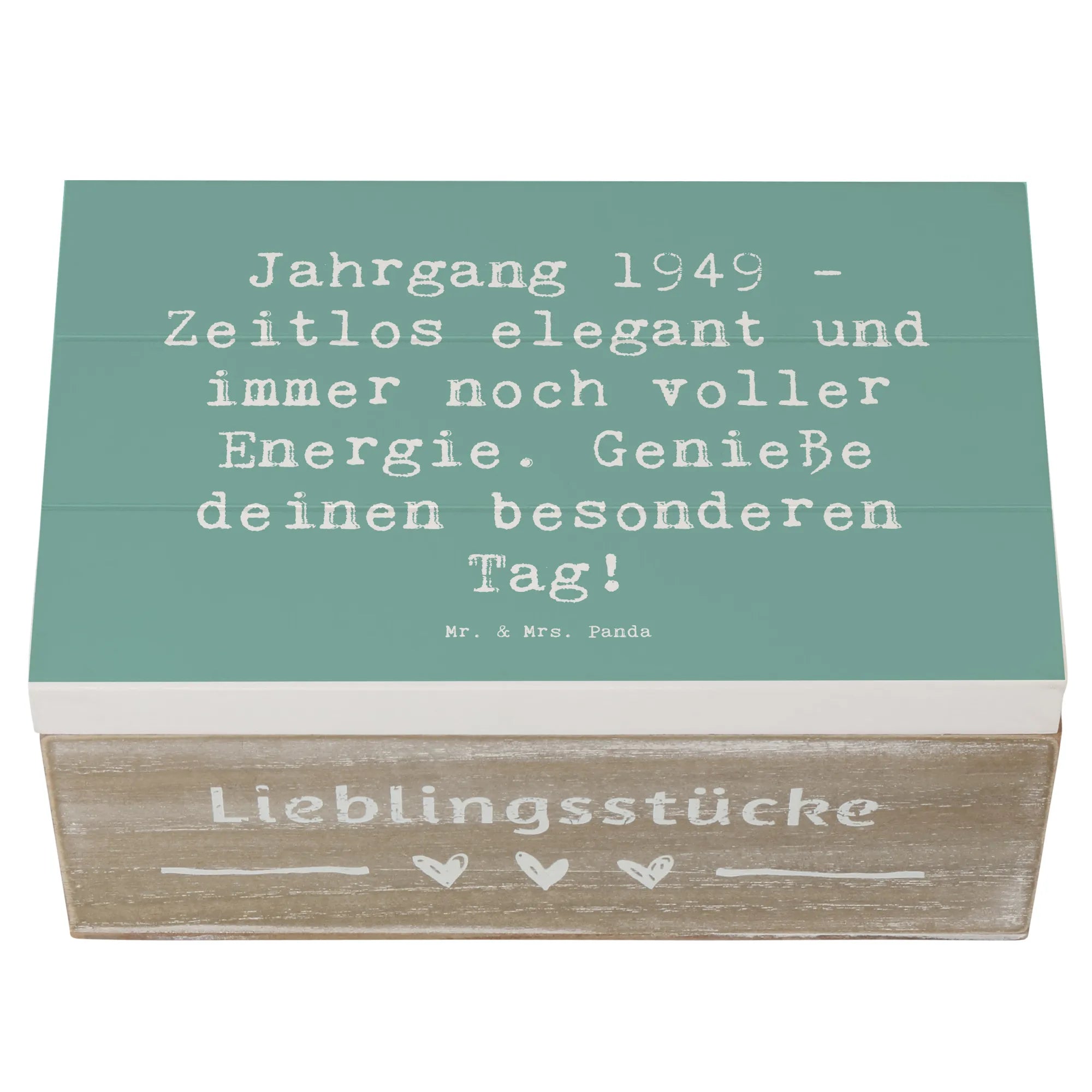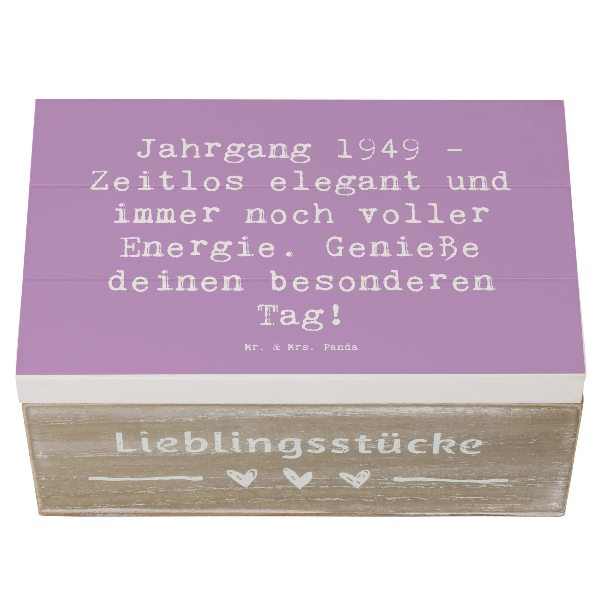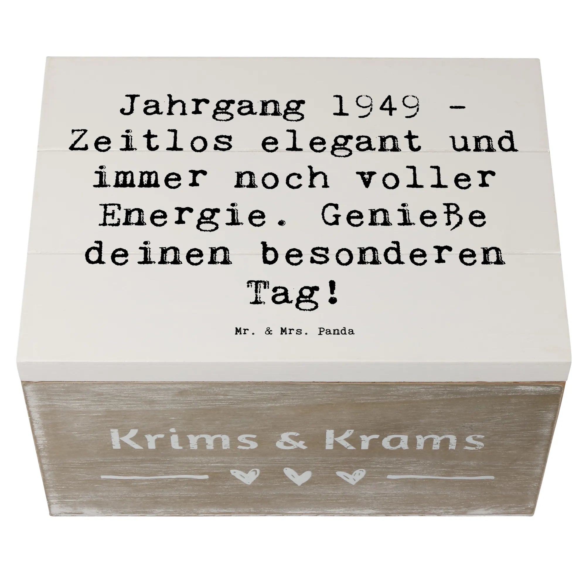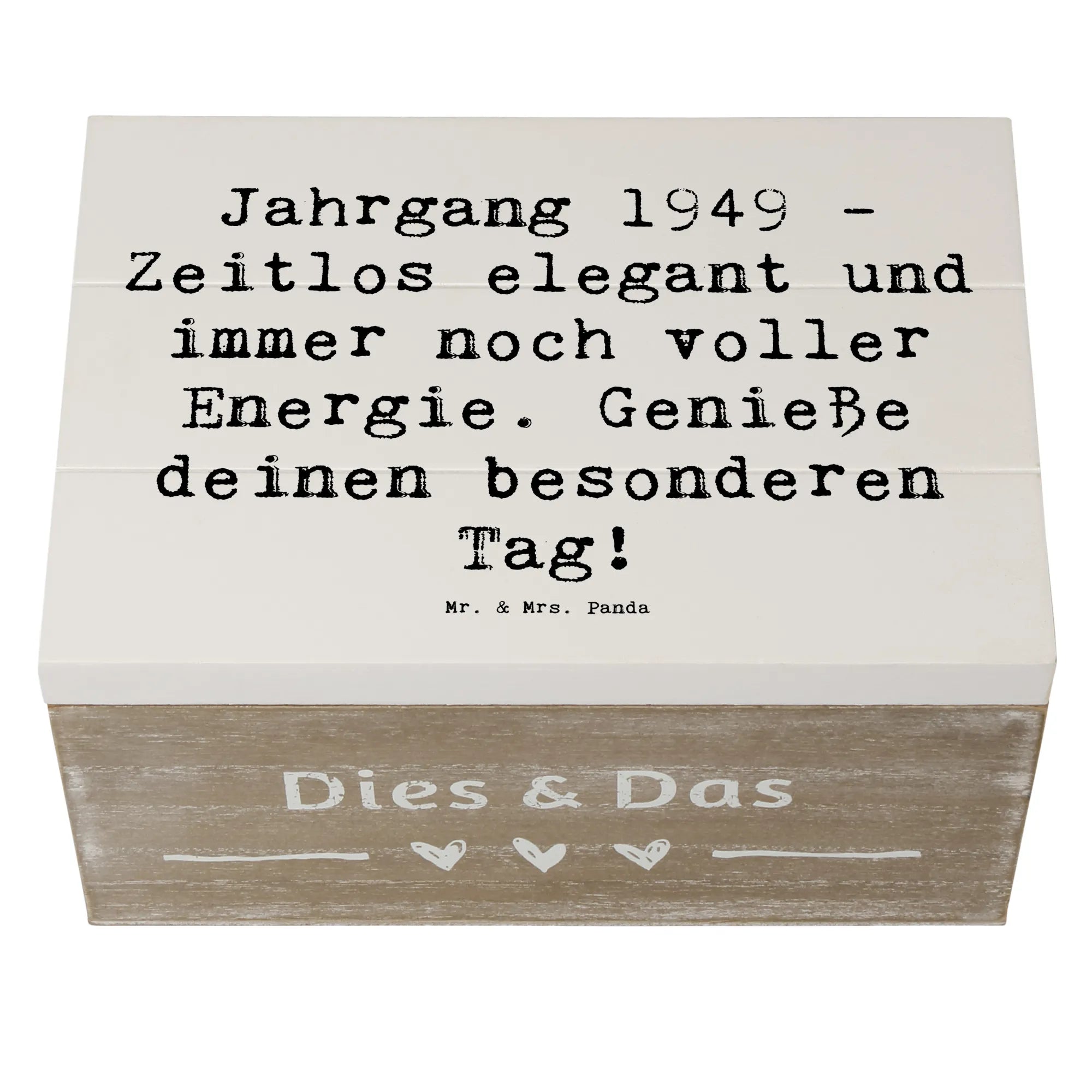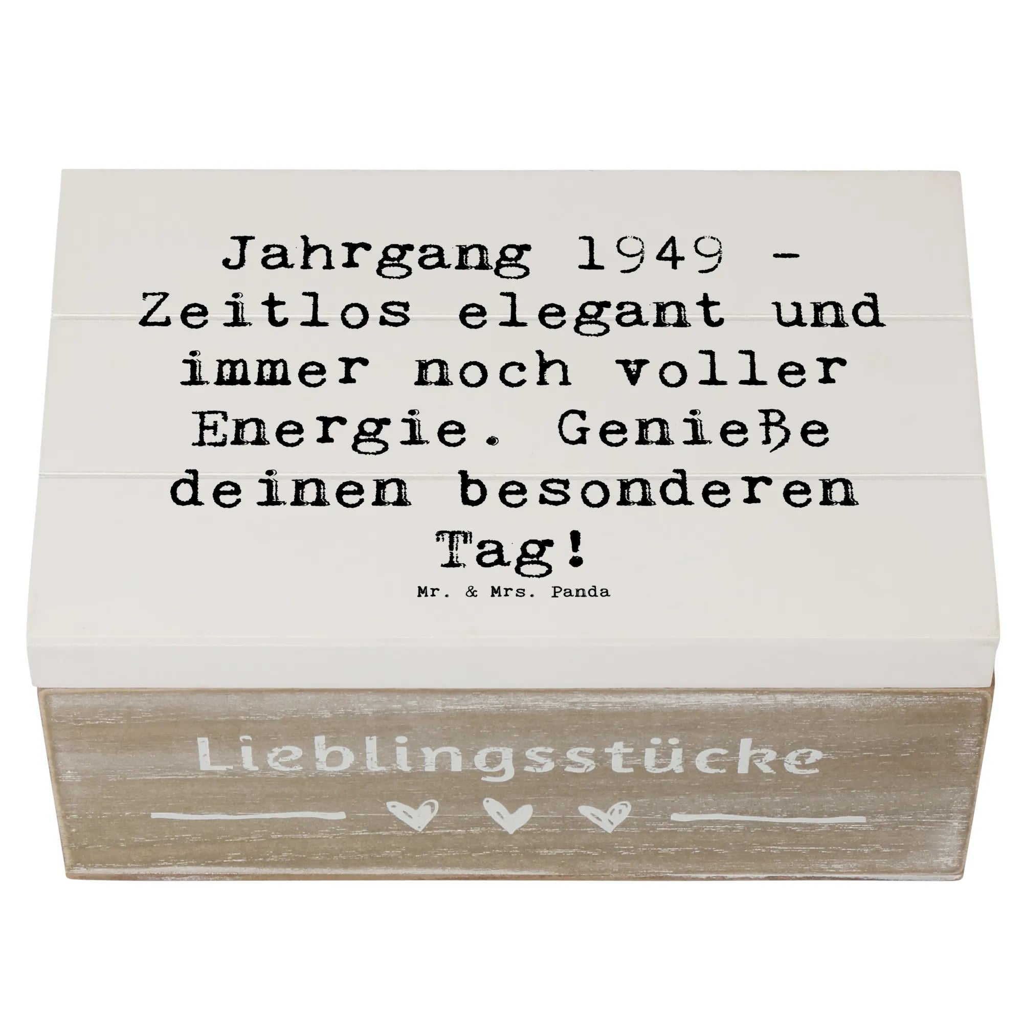 Die wunderschöne Holzkiste von Mr. & Mrs. Panda ist das perfekte Geschenk für alle, die 1949 das Licht der Welt erblickt haben. Diese Erinnerungskiste wird nicht nur mit einem zauberhaften Motiv bedruckt, sondern trägt auch den besonderen Spruch: "Jahrgang 1949 - Zeitlos elegant und immer noch voller Energie. Genieße deinen besonderen Tag!"