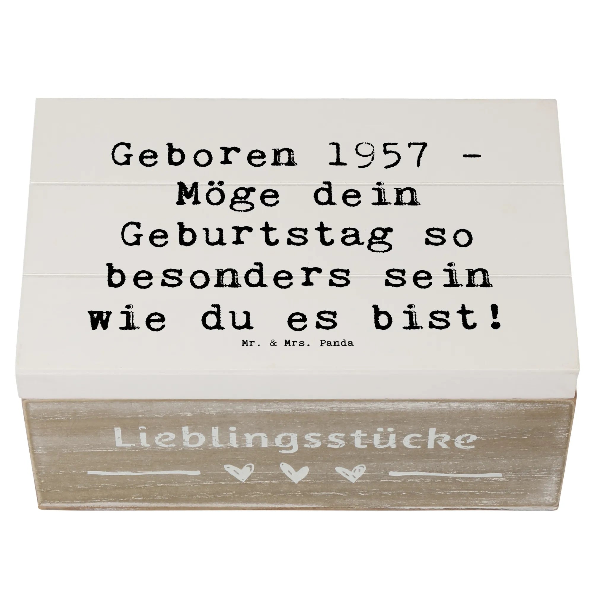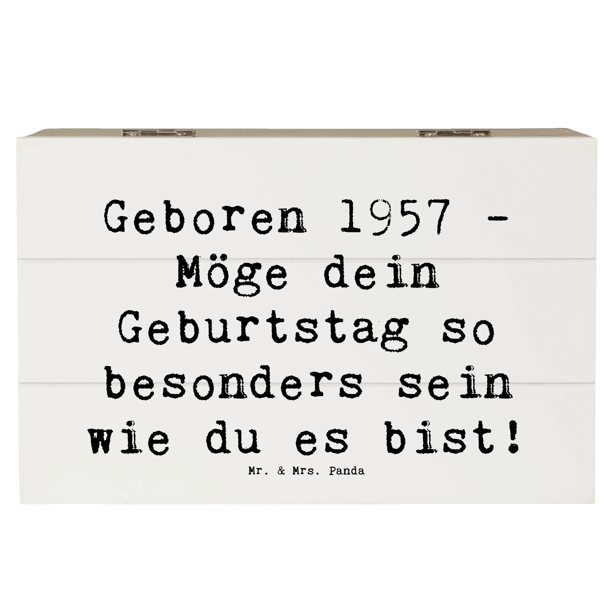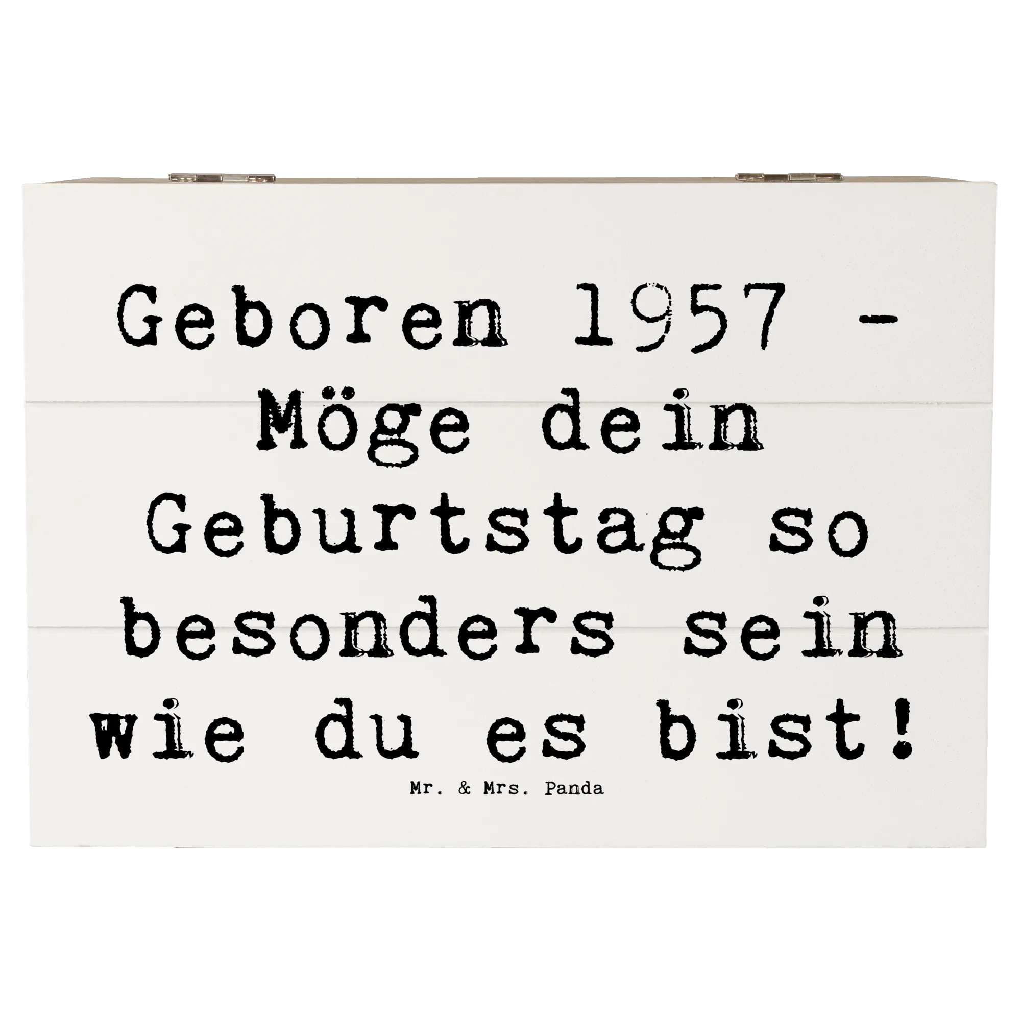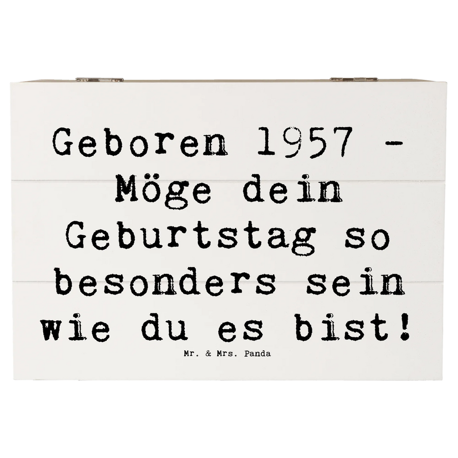 Die wunderschöne Holzkiste von Mr. & Mrs. Panda mit dem originellen Motiv "Geboren 1957 - Möge dein Geburtstag so besonders sein wie du es bist!" ist ein perfektes Geschenk für alle, die im Jahr 1957 das Licht der Welt erblickt haben. Diese hochwertige Erinnerungskiste kombiniert eine charmante Optik mit einer besonderen Funktionalität.