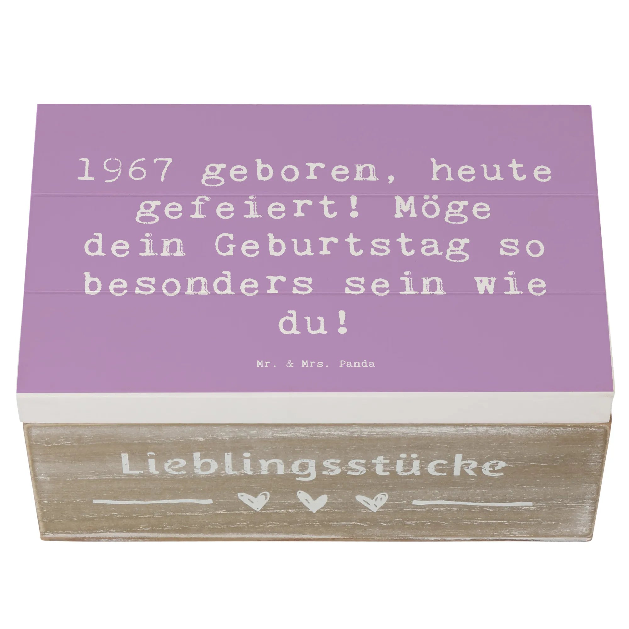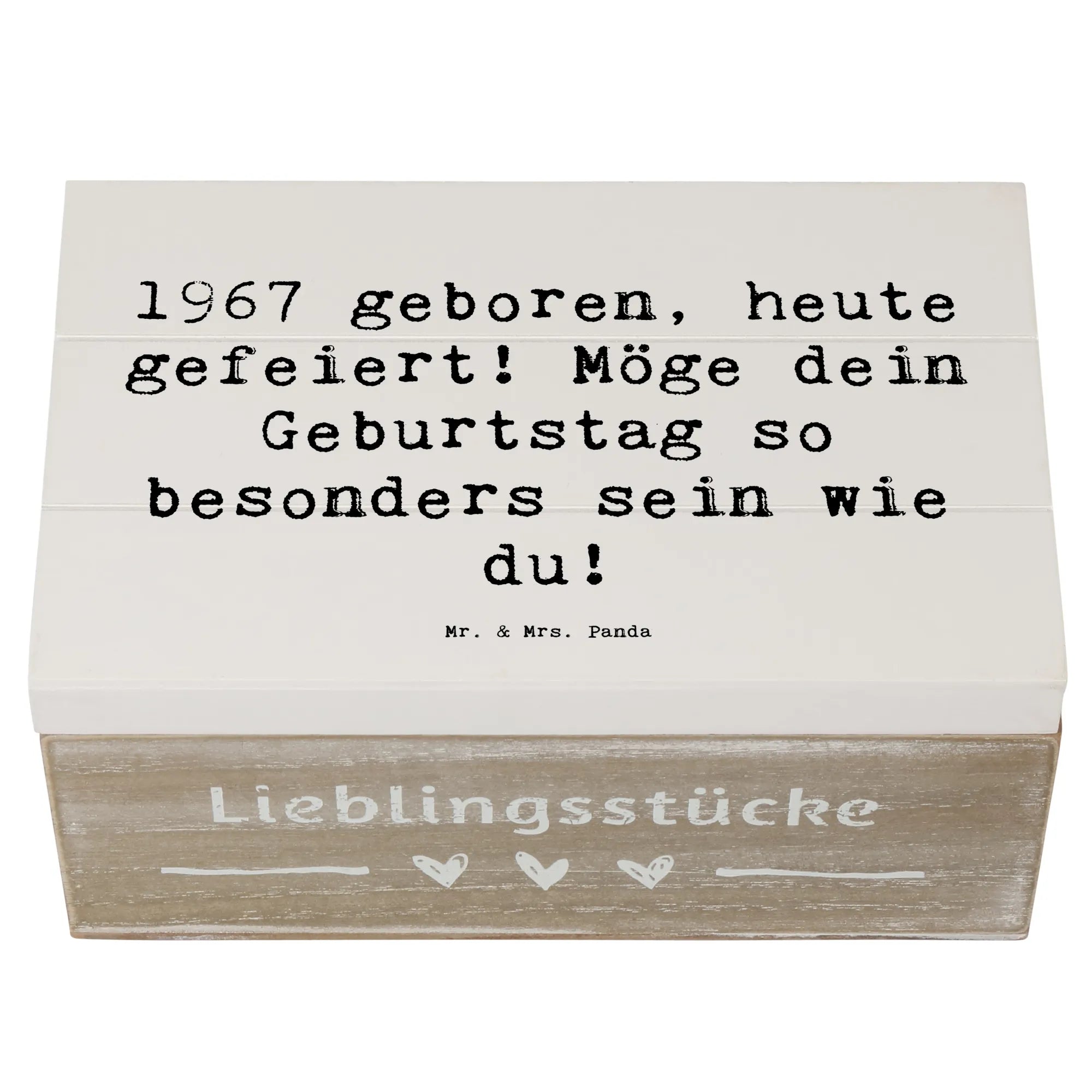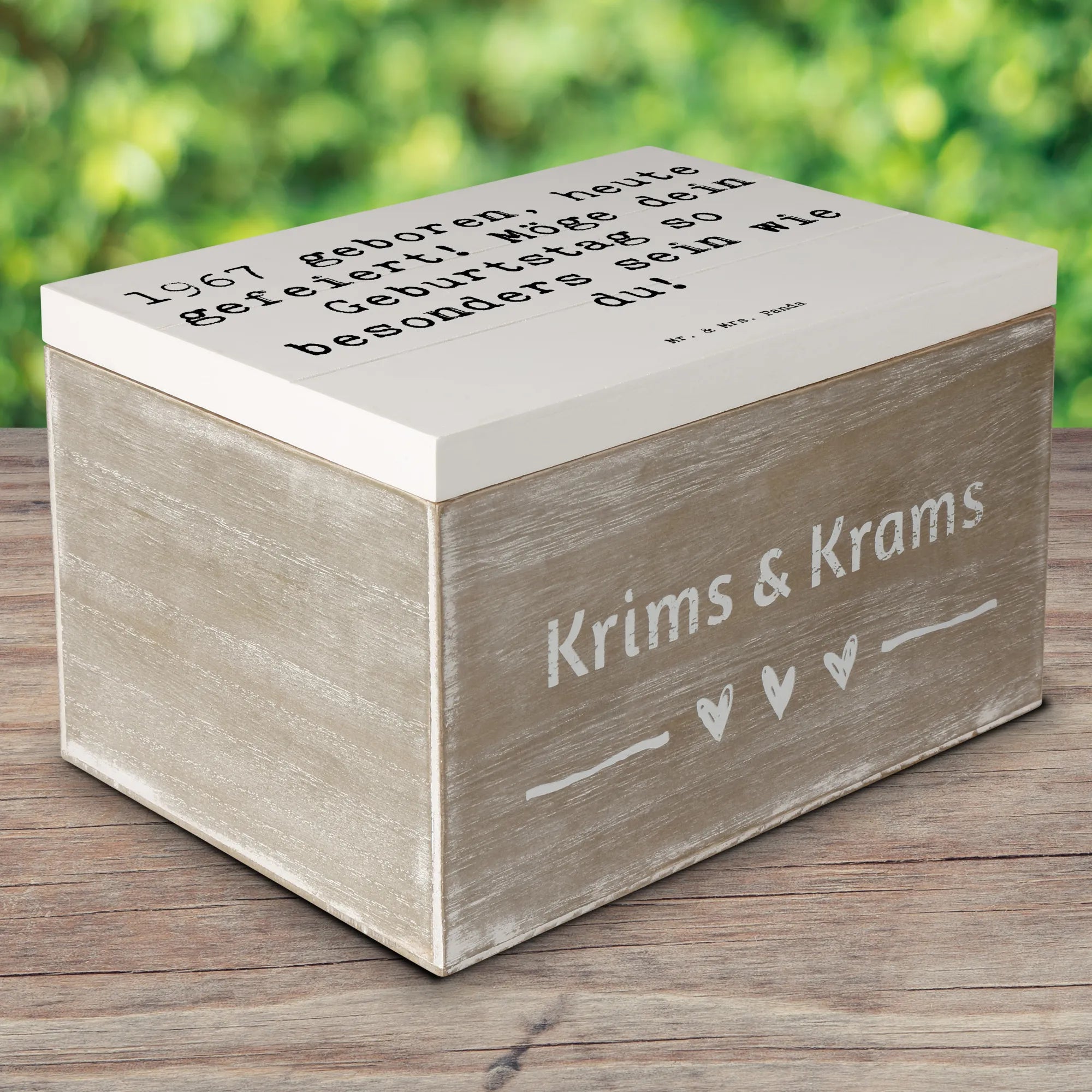 Mit dem liebevollen Motiv "1967 geboren, heute gefeiert! Möge dein Geburtstag so besonders sein wie du!" wird jedes Geschenk zu etwas ganz Besonderem. Die Kiste misst 190 mm x 120 mm x 100 mm und bietet ausreichend Platz für all deine Schätze, sei es für Erinnerungen aus der Kindheit, Fotos oder kleine Geschenke.