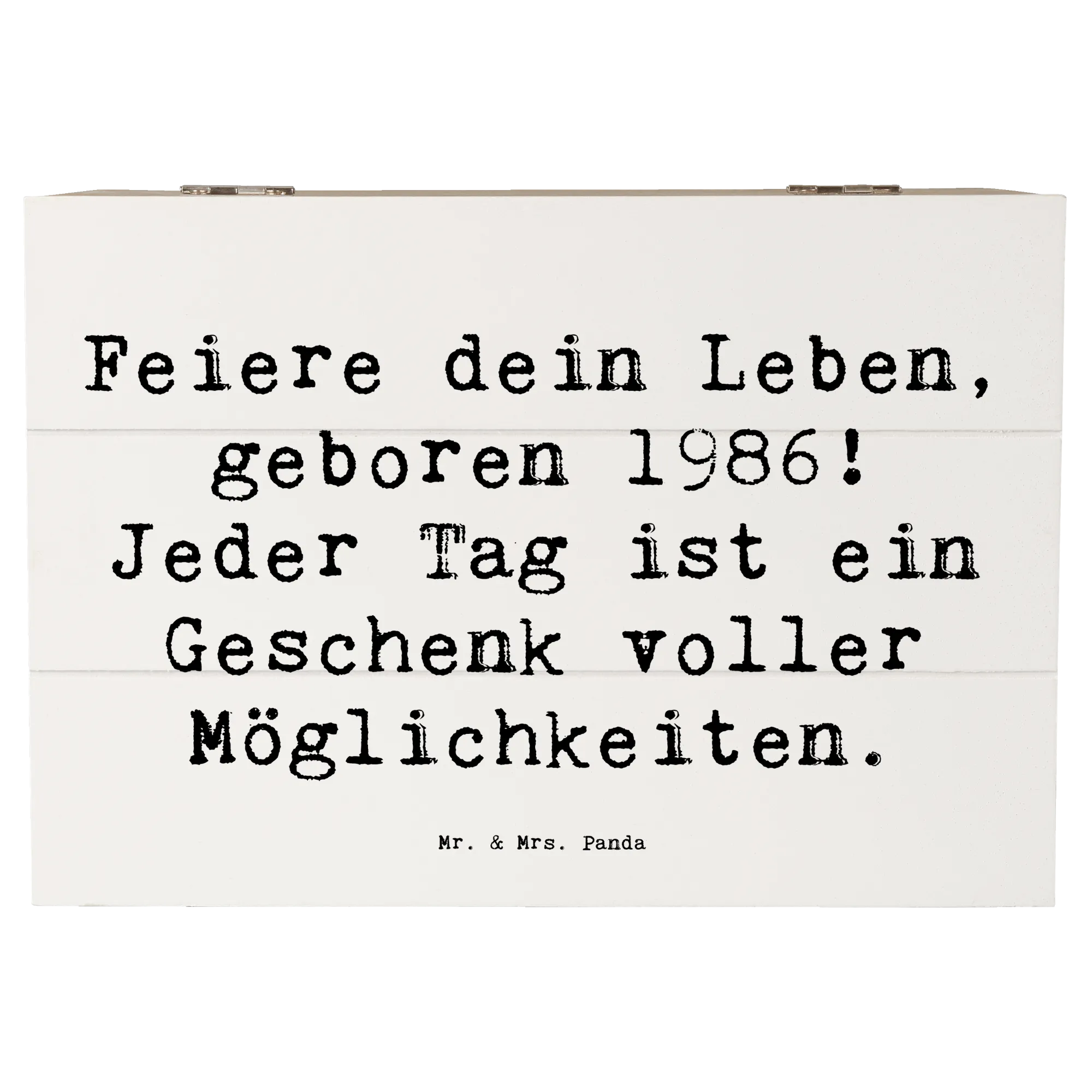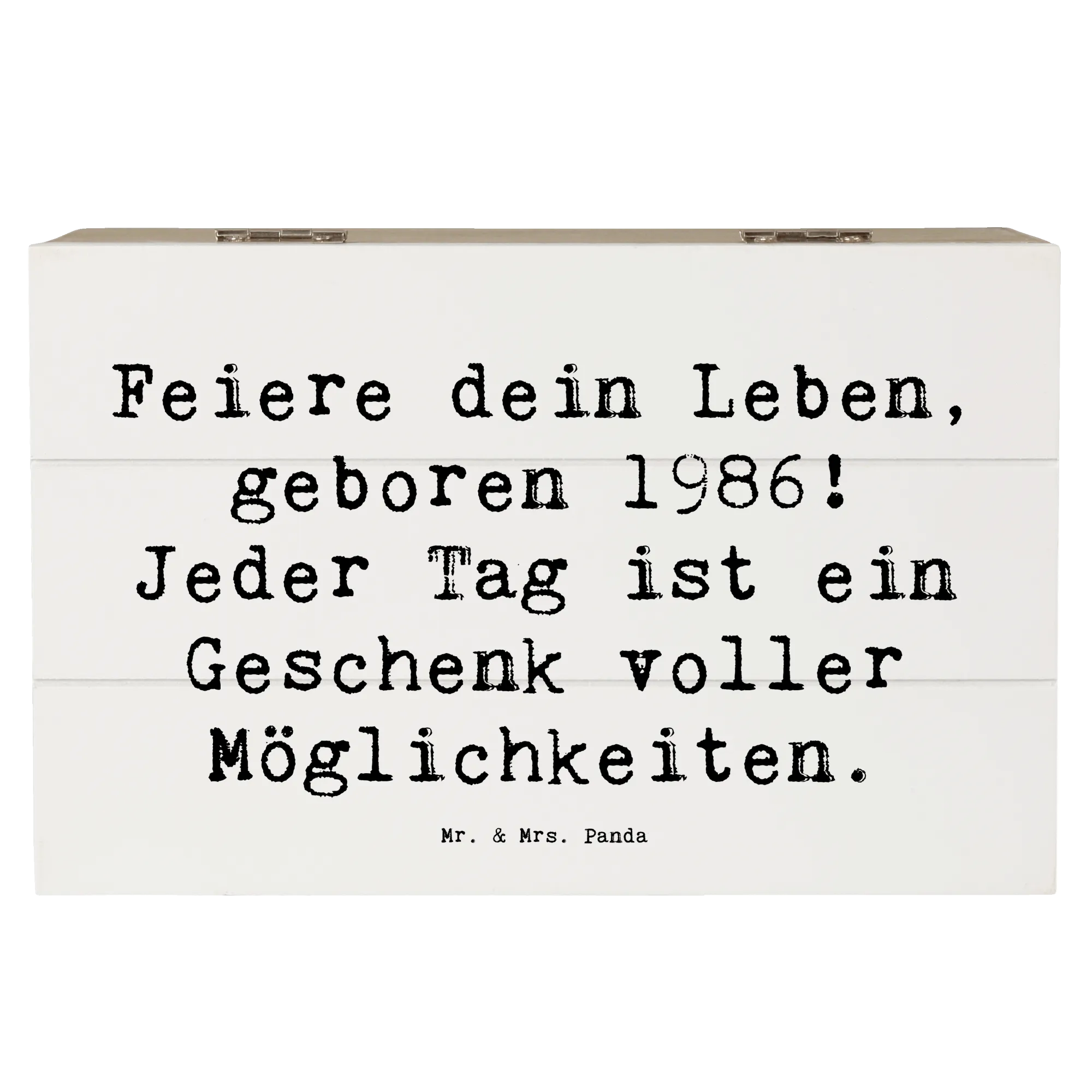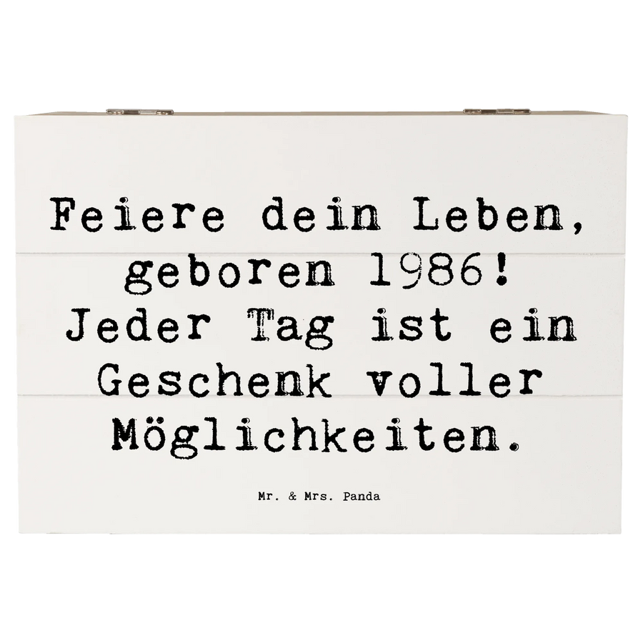 Die Holzkiste von Mr. & Mrs. Panda mit dem Motiv 1986 Geburtstag ist das perfekte Geschenk für all jene, die in diesem besonderen Jahr zur Welt kamen! Sie gehört zur einzigartigen Geburtstag Geburtsjahr-Kollektion und feiert das Leben auf ganz besondere Weise.