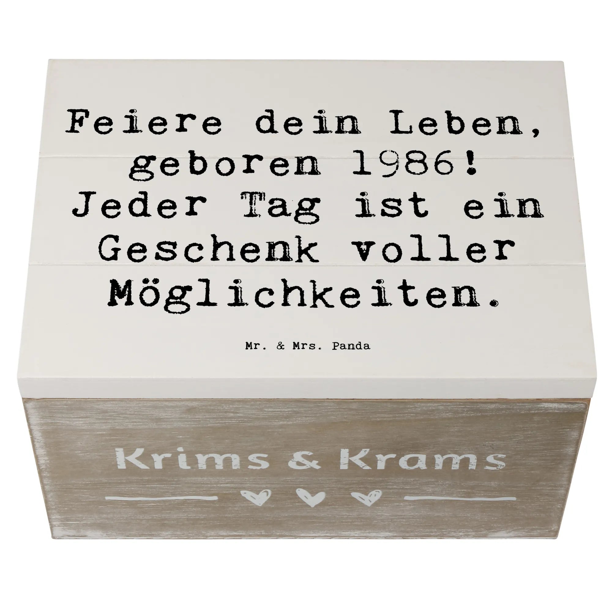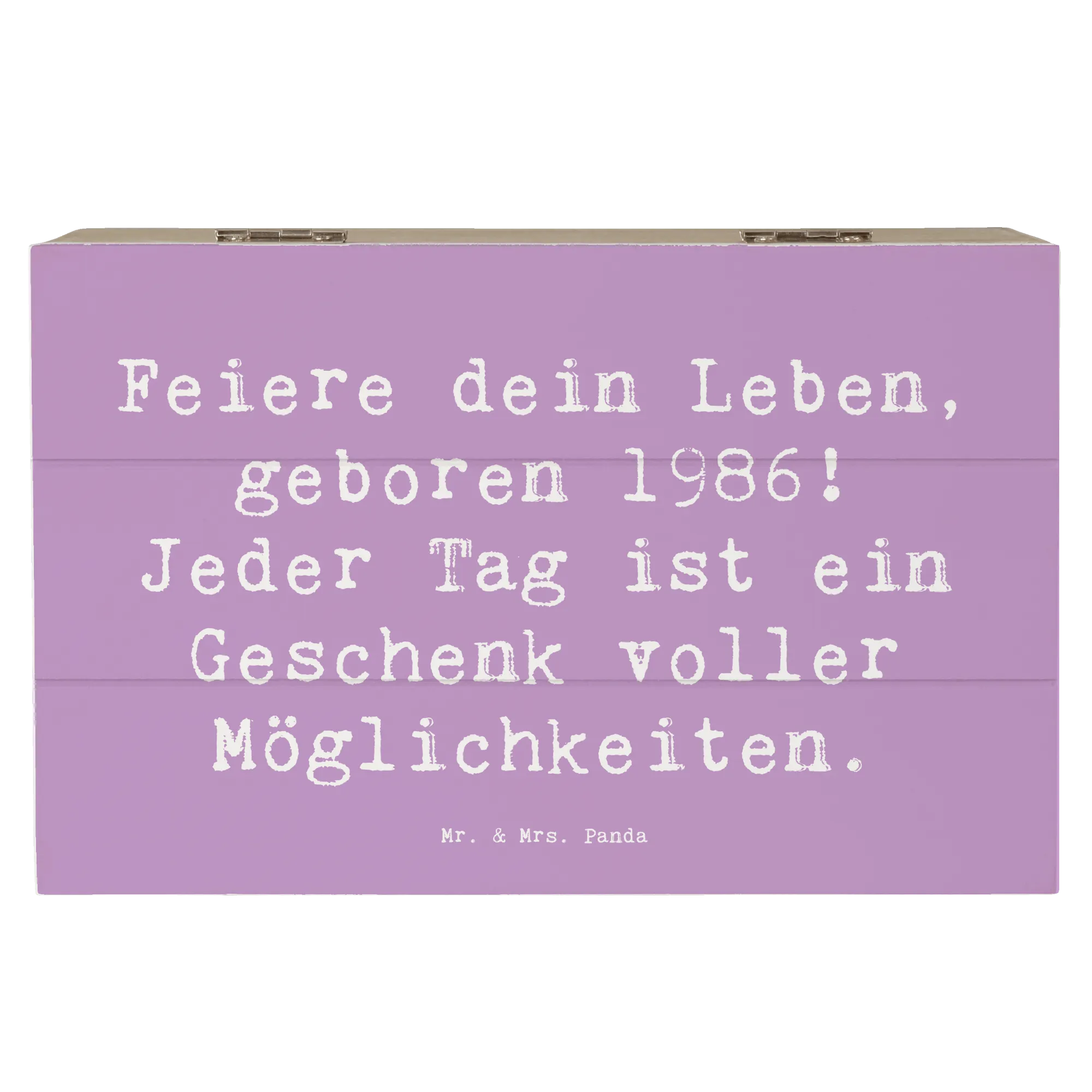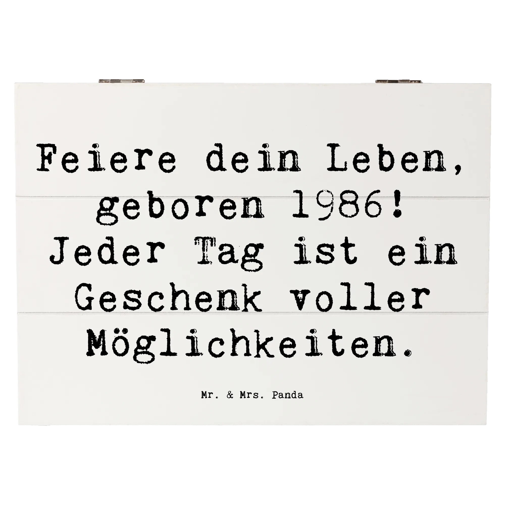 Die Holzkiste von Mr. & Mrs. Panda mit dem Motiv 1986 Geburtstag ist das perfekte Geschenk für all jene, die in diesem besonderen Jahr zur Welt kamen! Sie gehört zur einzigartigen Geburtstag Geburtsjahr-Kollektion und feiert das Leben auf ganz besondere Weise.