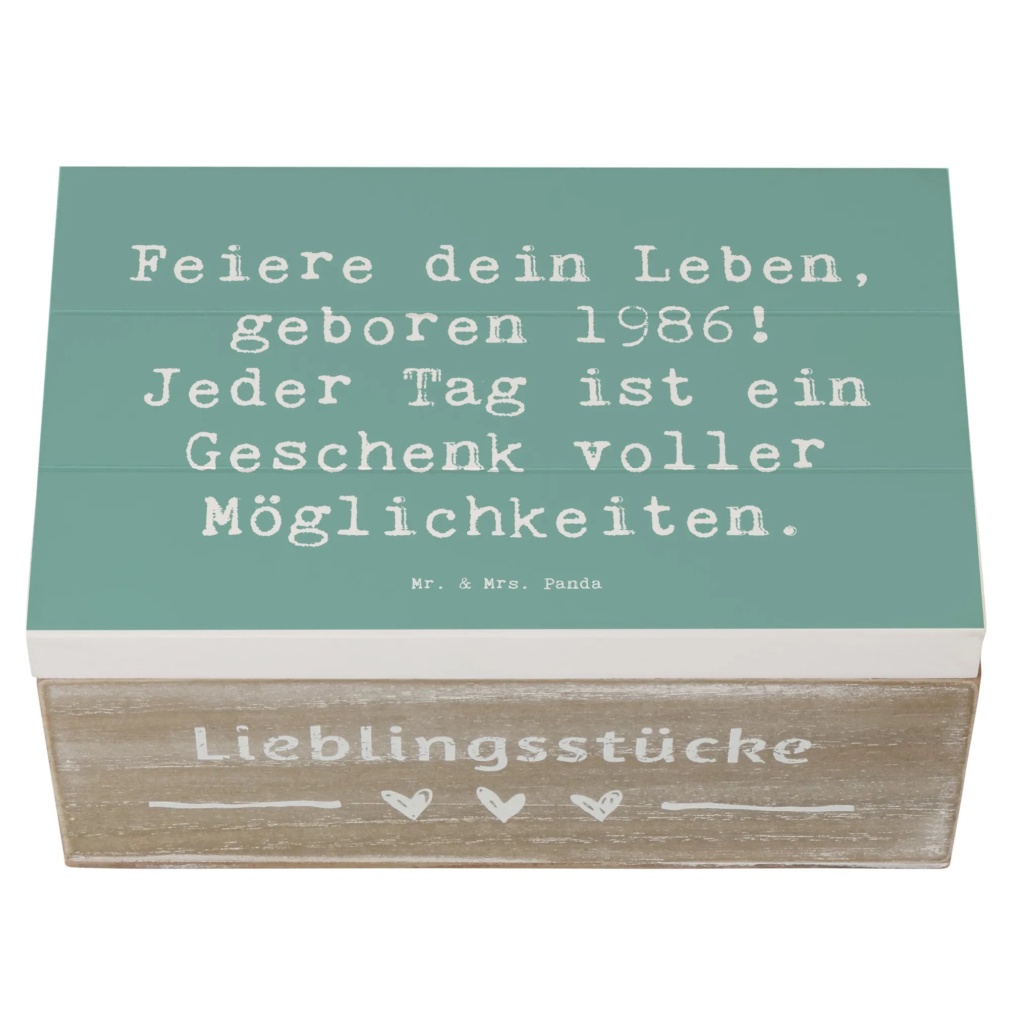 Entdecke die bezaubernde Holzkiste von Mr. & Mrs. Panda, die ideal für alle Geburtstagskinder ist, die im Jahr 1986 das Licht der Welt erblickt haben. Diese wunderschöne Erinnerungskiste ist nicht nur ein praktischer Aufbewahrungsort für all deine persönlichen Schätze, sondern auch ein liebevolles Geschenk, das bleibt. Mit dem Motto "Feiere dein Leben, geboren 1986! Jeder Tag ist ein Geschenk voller Möglichkeiten." bringt diese Kiste einen Hauch von Nostalgie und Lebensfreude in jeden Raum. Perfekt für Fotodokumentationen von Festen wie Kommunion oder Konfirmation, wird diese Schatulle zum Herzstück deiner Erinnerungen.