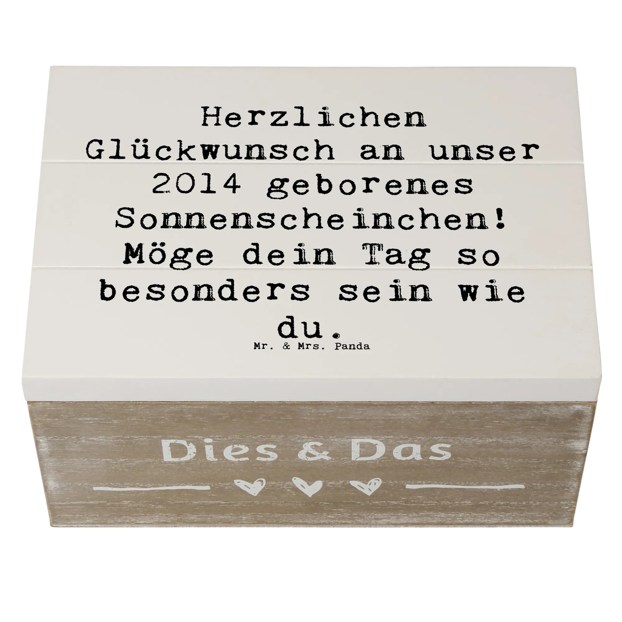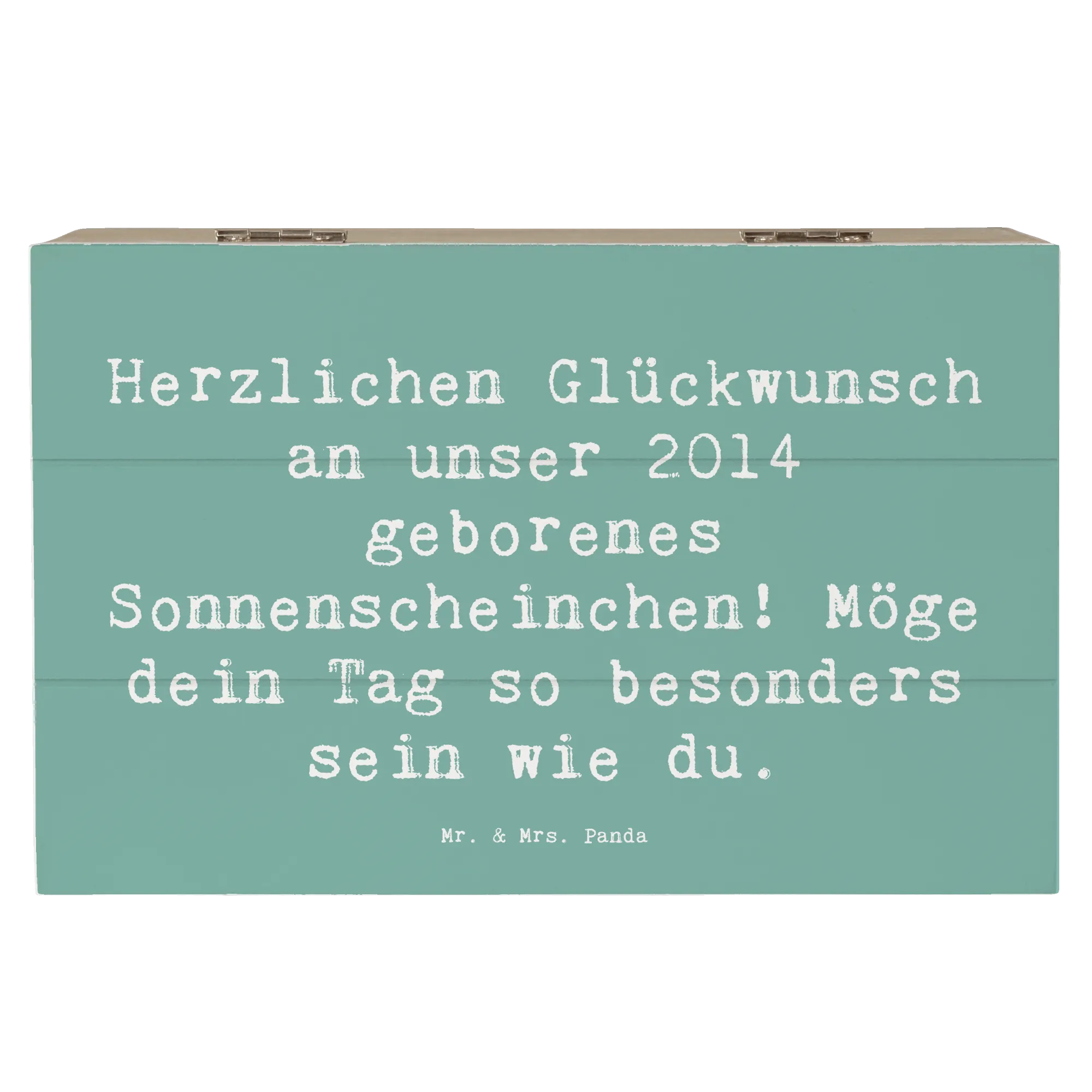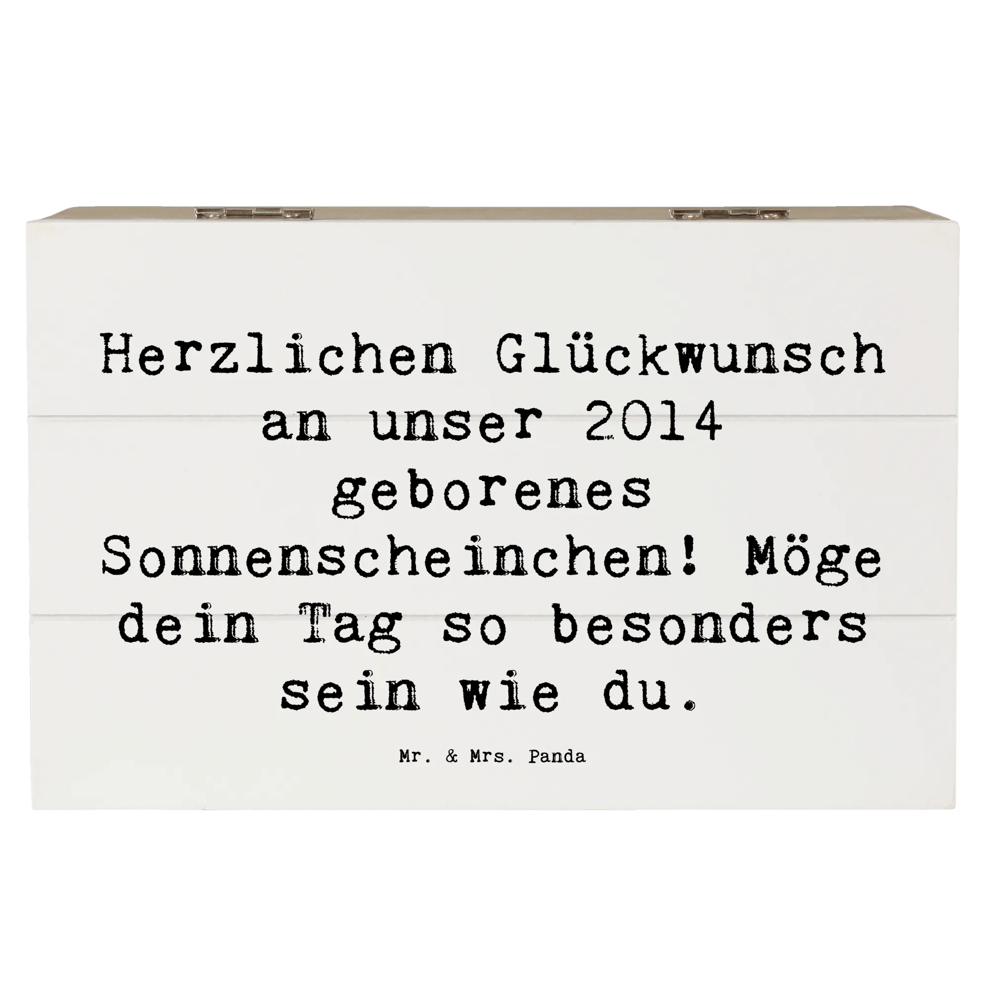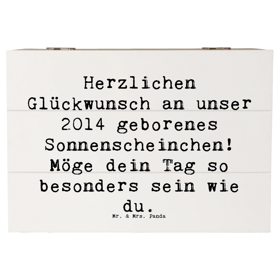 Die wunderschöne Holzkiste von Mr. & Mrs. Panda ist das perfekte Geschenk für alle, die 2014 geboren wurden! Mit dem liebevollen Slogan 'Herzlichen Glückwunsch an unser 2014 geborenes Sonnenscheinchen! Möge dein Tag so besonders sein wie du.' wird diese Kiste zu einem echten Hingucker. Diese Erinnerungskiste ist nicht nur ein stilvoller Aufbewahrungsort für all die besonderen Schätze Deines kleinen Lieblings, sondern auch ein tolles Deko-Element für jedes Kinderzimmer.
