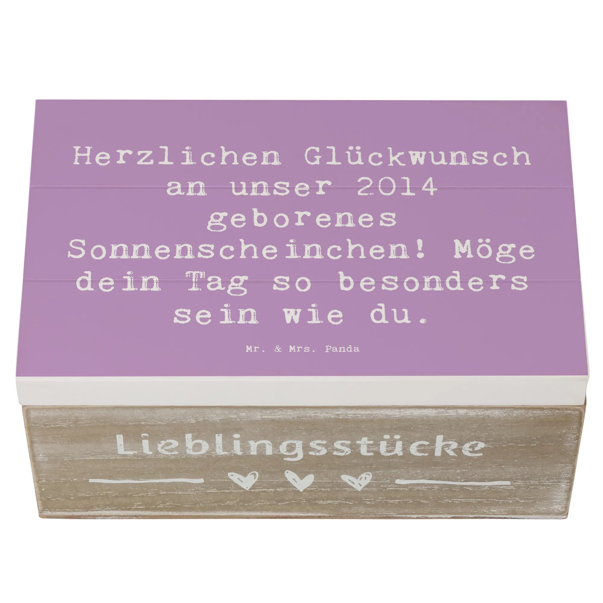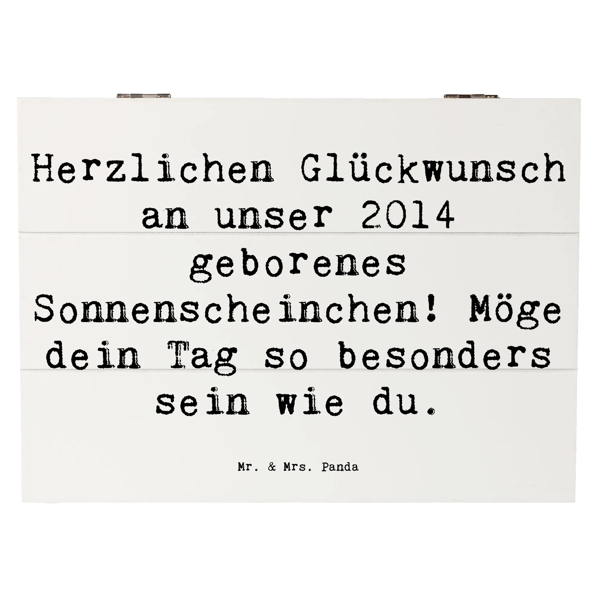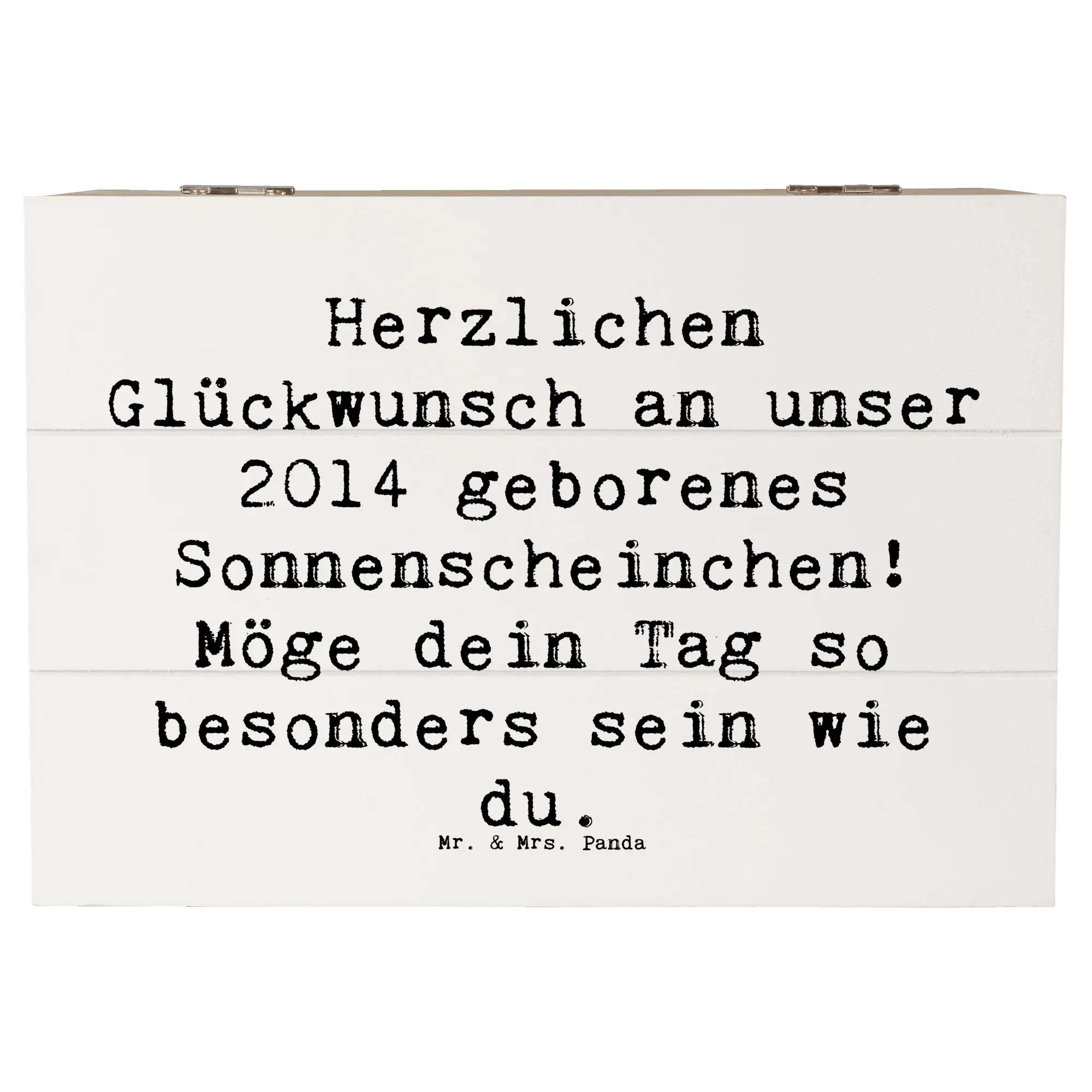 Die wunderschöne Holzkiste von Mr. & Mrs. Panda ist das perfekte Geschenk für alle, die 2014 geboren wurden! Mit dem liebevollen Slogan 'Herzlichen Glückwunsch an unser 2014 geborenes Sonnenscheinchen! Möge dein Tag so besonders sein wie du.' wird diese Kiste zu einem echten Hingucker. Diese Erinnerungskiste ist nicht nur ein stilvoller Aufbewahrungsort für all die besonderen Schätze Deines kleinen Lieblings, sondern auch ein tolles Deko-Element für jedes Kinderzimmer.