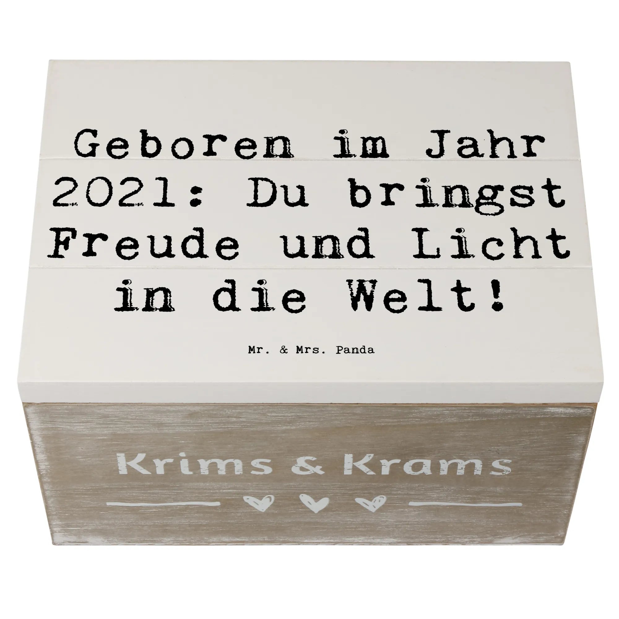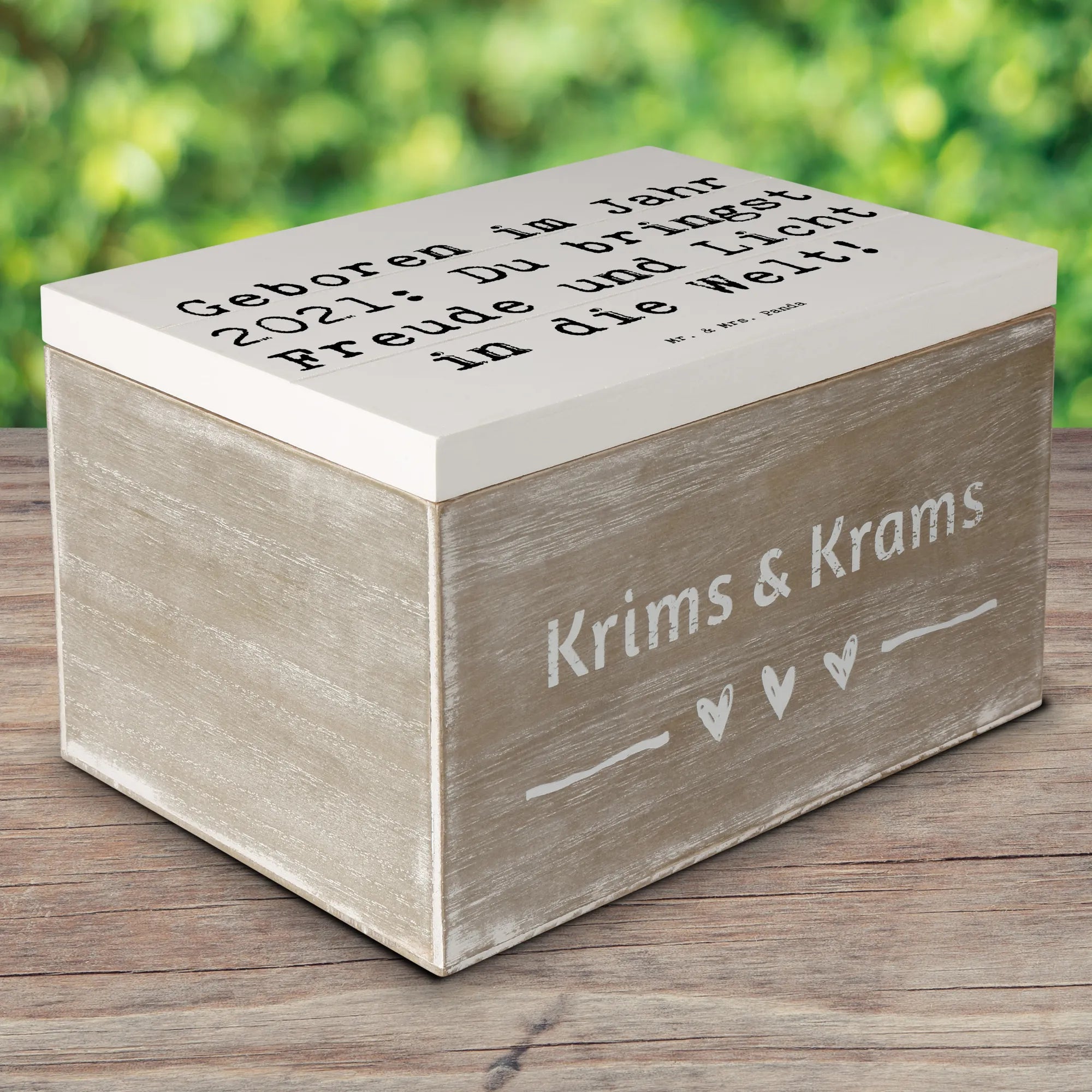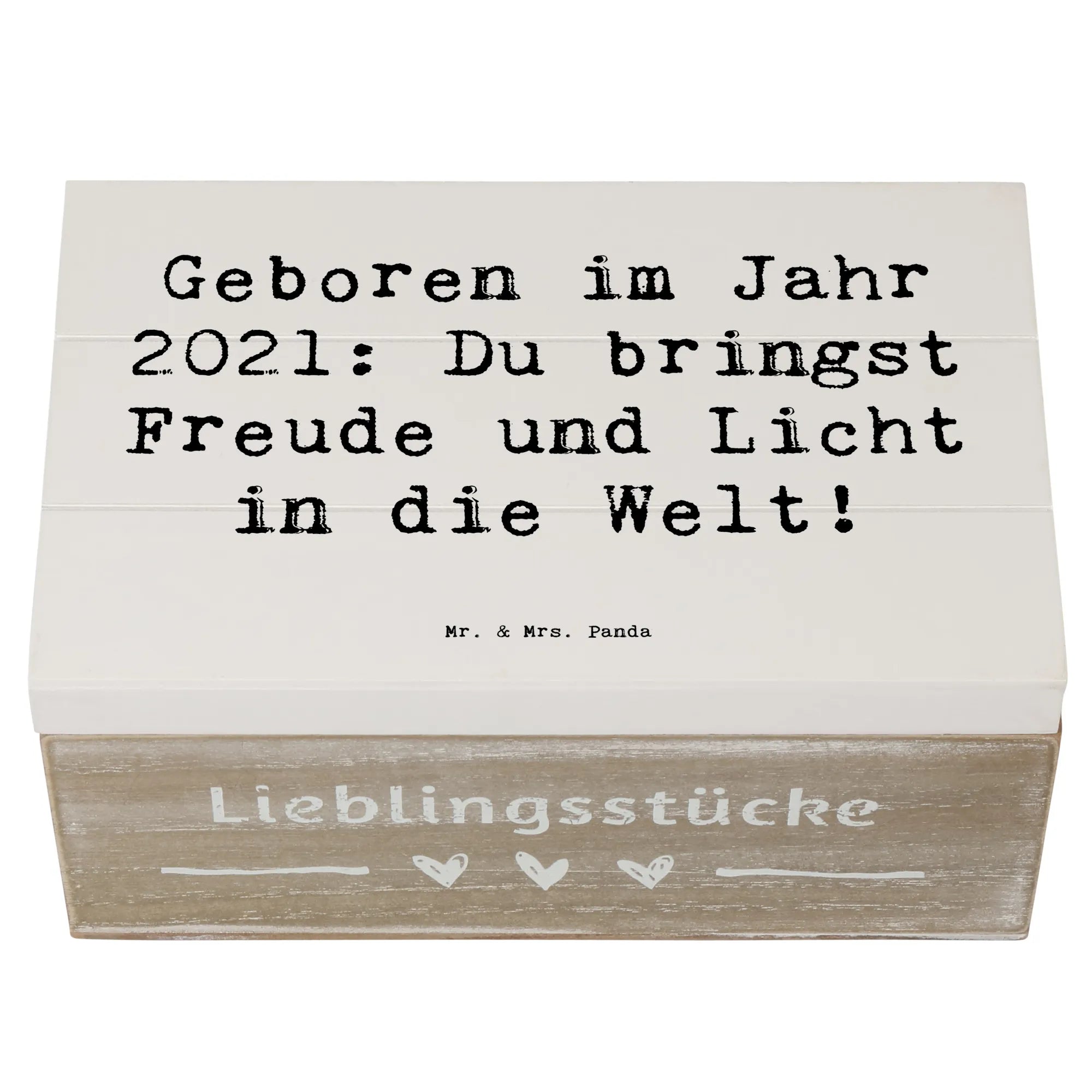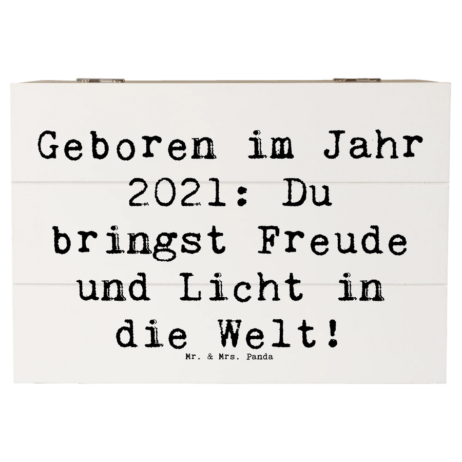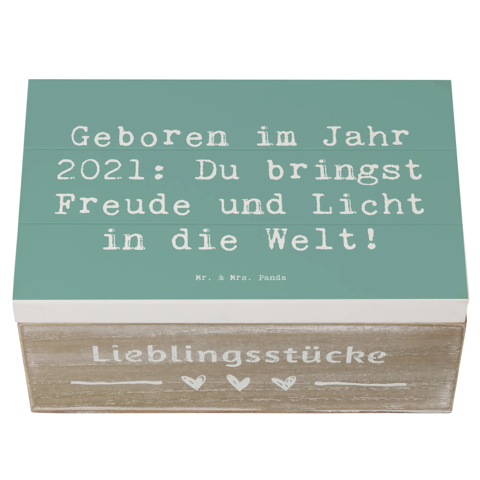 Das besondere Design mit dem Spruch 'Geboren im Jahr 2021: Du bringst Freude und Licht in die Welt!' macht sie zu etwas Einzigartigem. Liebe und Kreativität fließen in jedes Detail, und so wurde auch dieses Motiv von der talentierten Mrs. Panda handgezeichnet. Diese Holzkiste ist nicht nur eine dekorative Aufbewahrungsbox, sondern ein echtes Schmuckstück, das jeden Raum aufwertet.