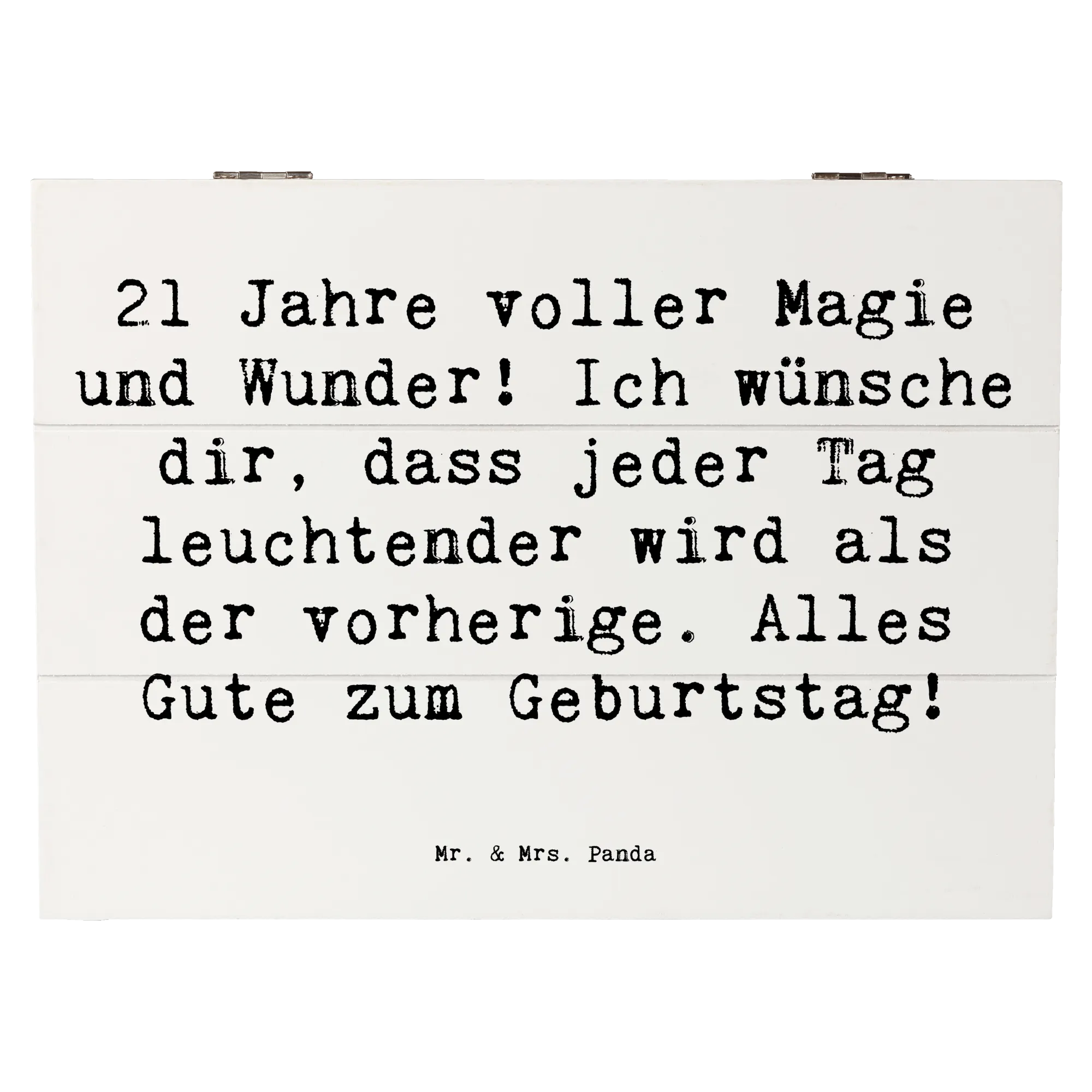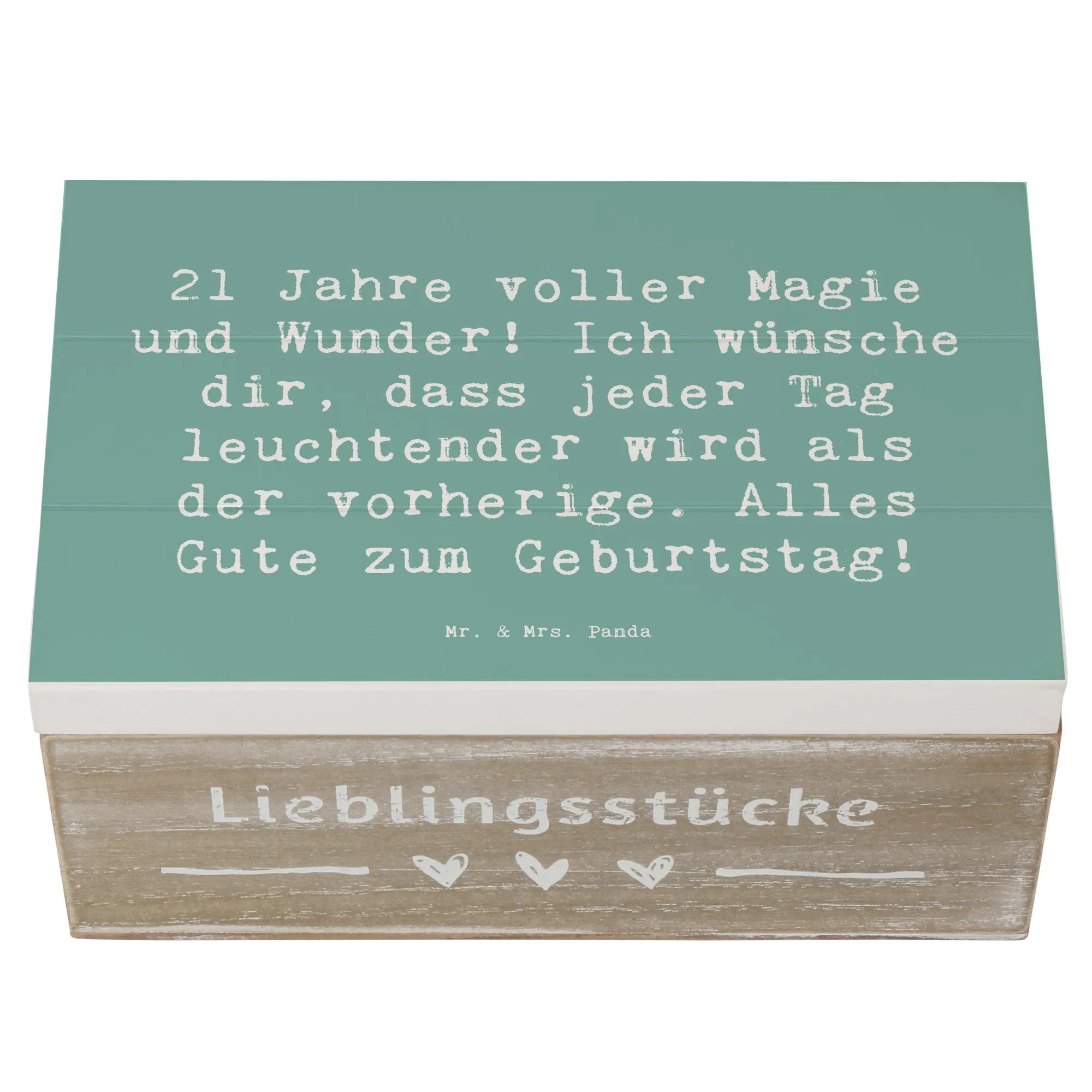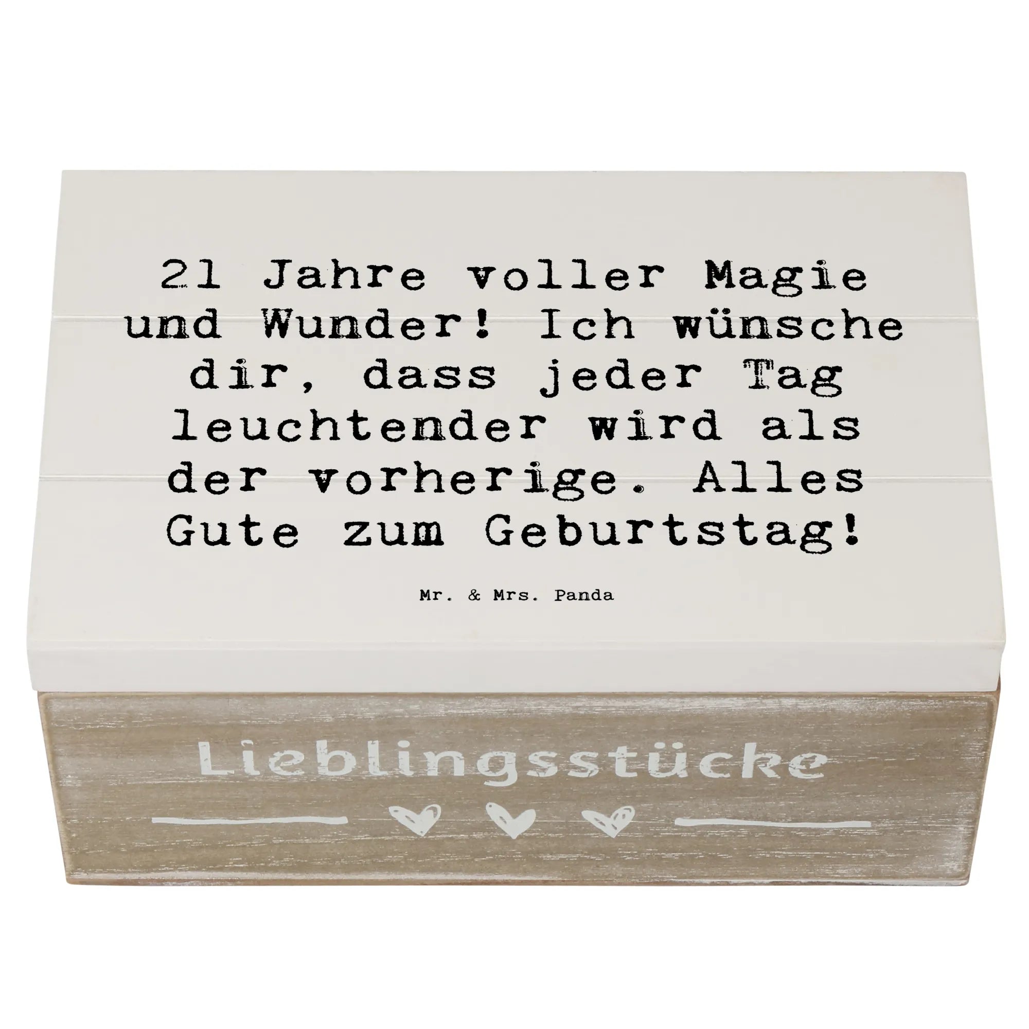 Die wunderschöne Holzkiste von Mr. & Mrs. Panda ist der perfekte Begleiter für alle, die ihren 21. Geburtstag gebührend feiern möchten! Mit dem zauberhaften Motiv "21 Jahre voller Magie und Wunder! Ich wünsche dir, dass jeder Tag leuchtender wird als der vorherige. Alles Gute zum Geburtstag!" wird diese Erinnerungskiste schnell zum Hingucker bei jeder Feier. Sie ist nicht nur ein tolles Geburtsgeschenk, sondern auch eine stilvolle Dekokiste für all die wertvollen Erinnerungen, die du im Laufe der Jahre gesammelt hast.