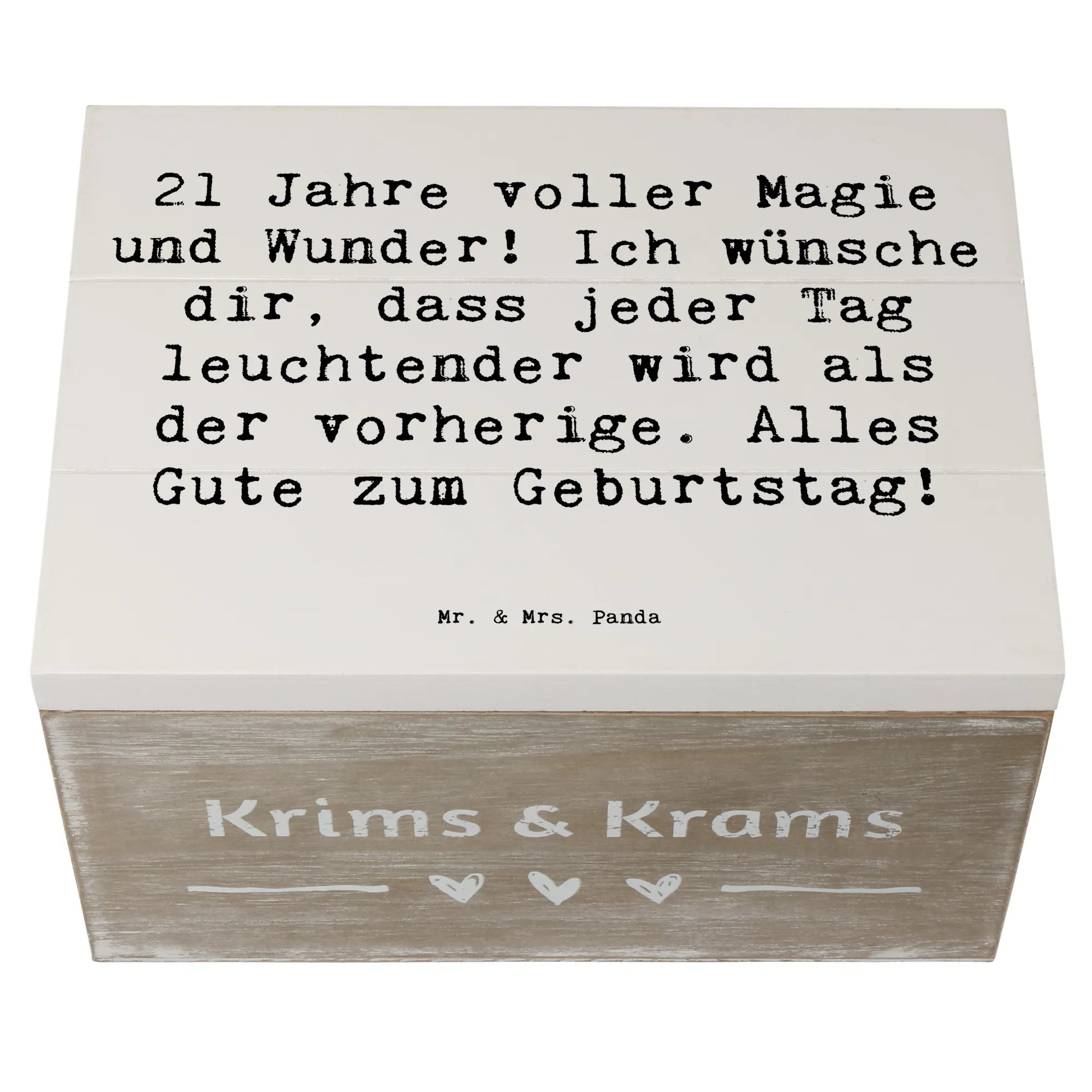 Gönn dir oder deinem Liebsten etwas ganz Besonderes – die Holzkiste von Mr. & Mrs. Panda ist ein liebevolles Geschenk, das mit Sicherheit für ein Lächeln sorgt und dazu inspirieren wird, das Leben in vollen Zügen zu genießen. Mach diesen 21. Geburtstag unvergesslich!