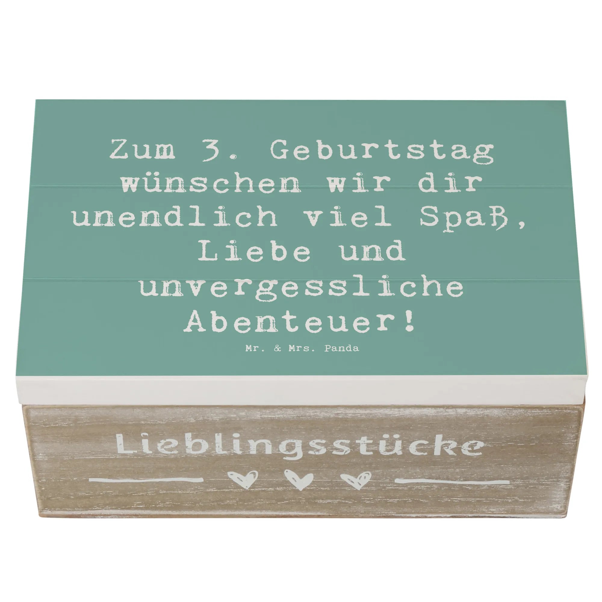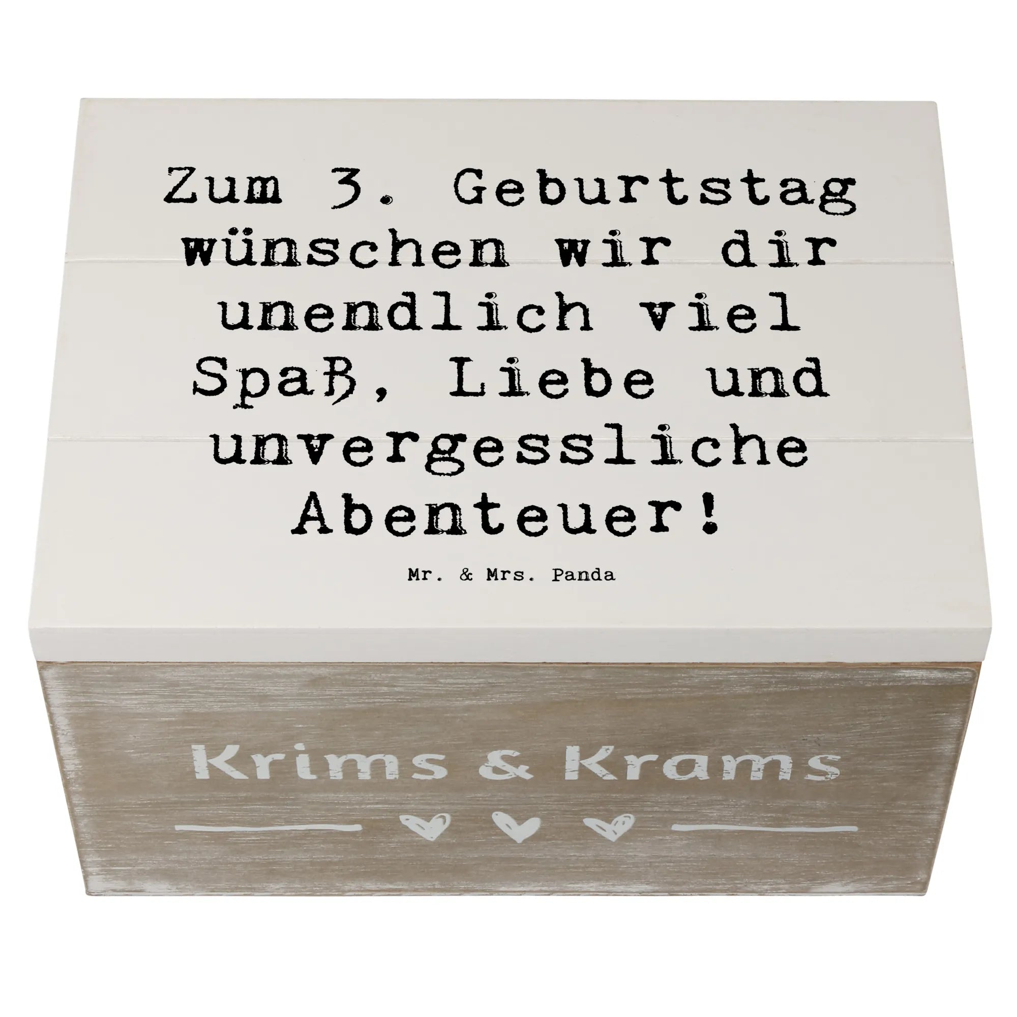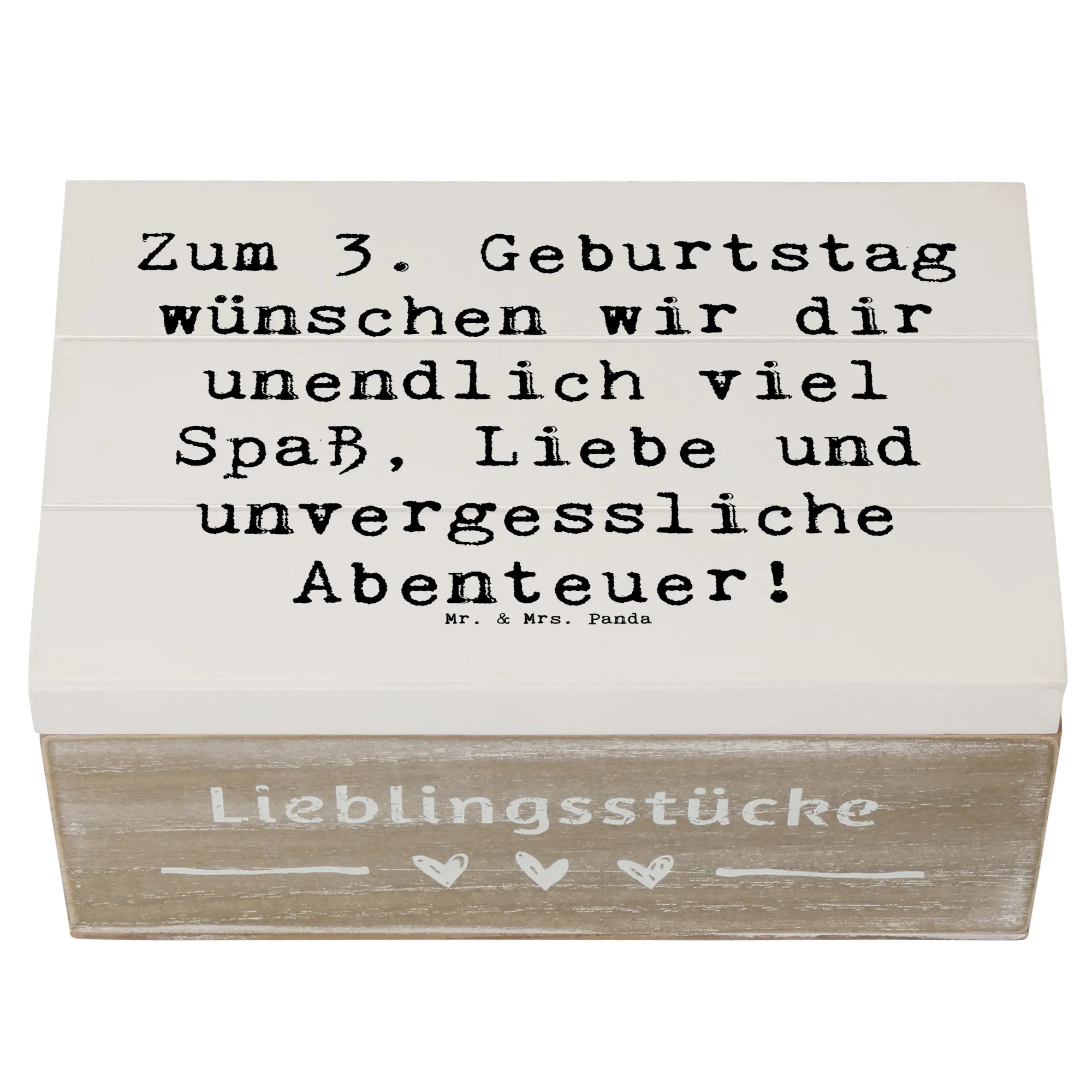 Die wunderschöne Holzkiste von Mr. & Mrs. Panda ist das ideale Geschenk zum 3. Geburtstag! Mit einem liebevoll gestalteten Motiv, das den Spruch "Zum 3. Geburtstag wünschen wir dir unendlich viel Spaß, Liebe und unvergessliche Abenteuer!" trägt, wird diese Erinnerungskiste schnell zum Lieblingsaufbewahrungsort für all die kostbaren Schätze und Erinnerungen deines Kindes.