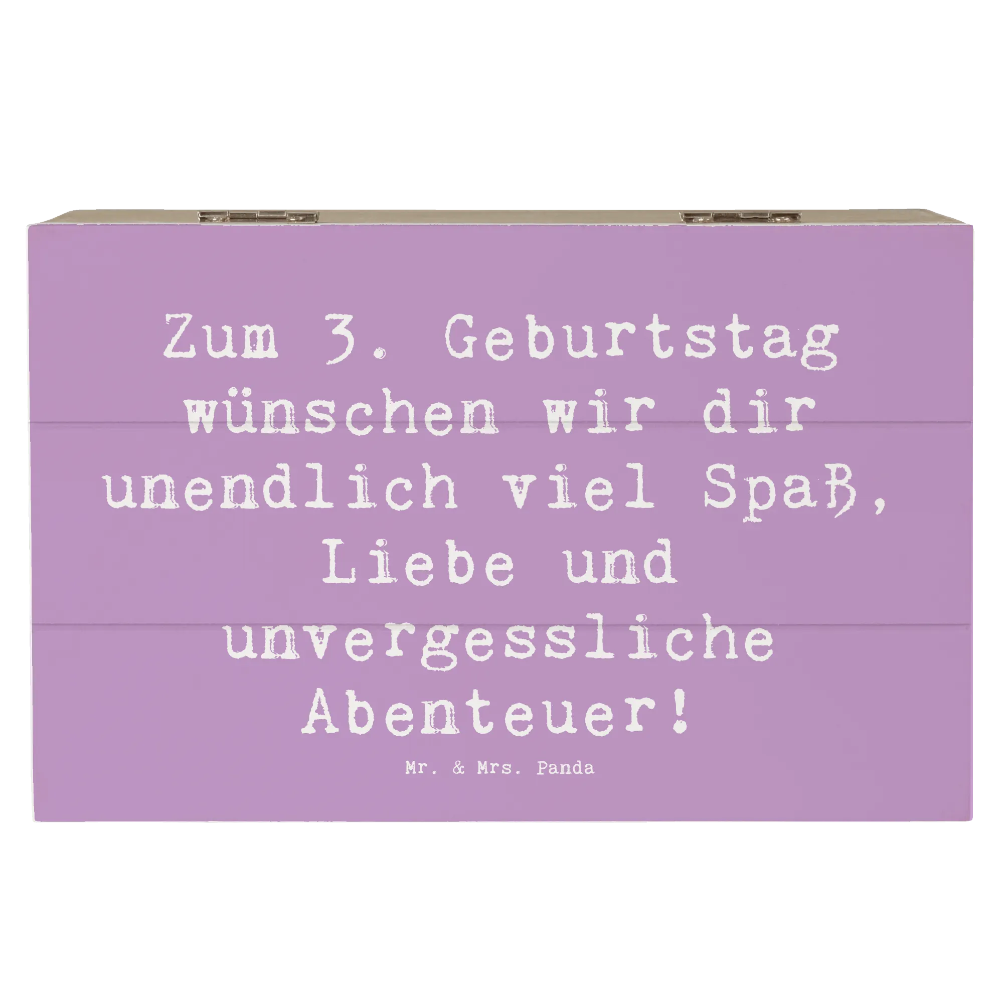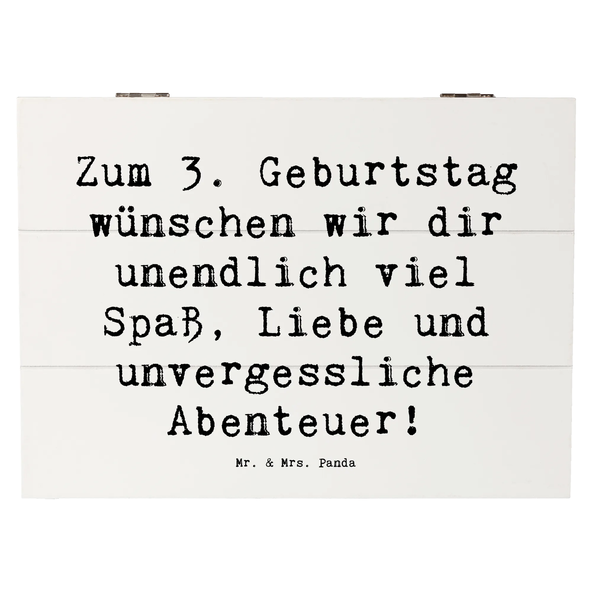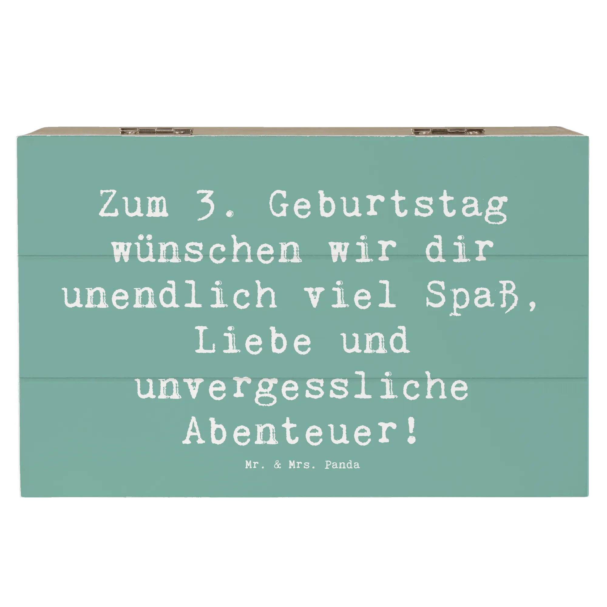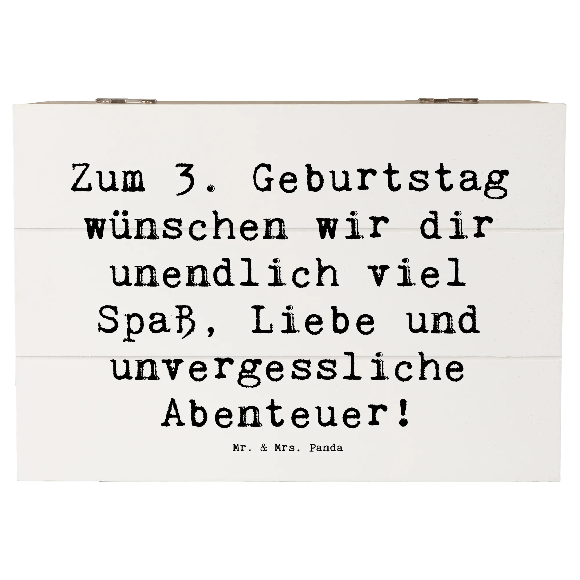 Die wunderschöne Holzkiste von Mr. & Mrs. Panda ist das ideale Geschenk zum 3. Geburtstag! Mit einem liebevoll gestalteten Motiv, das den Spruch "Zum 3. Geburtstag wünschen wir dir unendlich viel Spaß, Liebe und unvergessliche Abenteuer!" trägt, wird diese Erinnerungskiste schnell zum Lieblingsaufbewahrungsort für all die kostbaren Schätze und Erinnerungen deines Kindes.