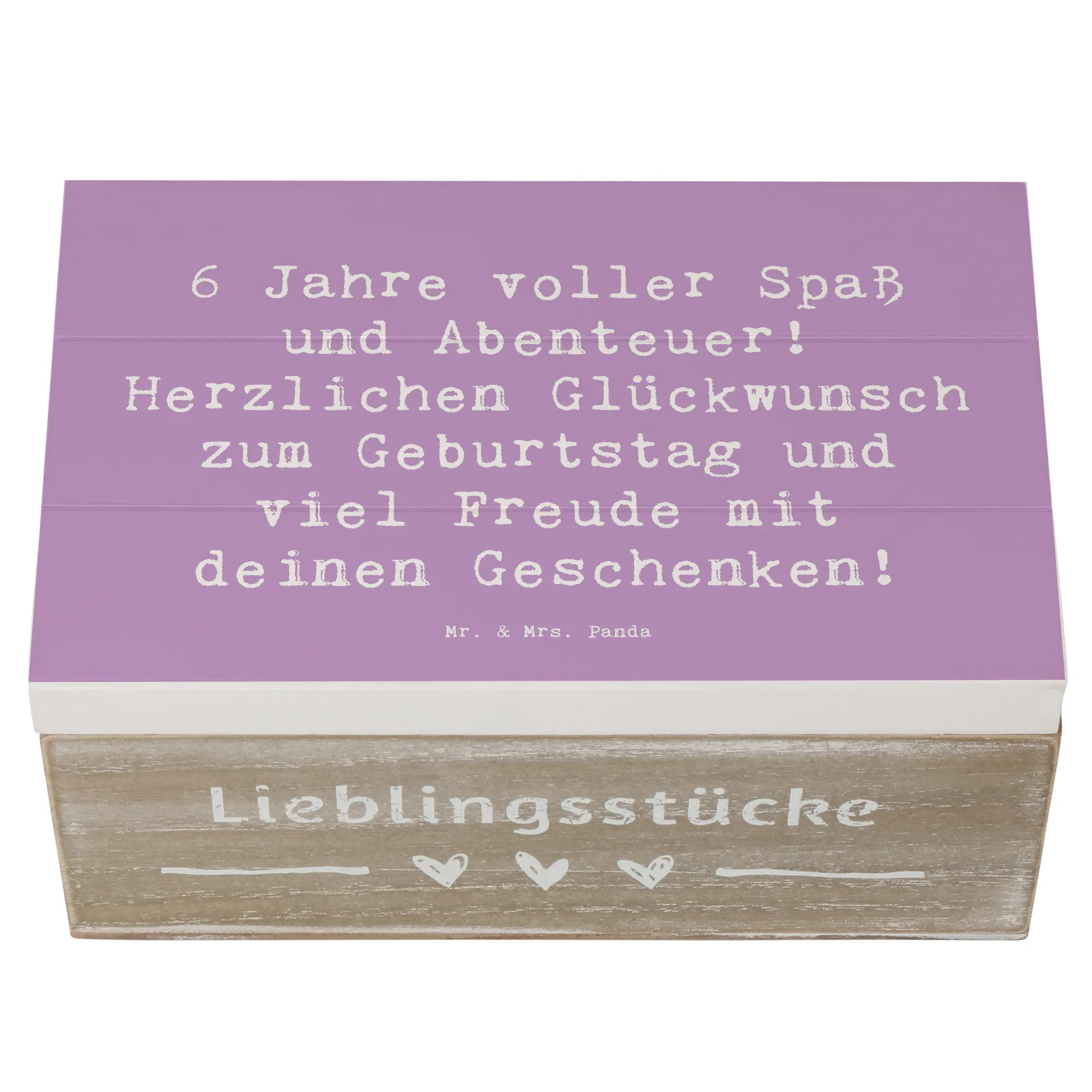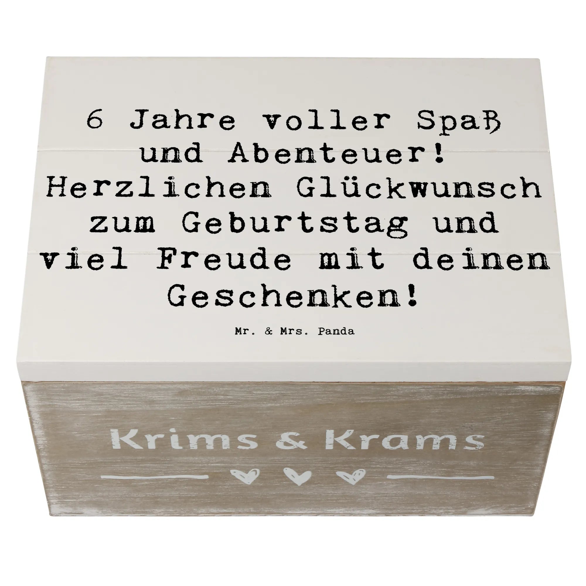 Entdecke die wundervolle Holzkiste von Mr. & Mrs. Panda, die nicht nur als dekorativer Hingucker dient, sondern auch die perfekte Aufbewahrungsbox für all deine Schätze ist! Diese zauberhafte Kiste ist speziell für den 6. Geburtstag konzipiert und spricht mit dem liebevollen Slogan: "6 Jahre voller Spaß und Abenteuer! Herzlichen Glückwunsch zum Geburtstag und viel Freude mit deinen Geschenken!".