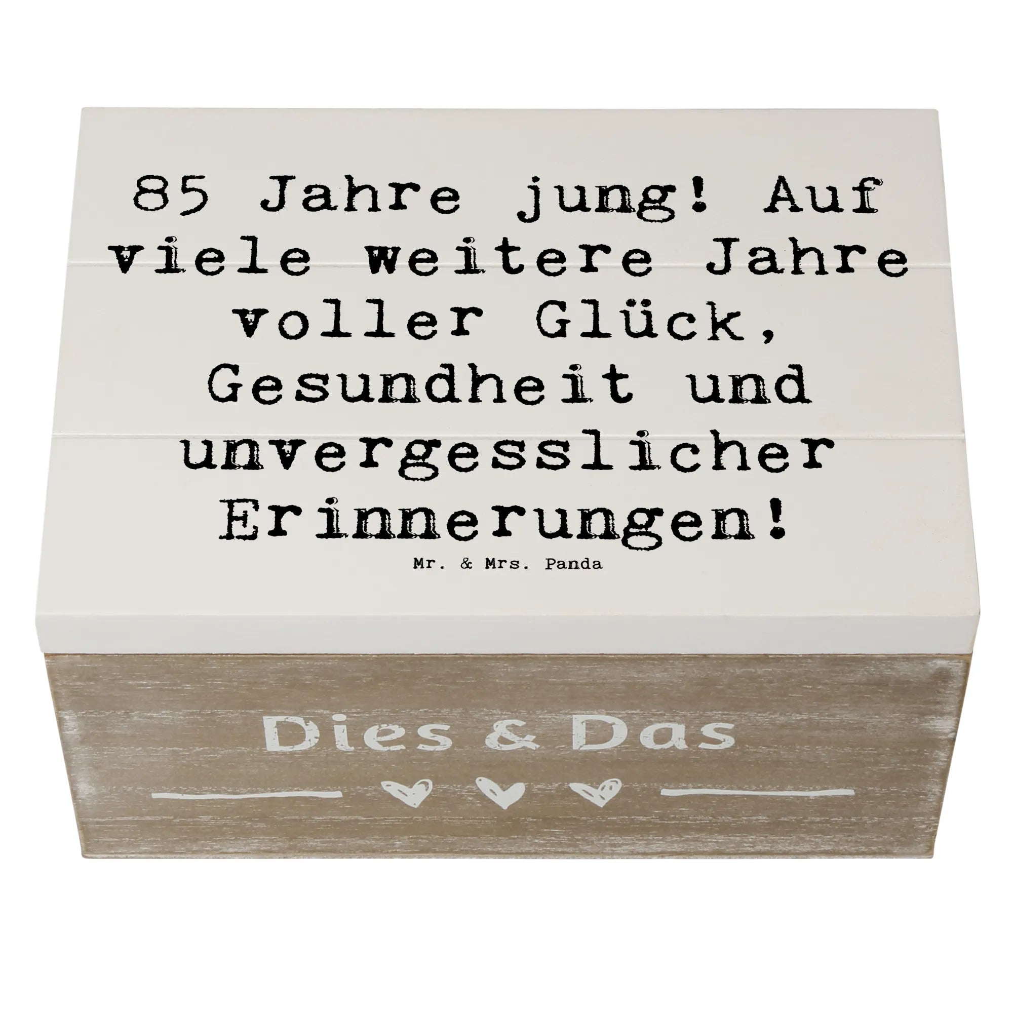 Die wunderschöne Holzkiste von Mr. & Mrs. Panda zum 85. Geburtstag bringt Freude und Erinnerungen in dein Leben! Mit dem Spruch "85 Jahre jung! Auf viele weitere Jahre voller Glück, Gesundheit und unvergesslicher Erinnerungen!" ist sie das perfekte Geschenk für einen besonderen Menschen, der diesen Meilenstein feiert. Diese Erinnerungskiste ist nicht nur ein dekoratives Element, sondern auch ein praktischer Aufbewahrungsort für die wertvollsten Schätze aus dem Leben. Ob Fotos, kleine Andenken oder Karten – alles findet hier seinen Platz!