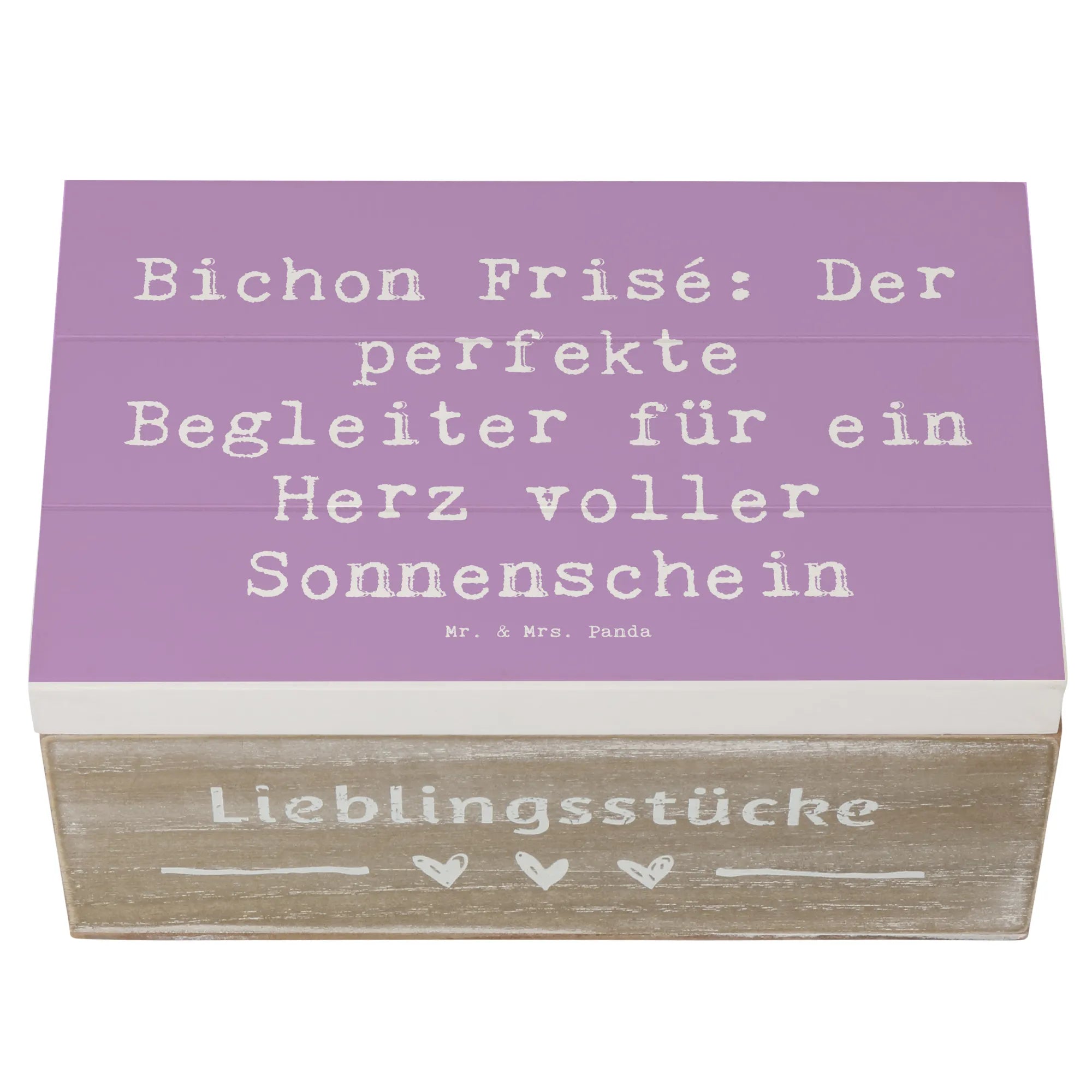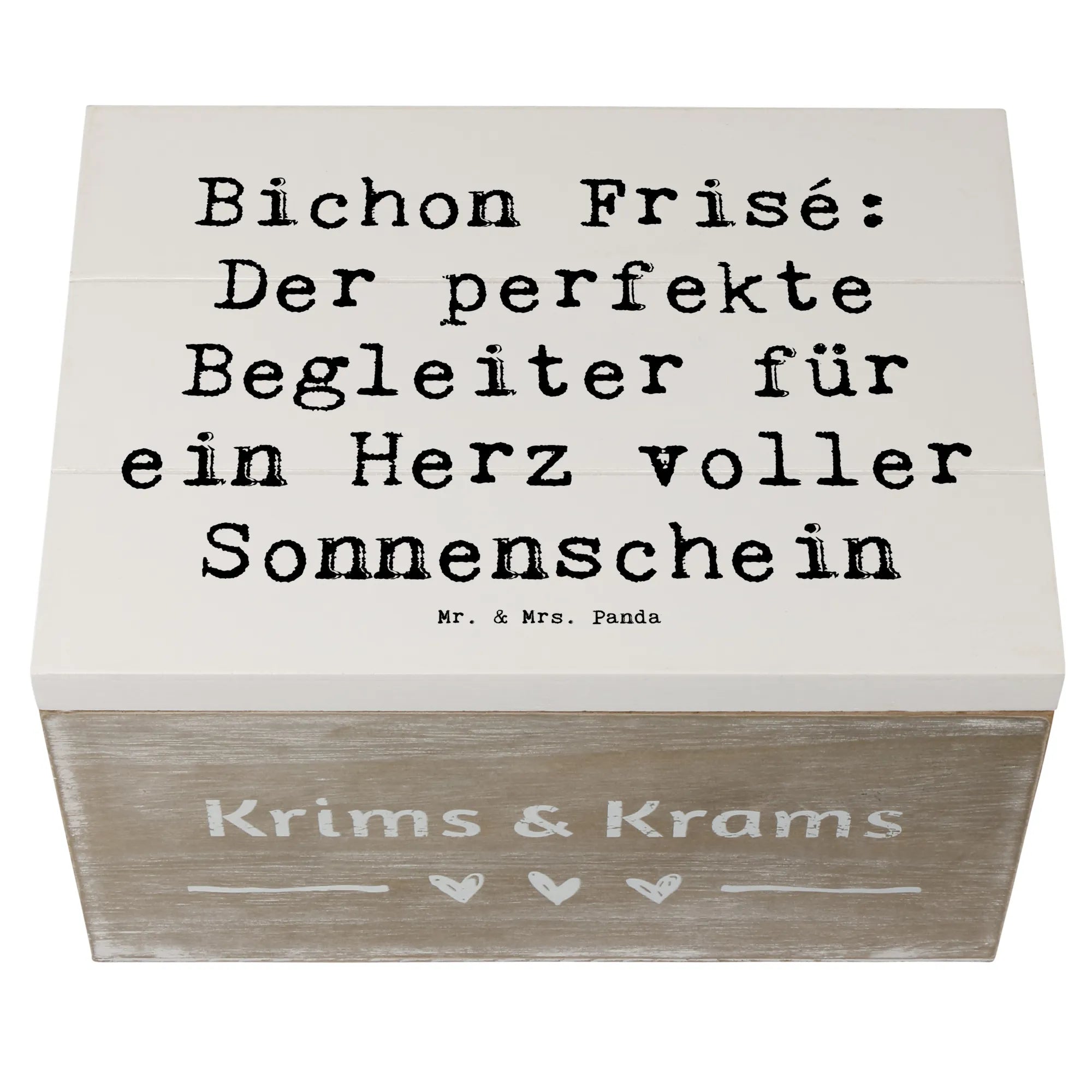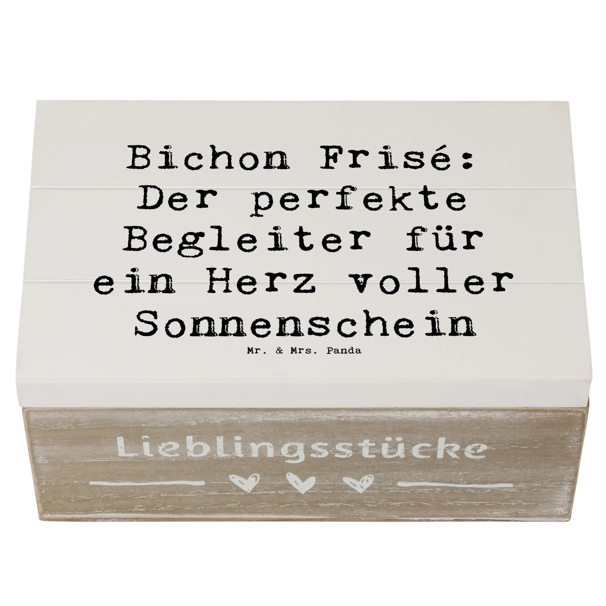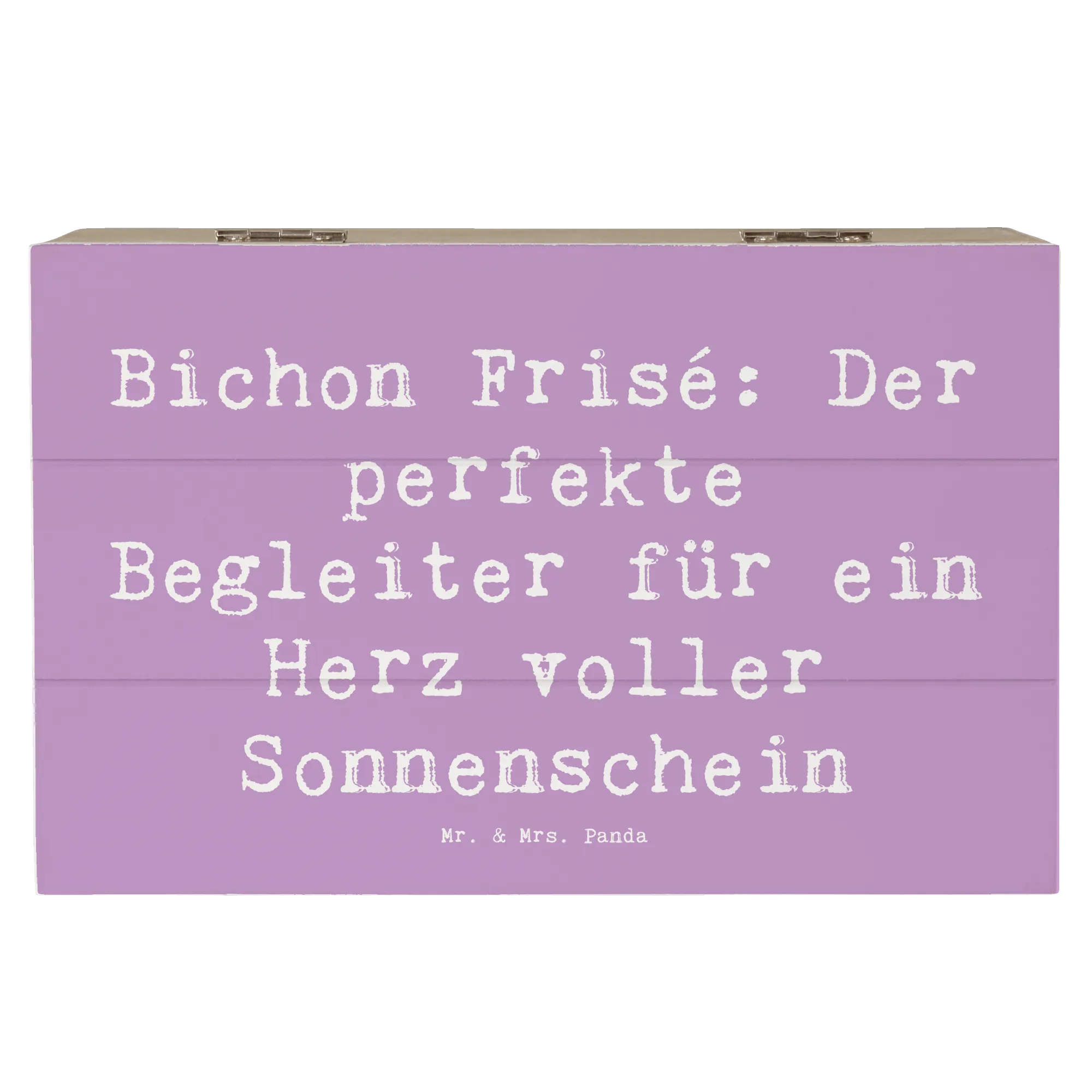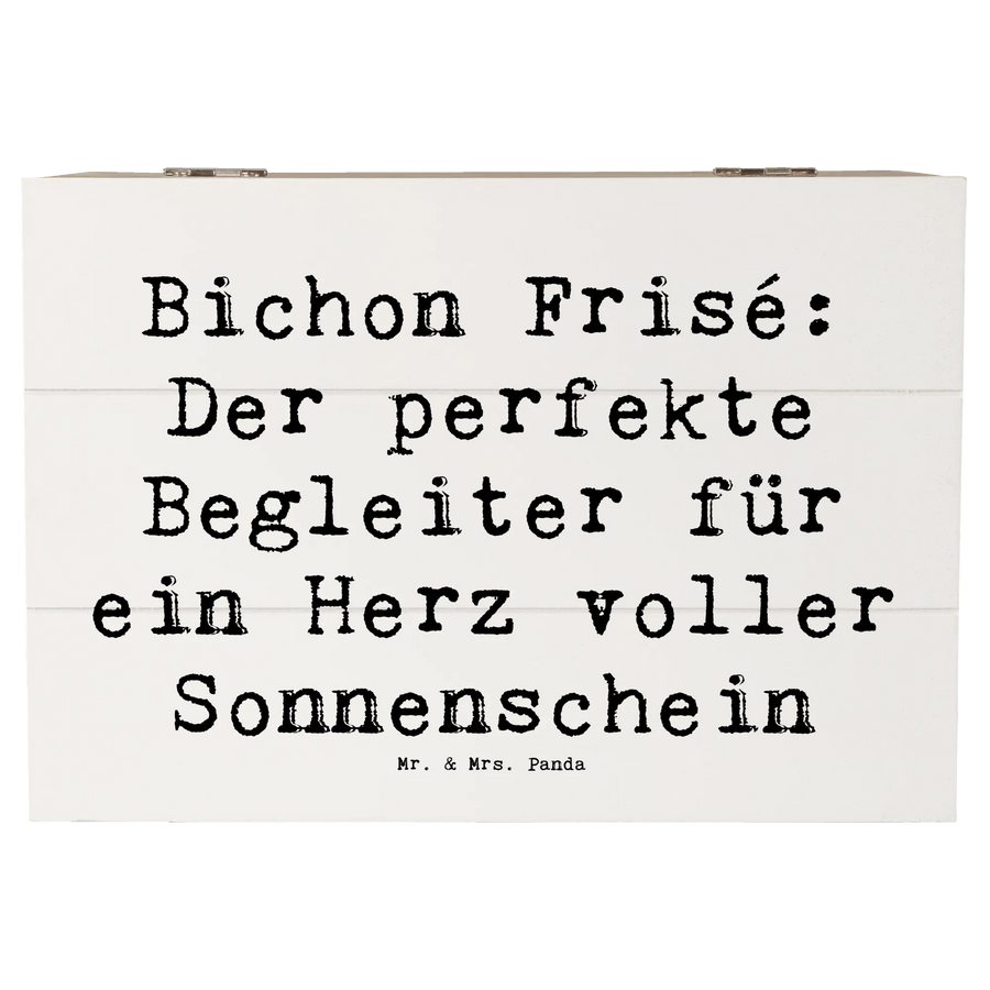 Jeder Hundefan wird die Botschaft auf der Kiste lieben: "Bichon Frisé: Der perfekte Begleiter für ein Herz voller Sonnenschein." Dieser liebevolle Spruch drückt die besondere Verbindung zu diesen fröhlichen Vierbeinern aus, die uns jeden Tag ein Lächeln ins Gesicht zaubern.