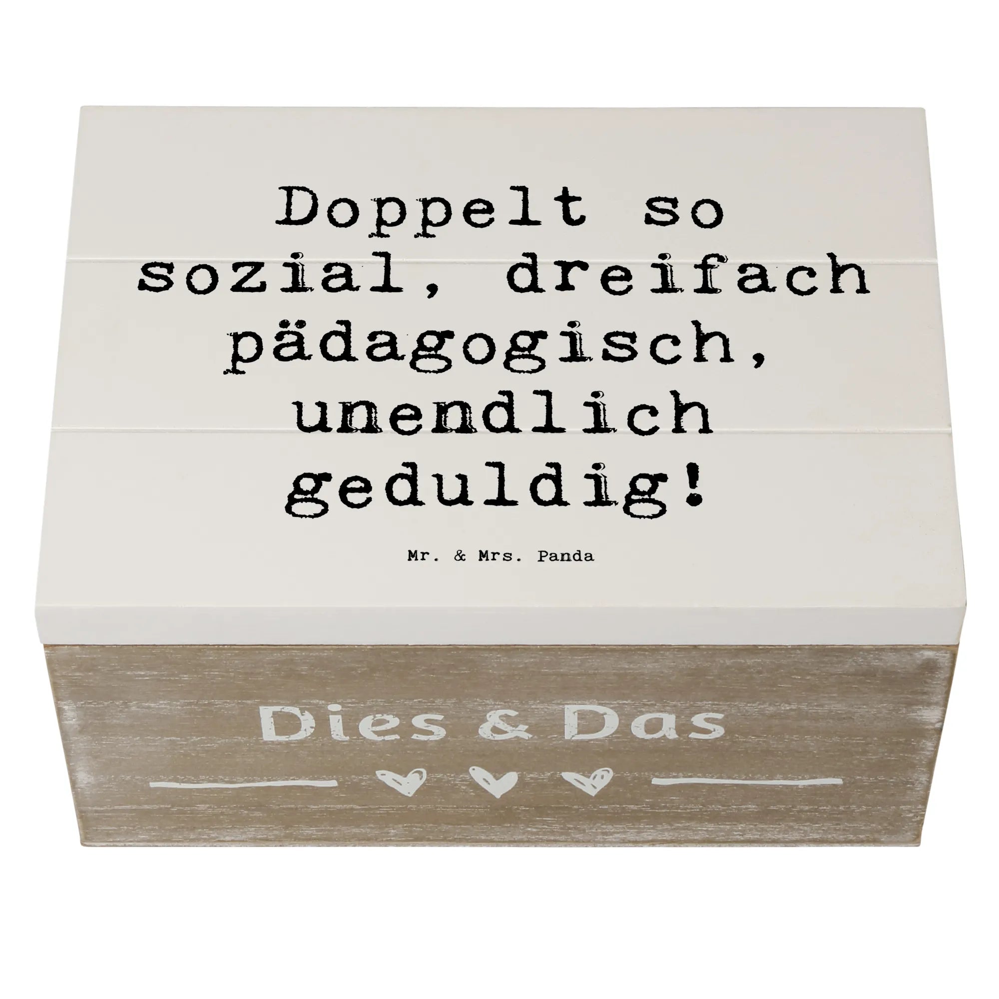 Entdecke die wunderschöne Holzkiste von Mr. & Mrs. Panda, die speziell für Sozialpädagogen entworfen wurde! Diese besondere Kiste ist nicht nur ein stilvolles Aufbewahrungselement, sondern auch ein liebevolles Geschenk, das die Leidenschaft und den Einsatz von Fachleuten in diesem wichtigen Beruf feiert. Mit der liebevollen Aufschrift "Doppelt so sozial, dreifach pädagogisch, unendlich geduldig!" bringt diese Kiste Freude in jedes Zuhause und eignet sich perfekt als Erinnerungskiste für besondere Anlässe.