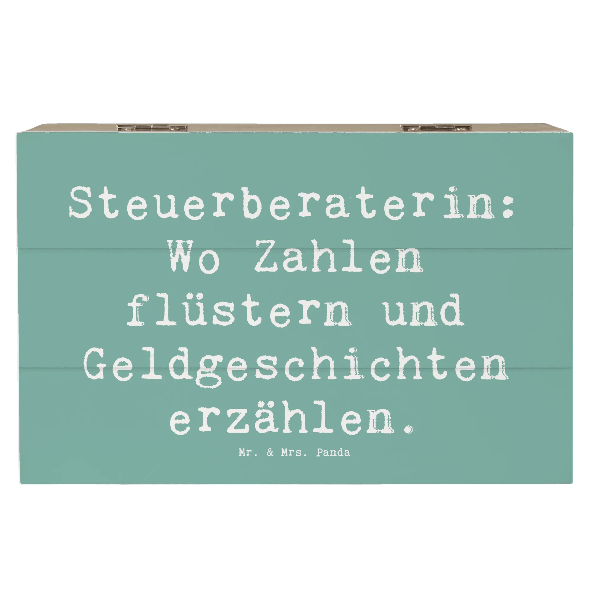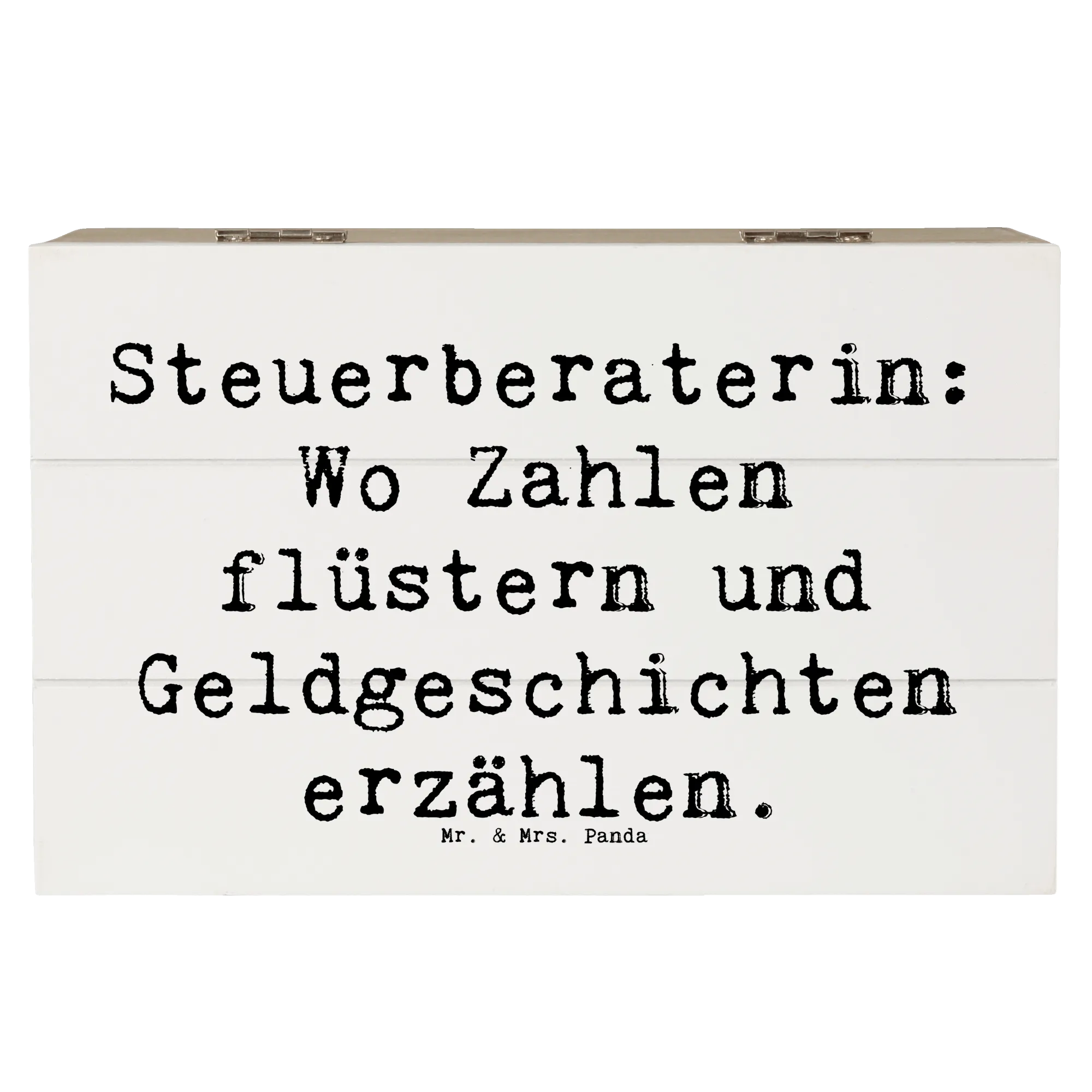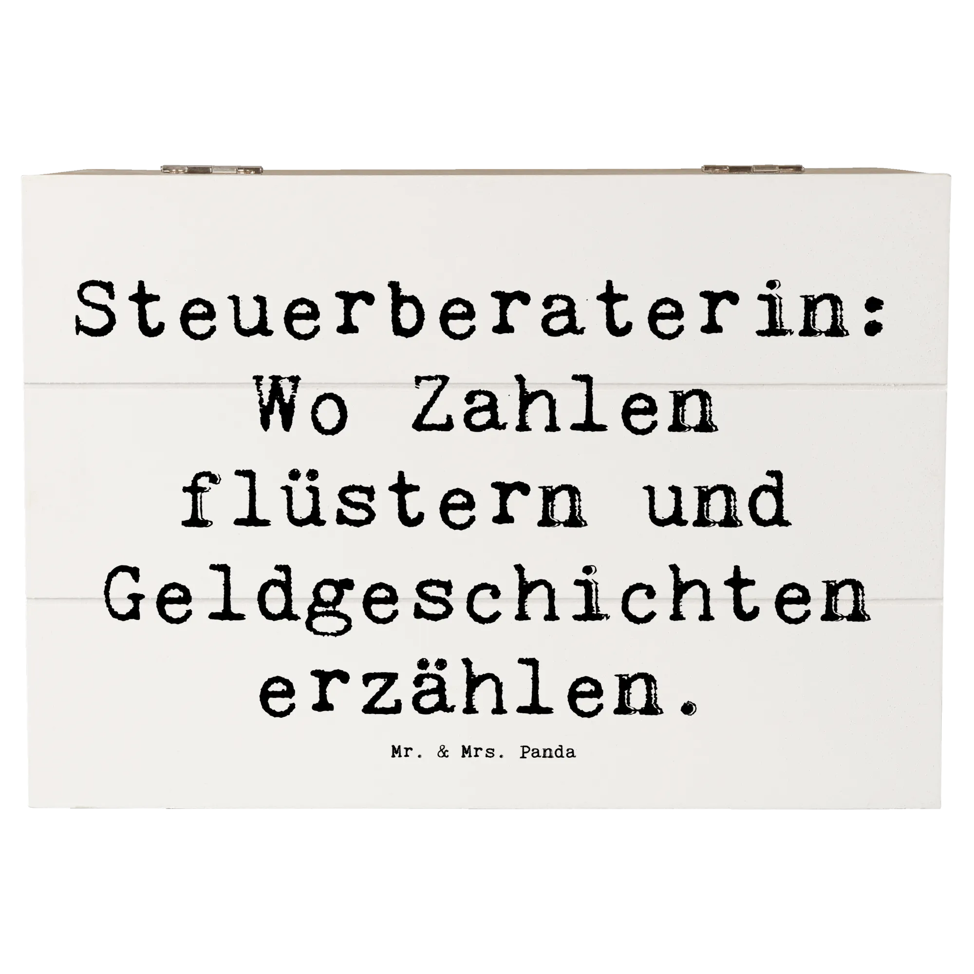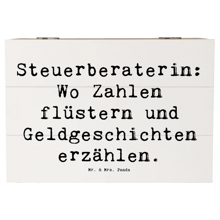 Die wunderschöne Holzkiste mit dem Motiv "Steuerberaterin: Wo Zahlen flüstern und Geldgeschichten erzählen" von Mr. & Mrs. Panda ist das perfekte Geschenk für alle Steuerberaterinnen und Zahlenliebhaberinnen! Diese liebevoll gestaltete Erinnerungskiste eignet sich wunderbar als Aufbewahrungsort für ganz besondere Schätze. Egal, ob Du Fotos, kleine Erinnerungsstücke oder vielleicht auch Dekorationen aufbewahren möchtest, diese Schatzkiste ist einfach ideal dafür.