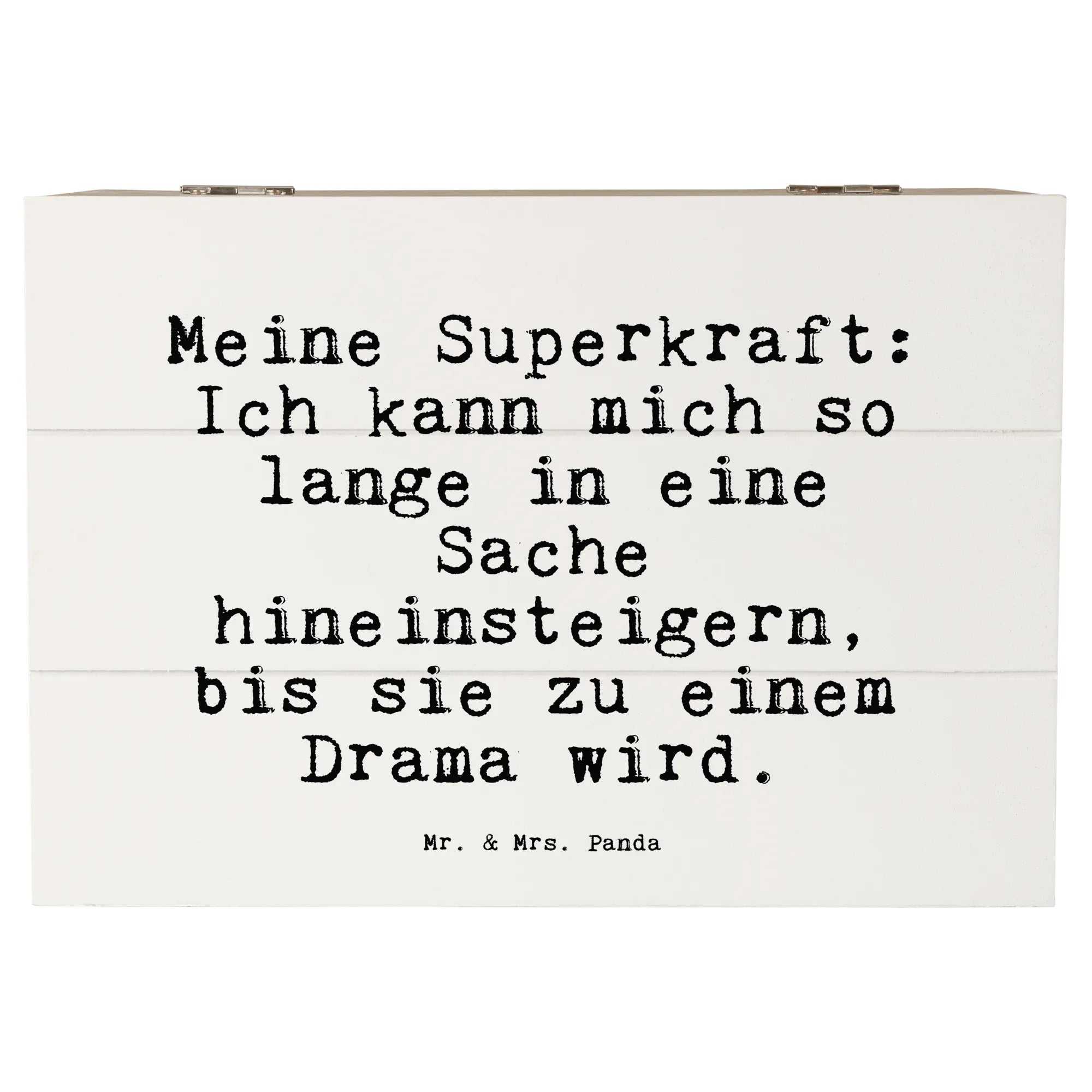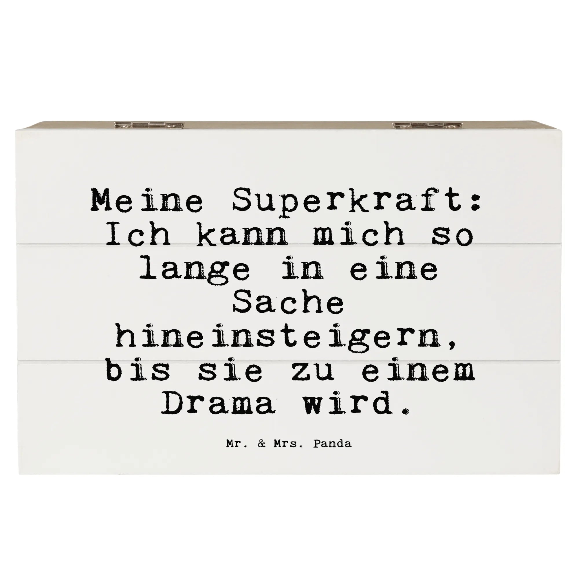 Die wunderschöne Holzkiste von Mr. & Mrs. Panda ist das perfekte Geschenk für all jene, die ihre wertvollen Erinnerungen, Schätze oder besondere Momente stilvoll aufbewahren möchten. Mit dem lustigen Spruch 'Meine Superkraft: Ich kann mich so lange in eine Sache hineinsteigern, bis sie zu einem Drama wird.' auf der Kiste, ist sie nicht nur ein nützliches Aufbewahrungsobjekt, sondern auch ein absoluter Hingucker!