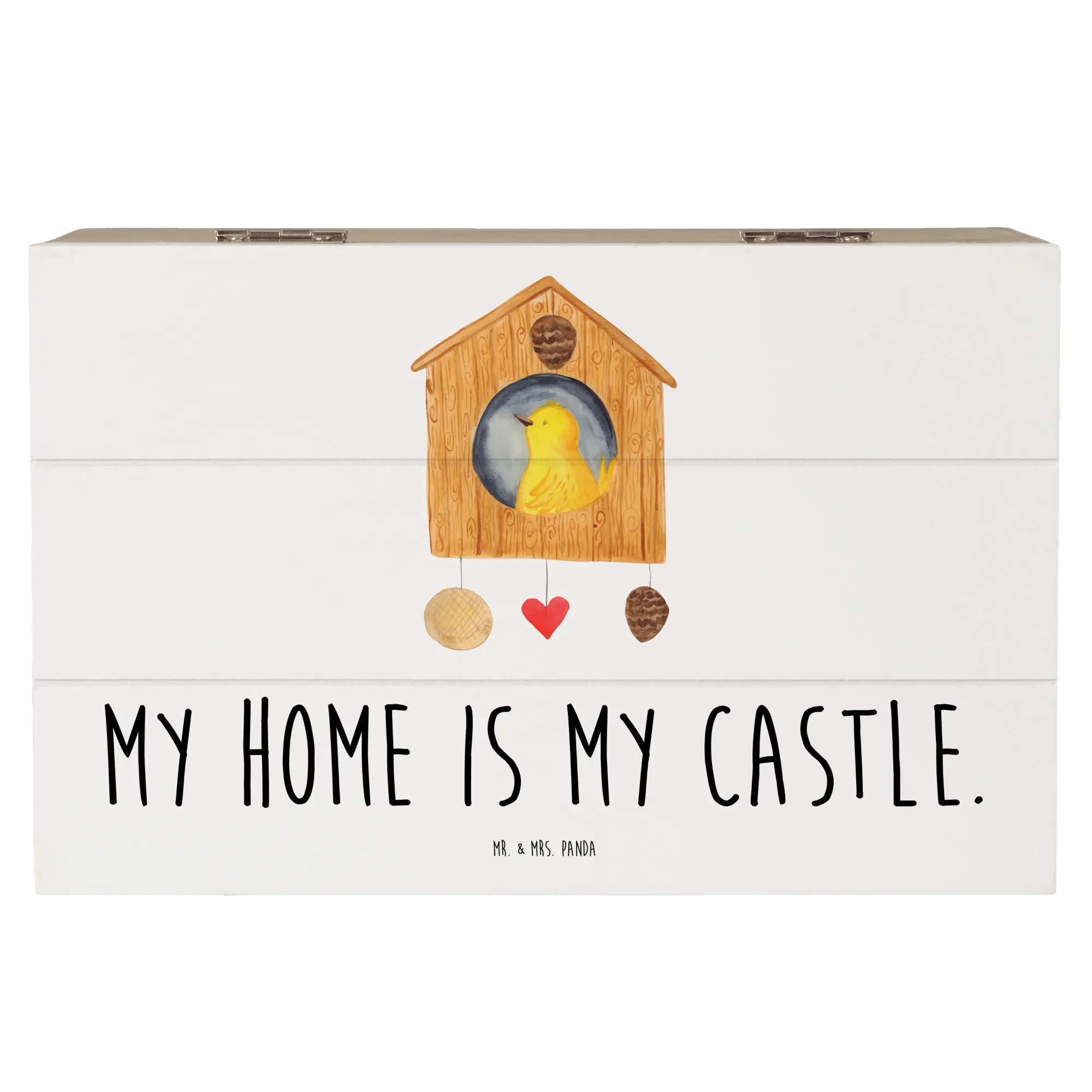 Die wunderschöne Holzkiste mit dem zauberhaften Motiv "Vogelhaus" aus der Small World Kollektion von Mr. & Mrs. Panda ist das ideale Geschenk für alle, die ihr Zuhause mit einem liebevollen Akzent versehen möchten. Diese einzigartige Kiste zeigt einen gelben Vogel, der glücklich in seinem Vogelhaus sitzt und den Slogan "My home is my castle." trägt.