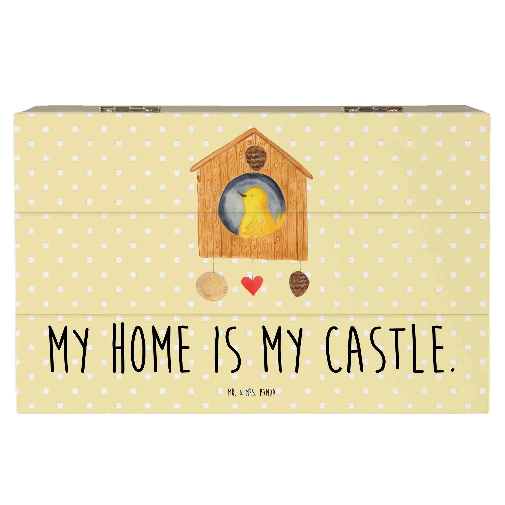 Die Aufbewahrungsbox ist nicht nur praktisch, sondern auch mit einem liebevoll gestalteten Motiv bebildert: Ein gelber Vogel sitzt glücklich in seinem Vogelhaus und verkörpert den Spruch „My home is my castle“. Diese Kiste eignet sich optimal für festliche Anlässe oder als Deko für dein Zuhause.
