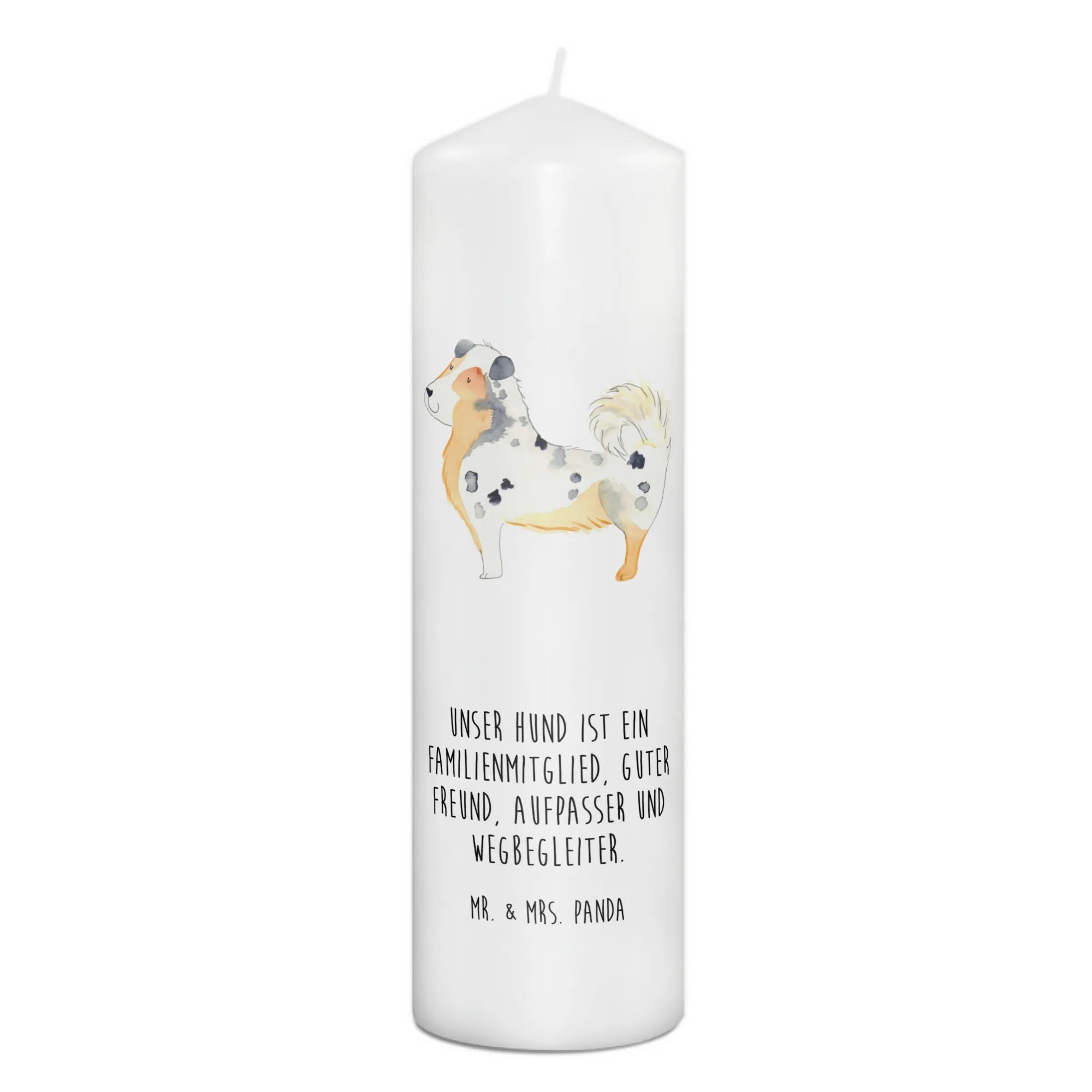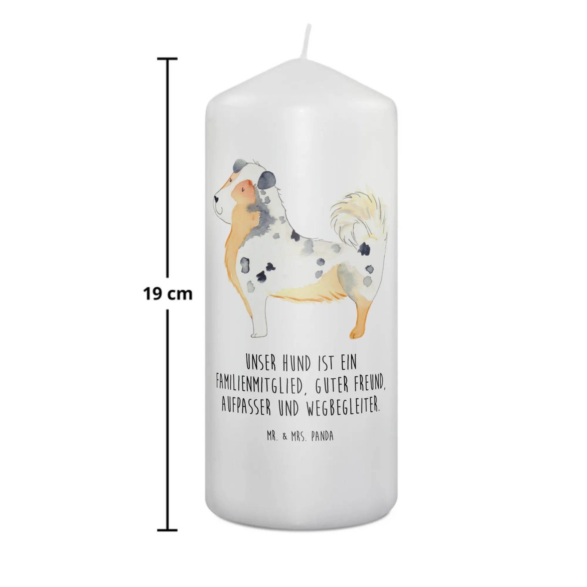 Entdecke die liebevolle Kerze mit dem bezaubernden Motiv des Australian Shepherds aus der Hunde Kollektion von Mr. & Mrs. Panda! Diese edle und wunderschöne Kerze ist nicht nur ein echter Blickfang, sie bringt auch Wärme und Geborgenheit in dein Zuhause. Ideal als Taufkerze, Kommunionskerze oder Geburtstagskerze, begeistert sie Tierliebhaber und Hundebesitzer gleichermaßen. Der Spruch "Unser Hund ist ein Familienmitglied, guter Freund, Aufpasser und Wegbegleiter" bringt die Bindung und die Liebe, die wir zu unseren vierbeinigen Freunden empfinden, perfekt auf den Punkt.