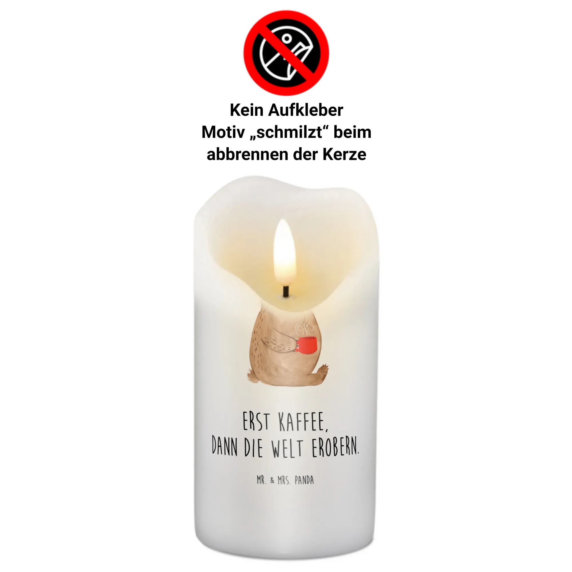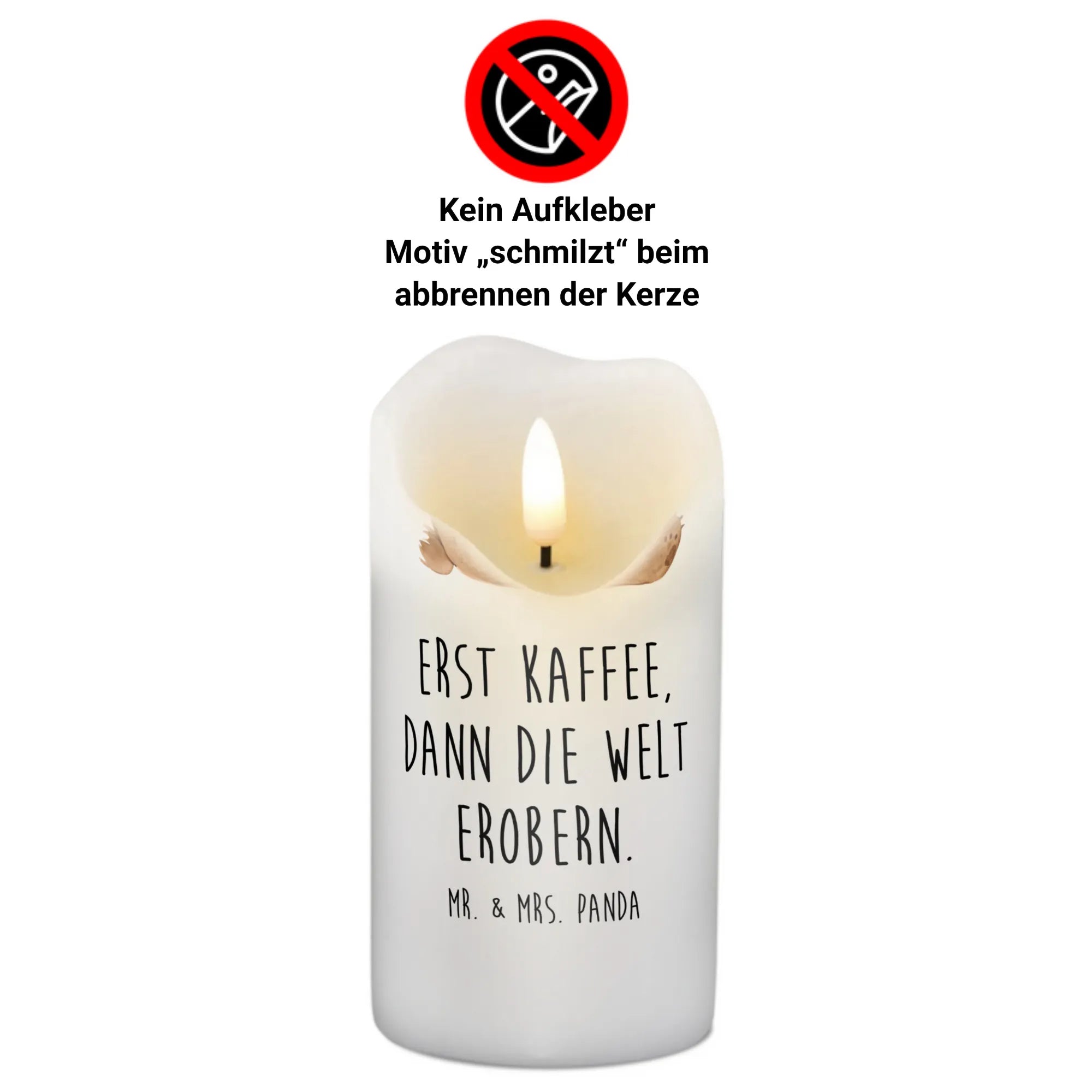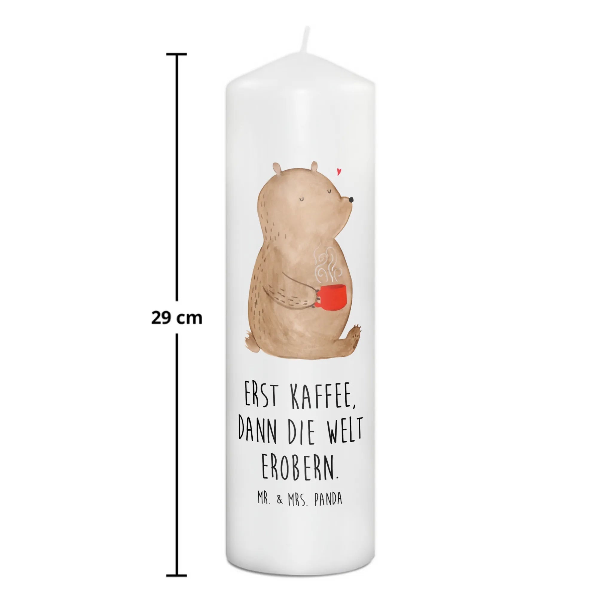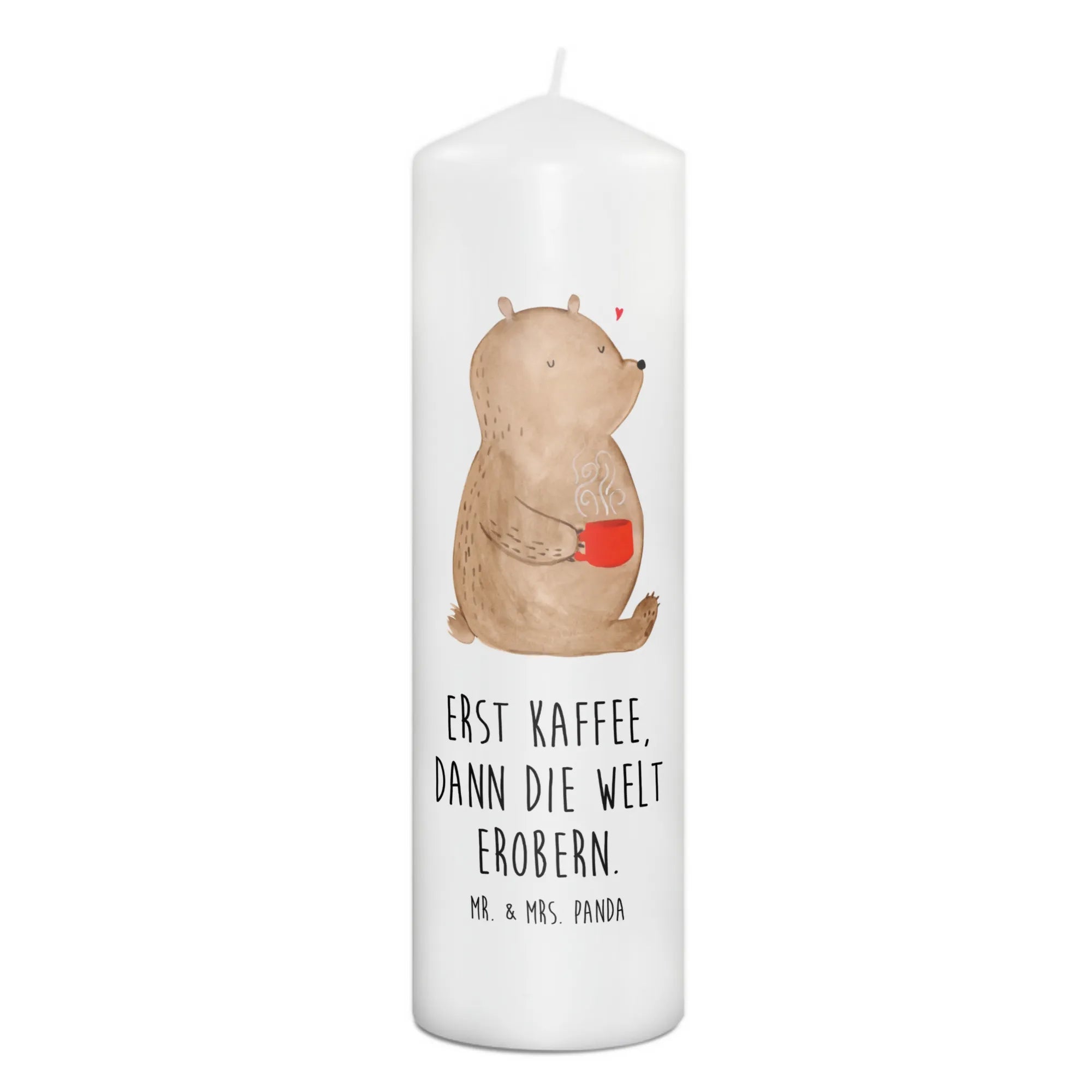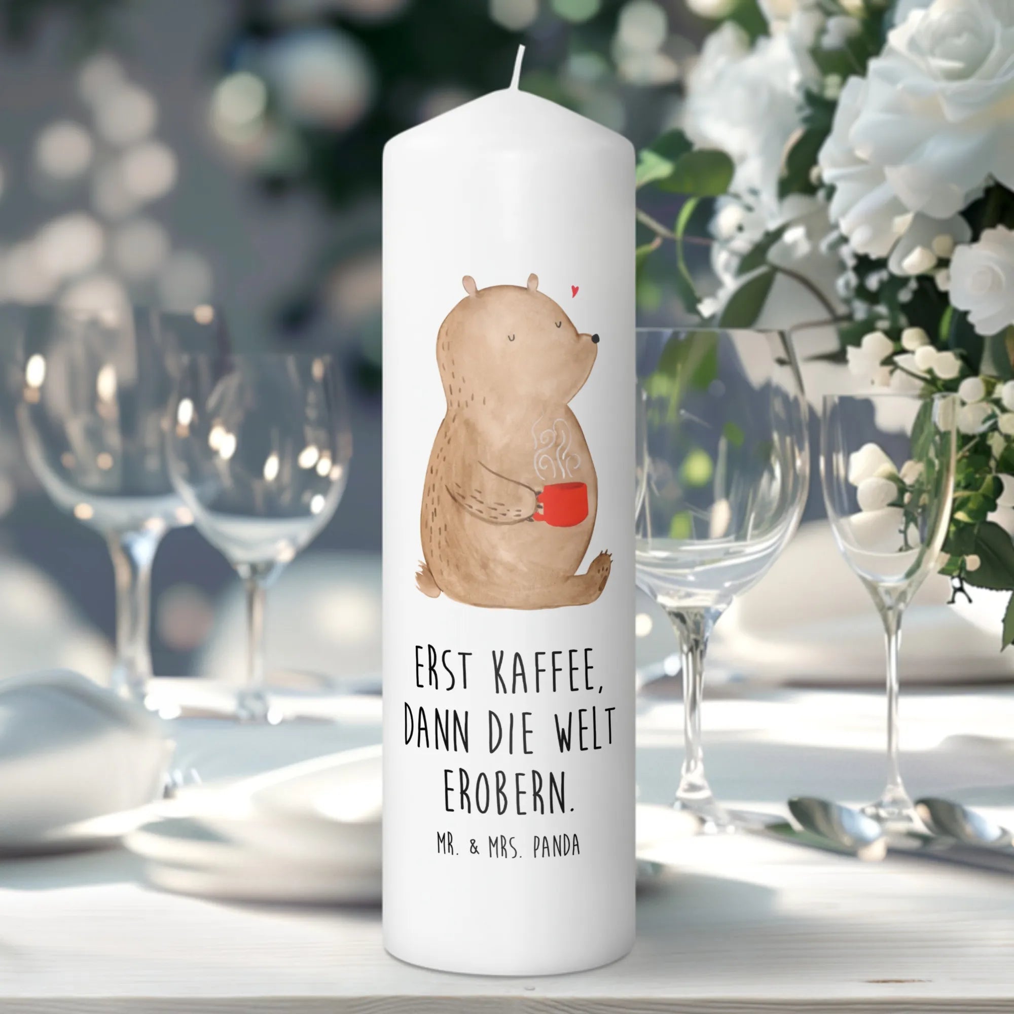 Die bezaubernde Kerze aus dem Hause Mr. & Mrs. Panda ist nicht nur ein wahres Kunstwerk, sondern auch das perfekte Geschenk für jeden Anlass! Mit ihrem süßen Motiv eines kleinen Bären, der genussvoll seine Tasse Kaffee hebt, und dem charmanten Spruch "Erst Kaffee, dann die Welt erobern" wird diese Taufkerze, Kommunionskerze oder Geburtstagskerze schnell zum Highlight in jedem Raum.