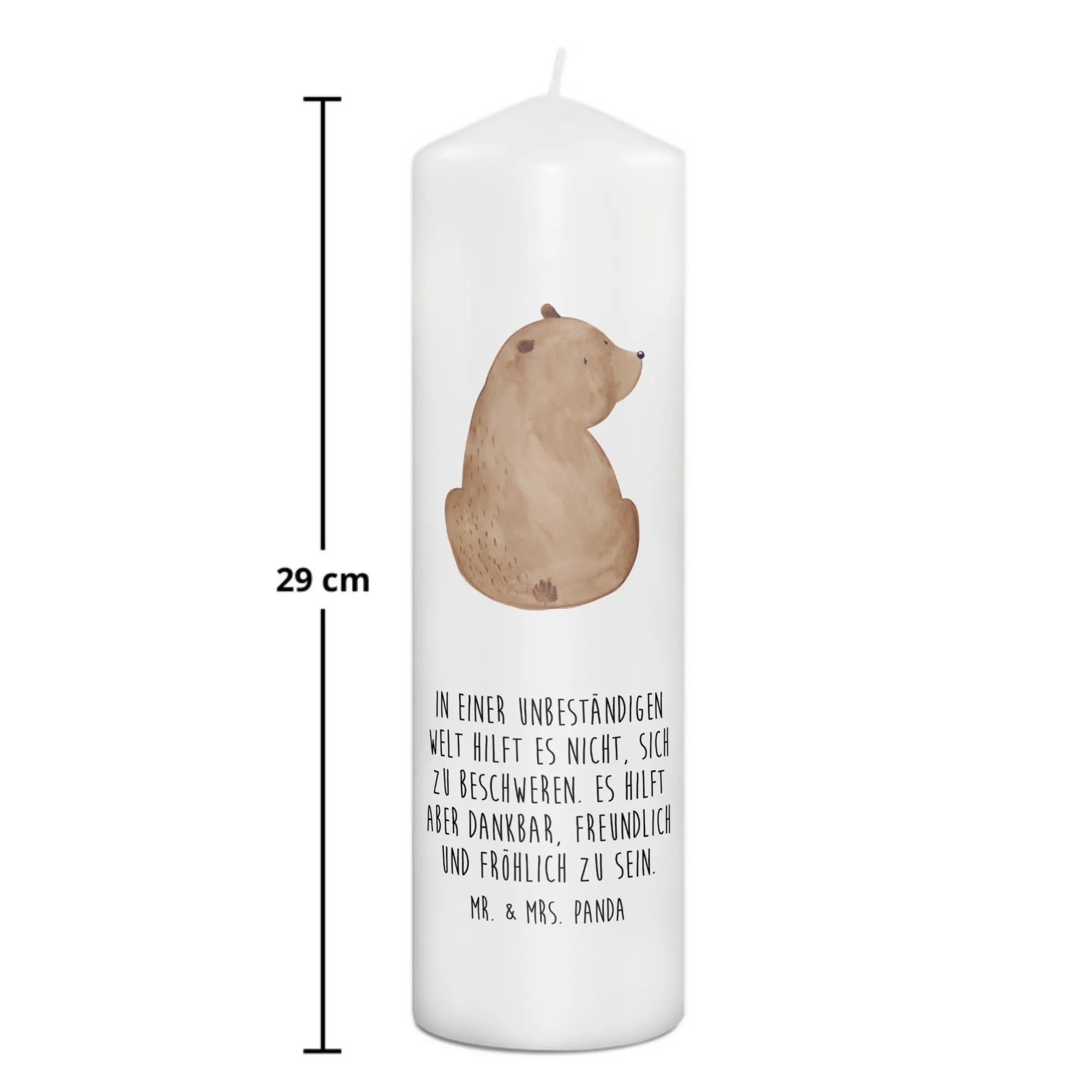 Sie misst 29 cm in der Höhe und hat einen Durchmesser von 8 cm – ideal für jedes Wohnzimmer oder die stolze Präsentation auf einem festlich gedeckten Tisch. Das niedliche Bärenmotiv schmilzt dabei beim Abbrennen der Kerze ganz sanft und begleitet Dich auf deinem Weg durch besondere Lebensabschnitte.