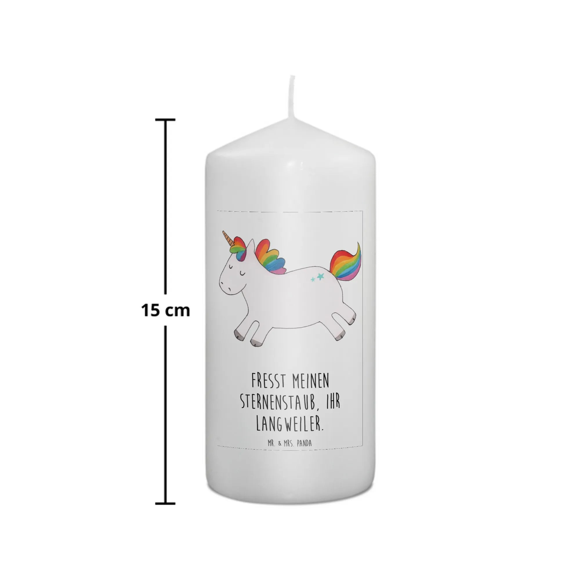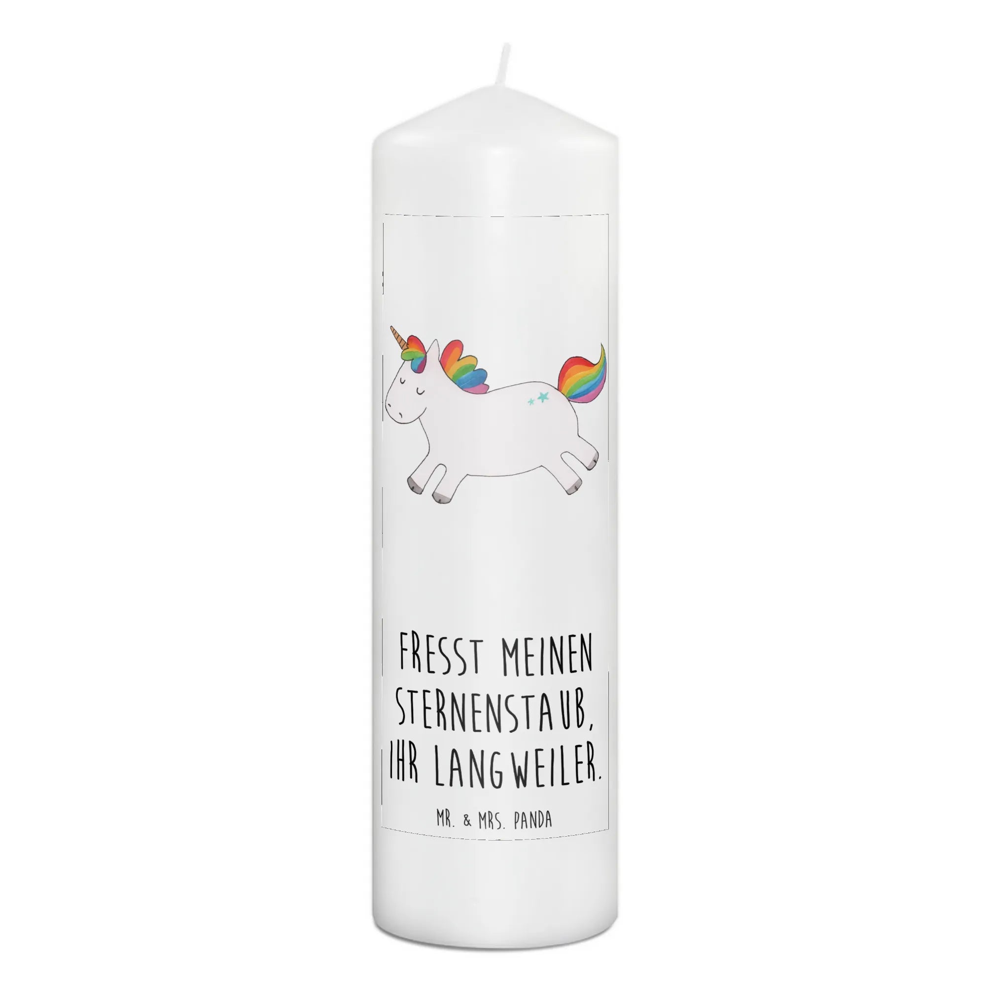Die zauberhafte Kerze Einhorn Happy aus der Einhorn-Kollektion von Mr. & Mrs. Panda ist das perfekte Geschenk für alle, die Freude und Glück in ihr Leben bringen möchten. Mit ihrem liebevoll gestalteten Motiv eines fröhlichen Einhorns mit Regenbogen-Mähne versprüht diese Kerze Lebensfreude und macht jeden Raum ein kleines Stück bunter. Egal ob zu besonderen Anlässen wie Geburtstagen, Taufen oder Kommunionen – diese Kerze ist ein liebevolles Geschenk, das in jedem Herzen ein Lächeln hervorruft. Der Spruch 'Fresst meinen Sternenstaub, ihr Langweiler.' macht sie zu einem witzigen und originellen Präsent.