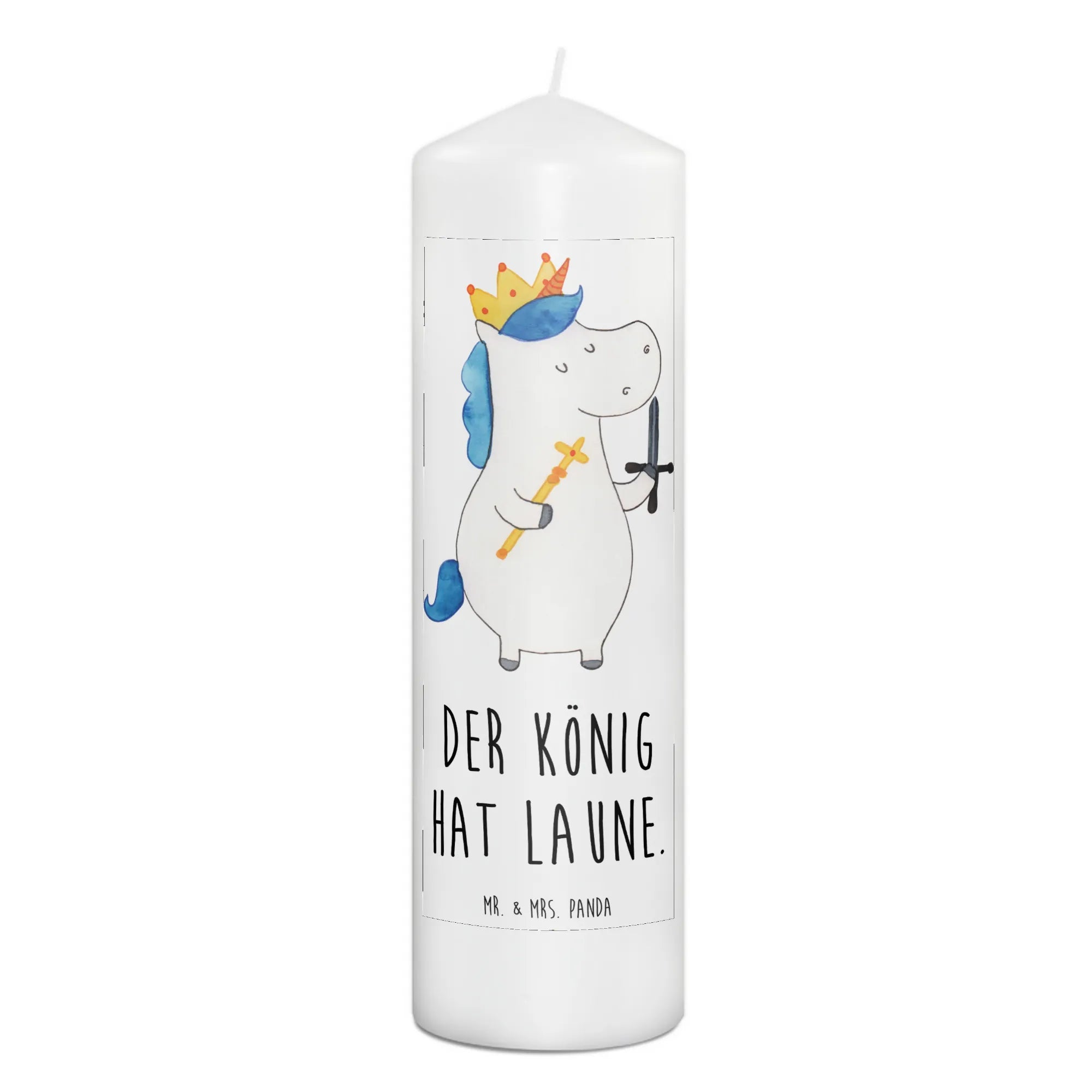 Ein süßes Einhorn mit einer goldenen Krone und einem Schwert in der Hand strahlt pure Freude und Besonderheit aus. Zudem trägt die Kerze den charmanten Spruch "Der König hat Laune", der für eine fröhliche Atmosphäre sorgt.
