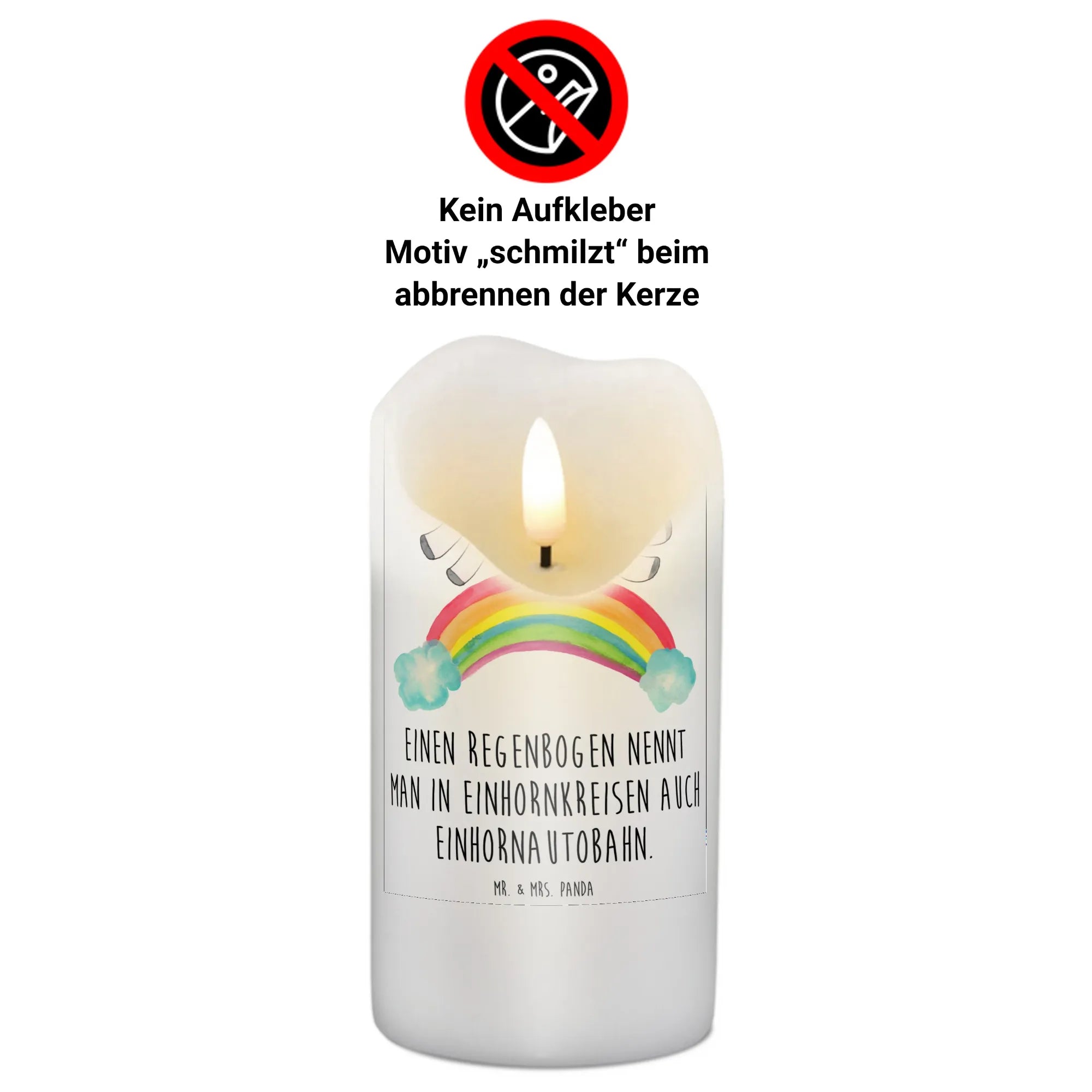 Der Spruch 'Einen Regenbogen nennt man in Einhornkreisen auch Einhornautobahn' verleiht der Kerze einen magischen Touch, perfekt für kleine und große Einhorn-Fans.