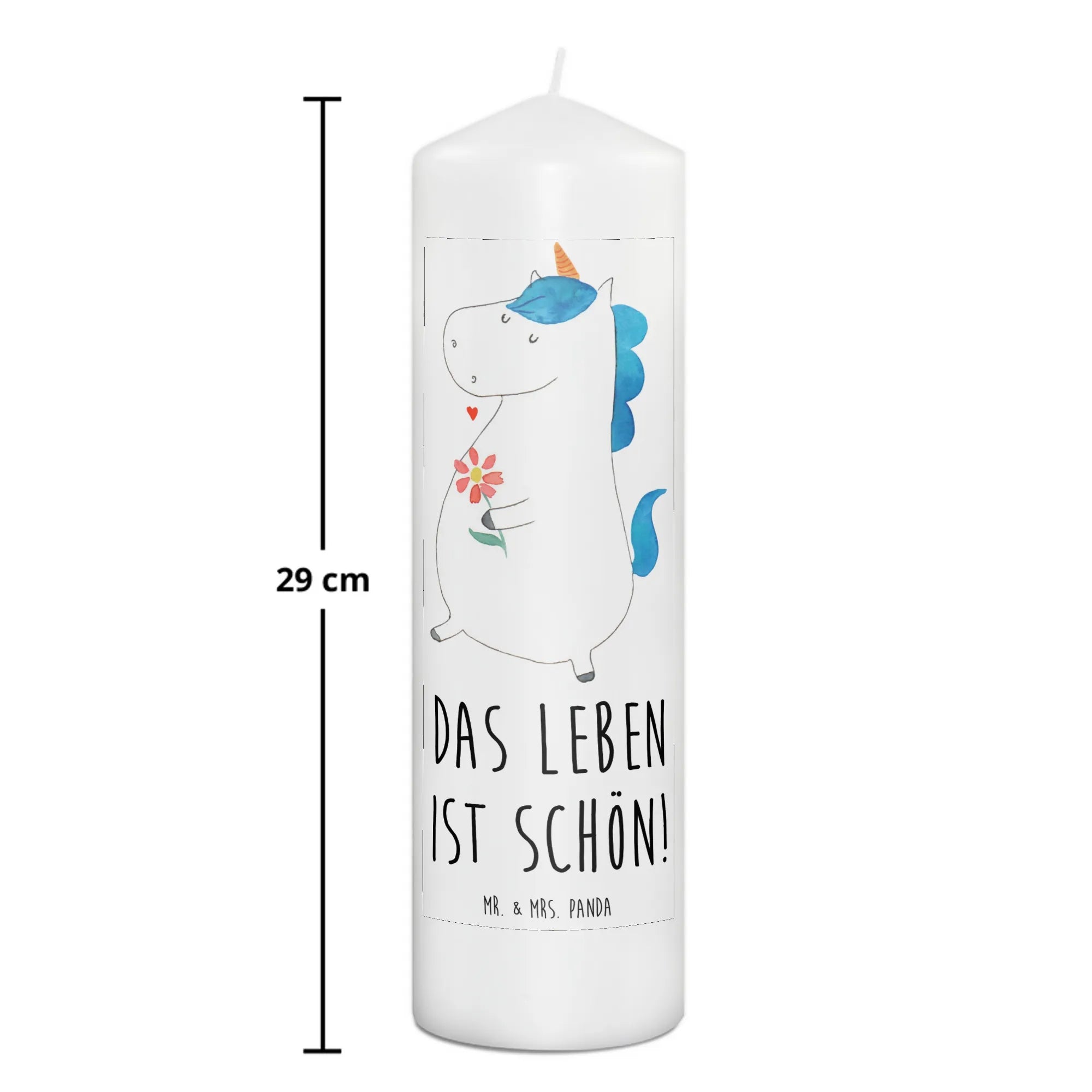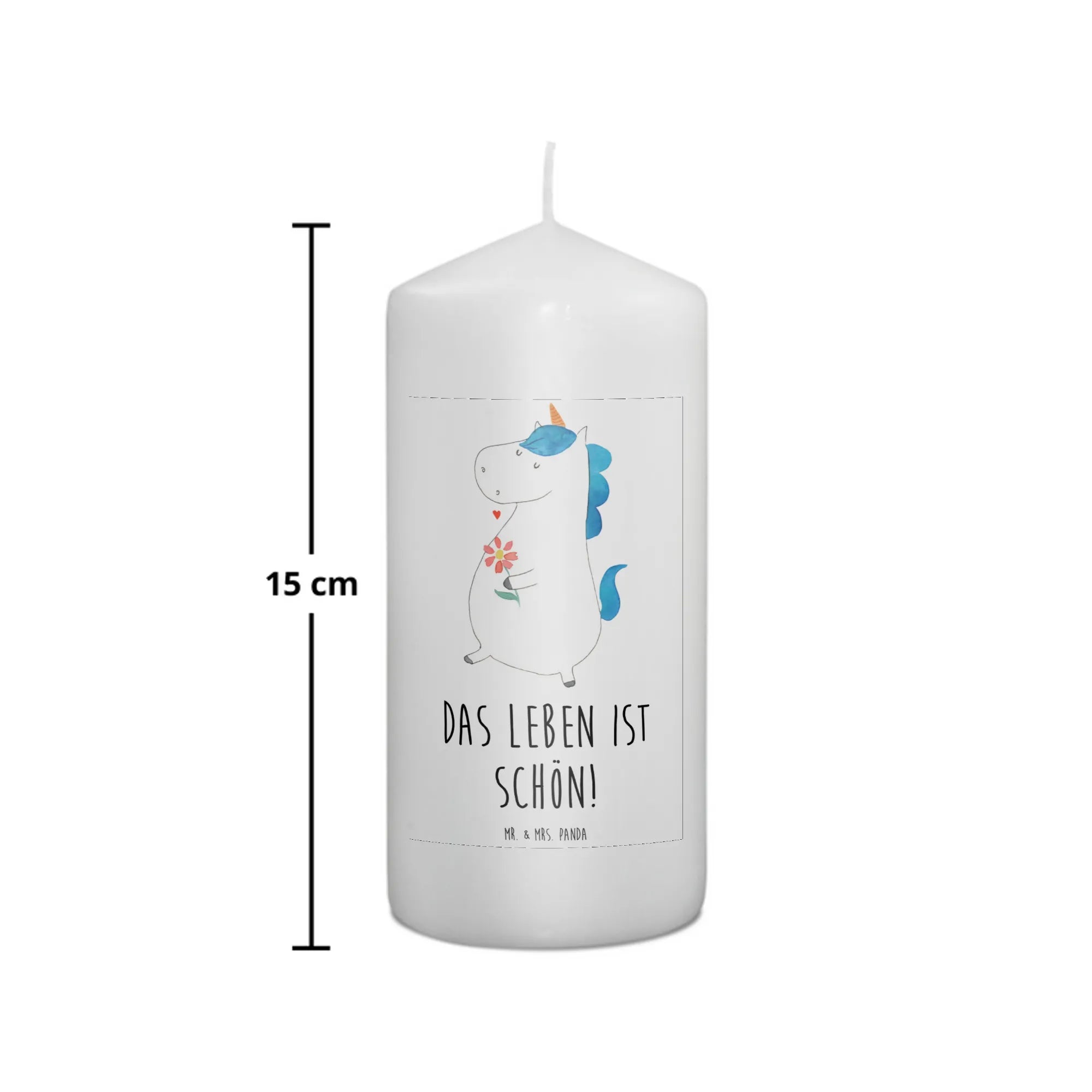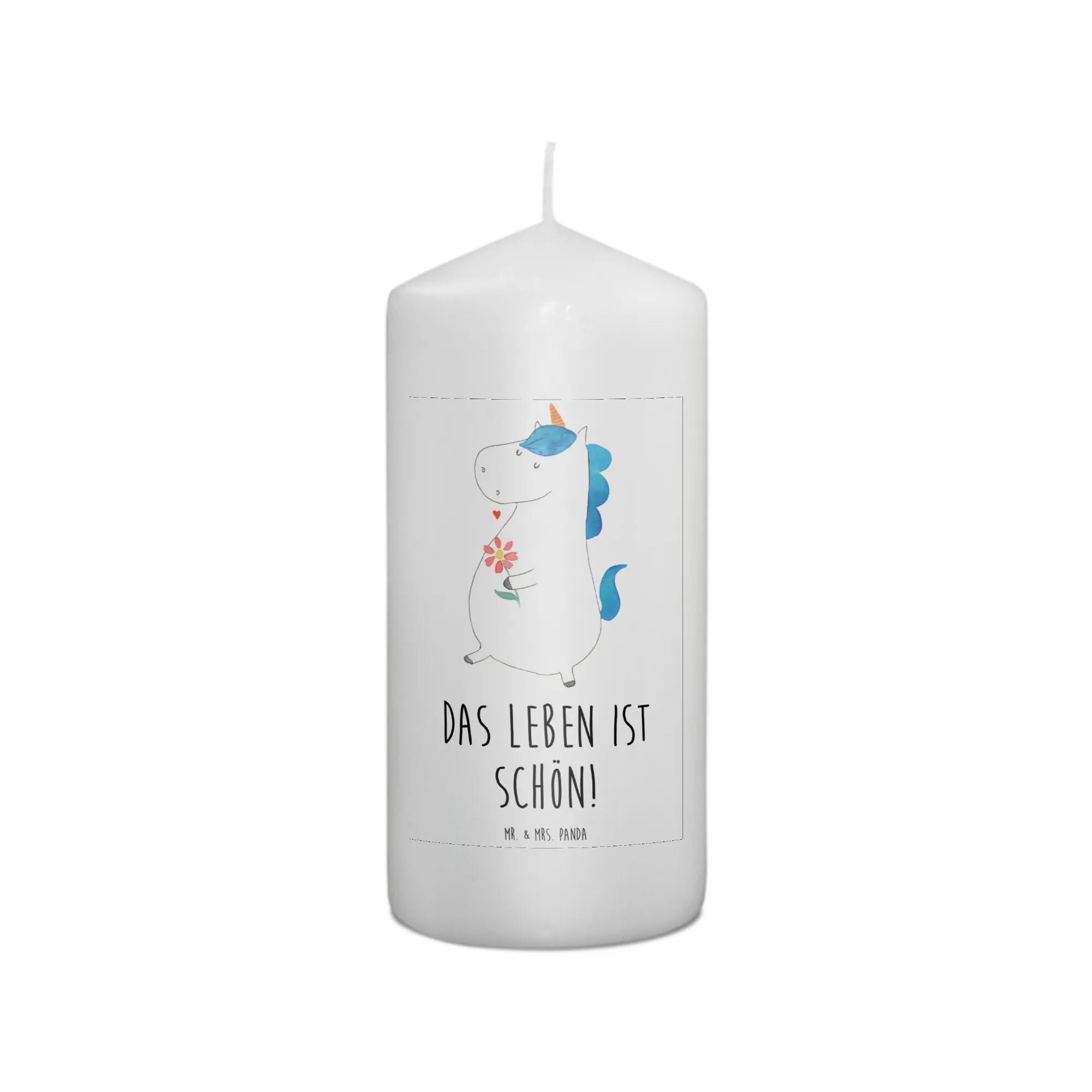 Das liebevoll gestaltete Motiv zeigt ein glückliches Einhorn, das mit einer Blume in der Hand einen angenehmen Spaziergang genießt. Handgezeichnet von Mrs. Panda, vereint diese Kerze Kunst und Funktionalität auf eine unvergessliche Weise.