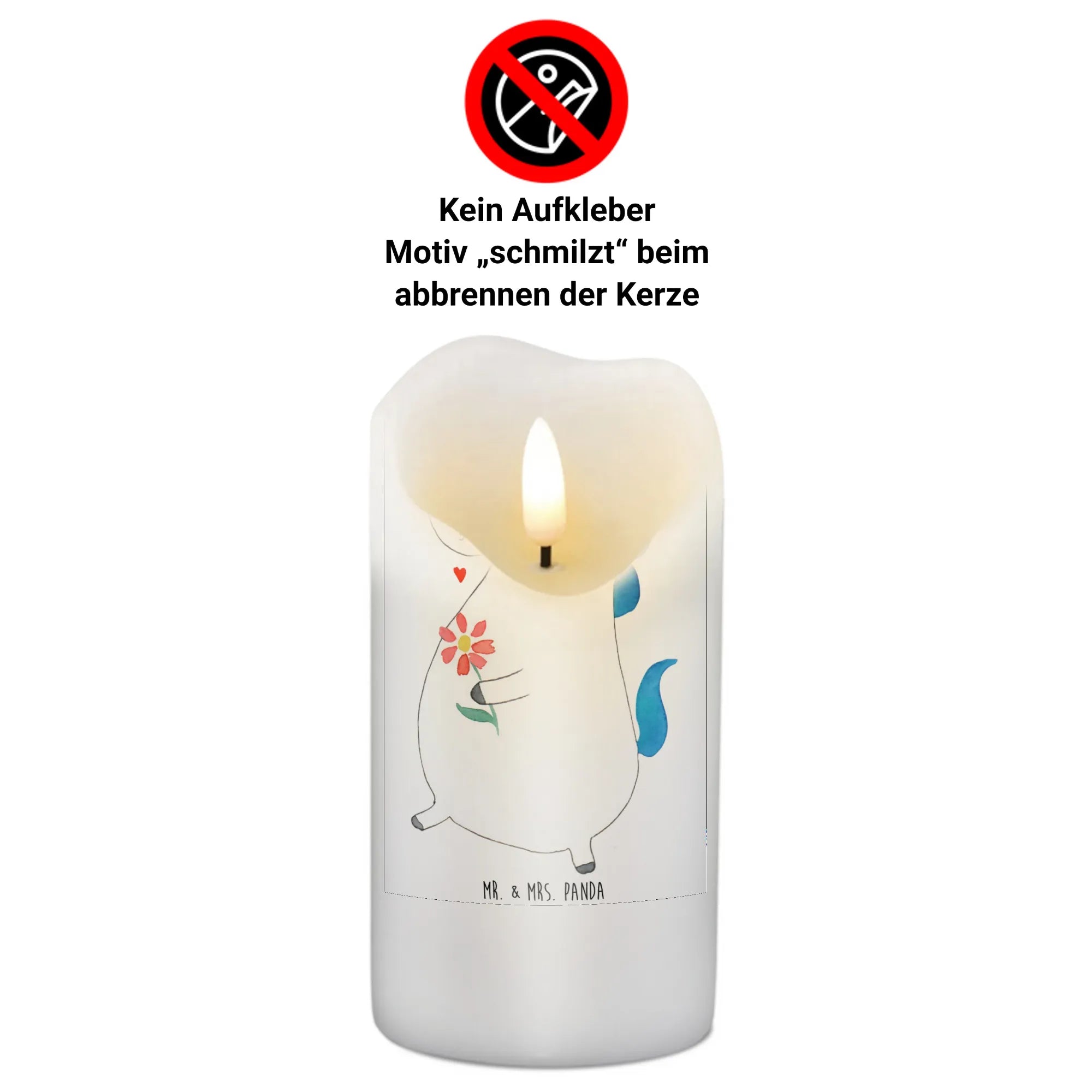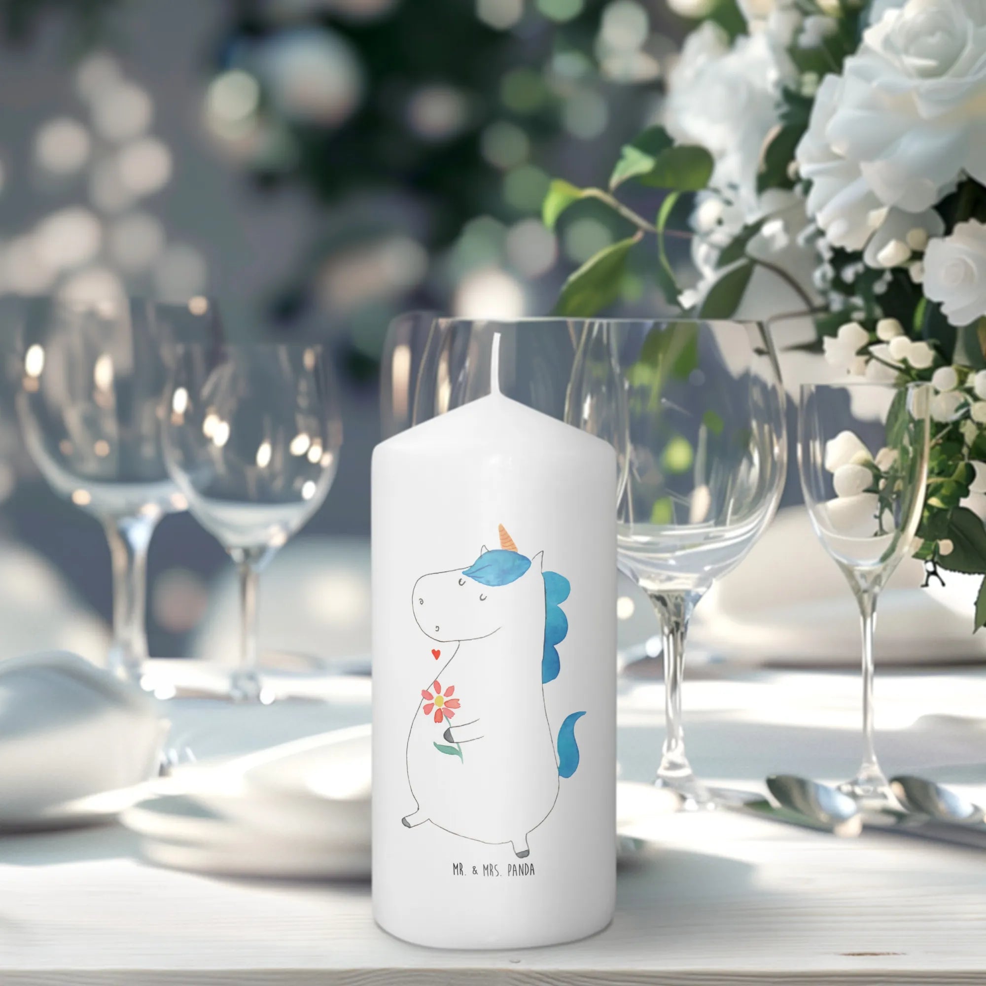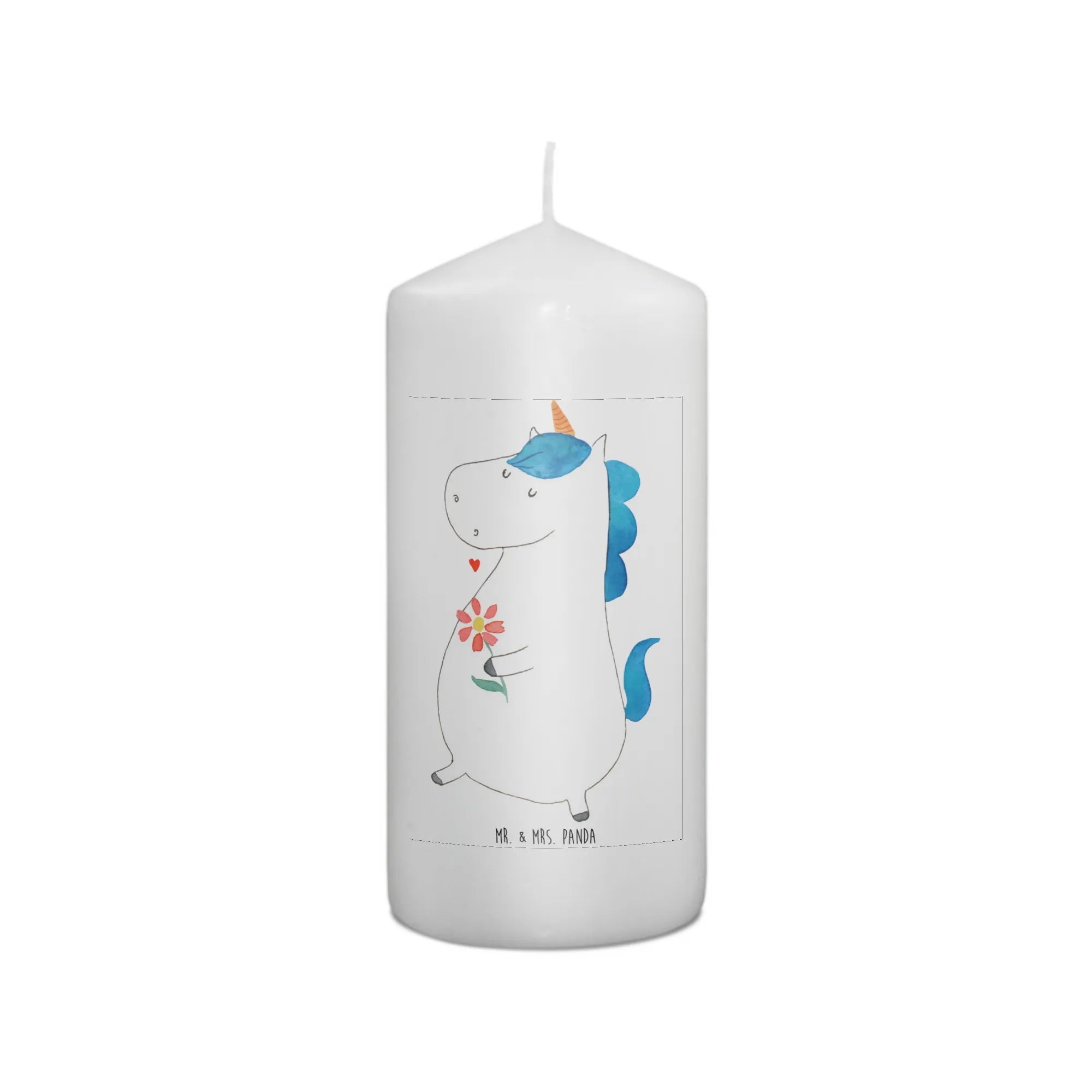Das liebevoll gestaltete Motiv zeigt ein glückliches Einhorn, das mit einer Blume in der Hand einen angenehmen Spaziergang genießt. Handgezeichnet von Mrs. Panda, vereint diese Kerze Kunst und Funktionalität auf eine unvergessliche Weise.
